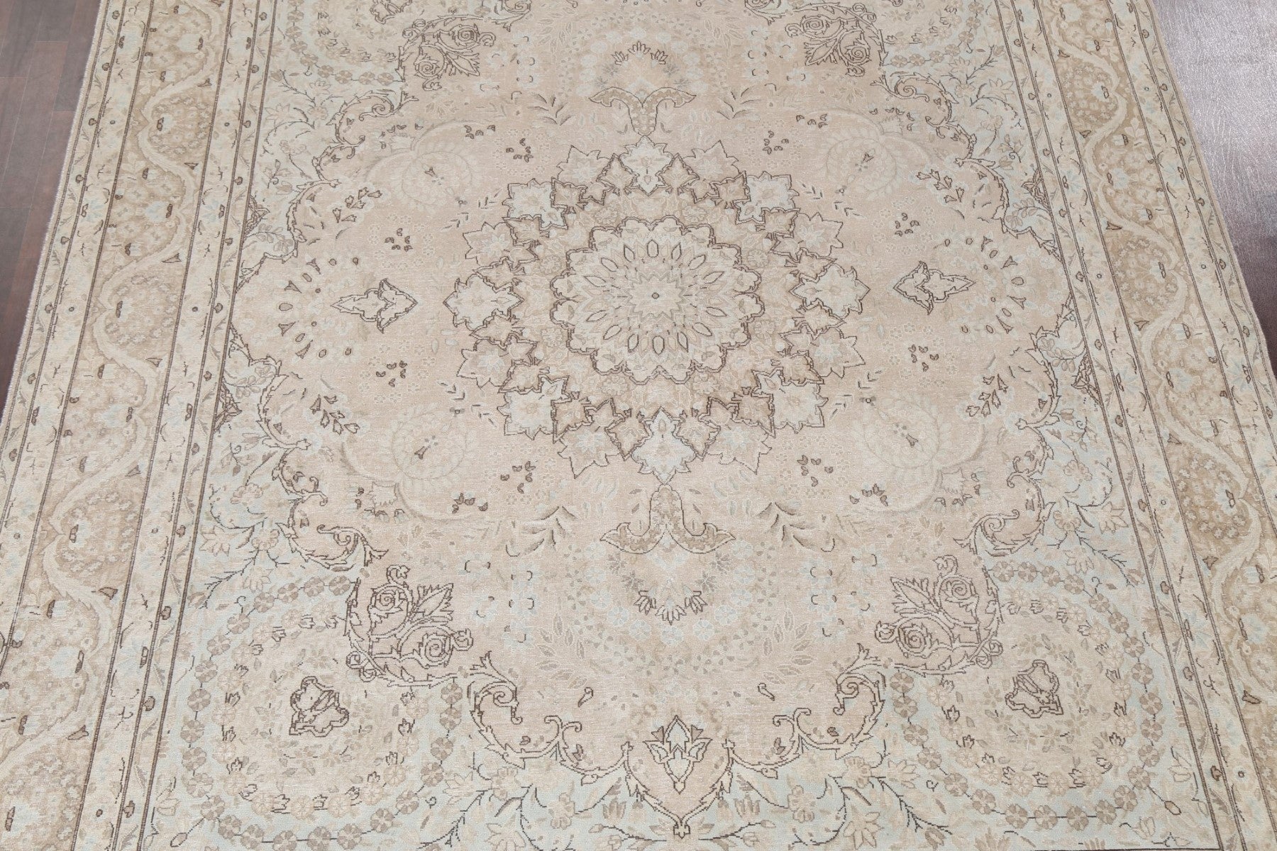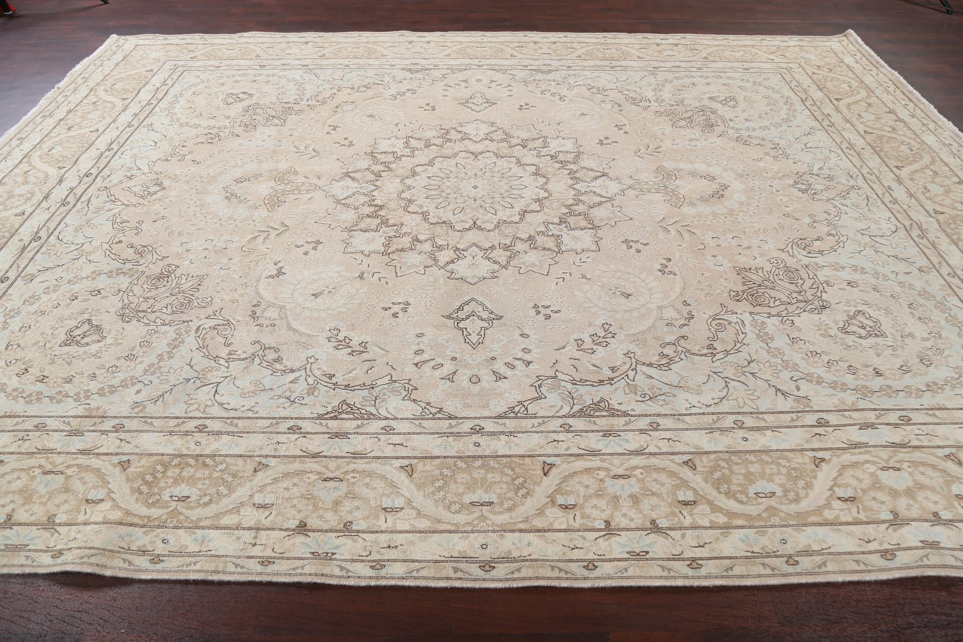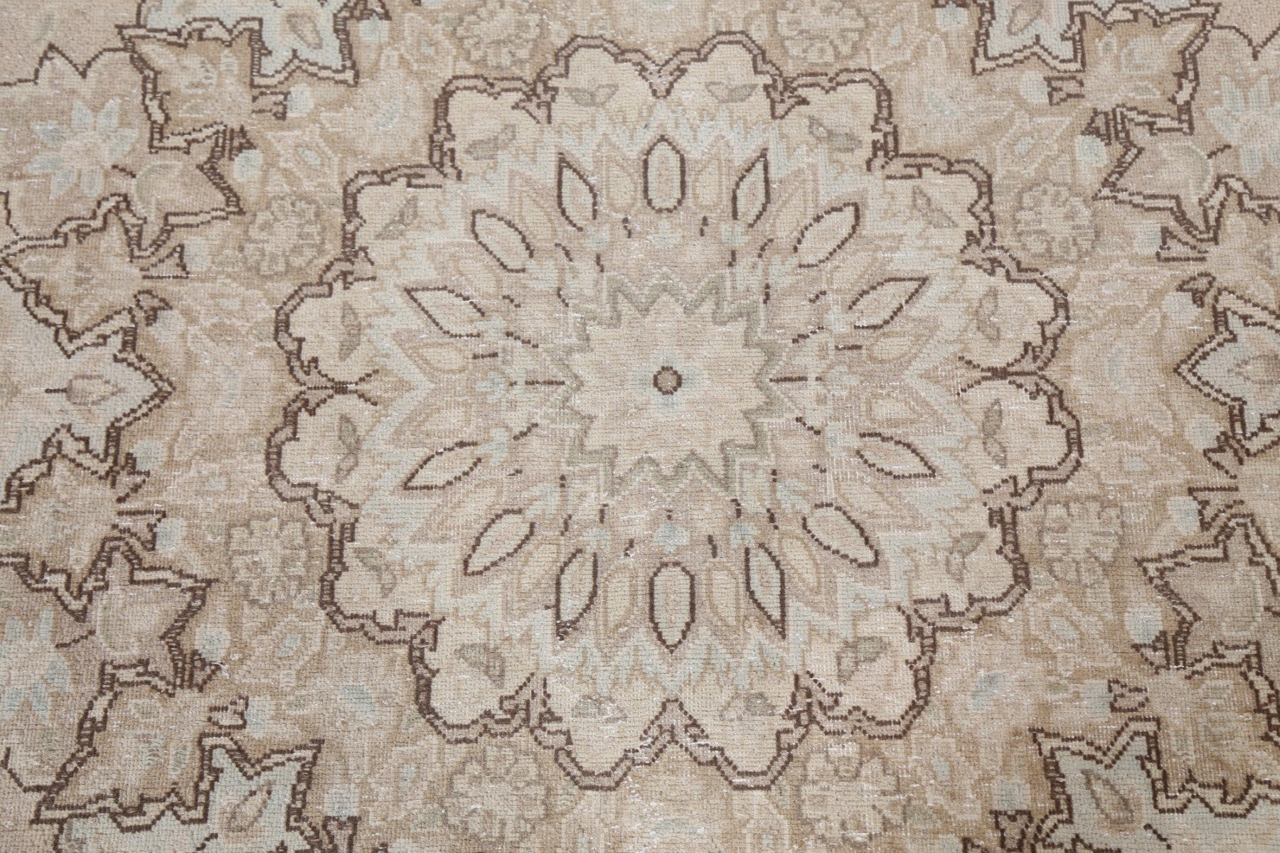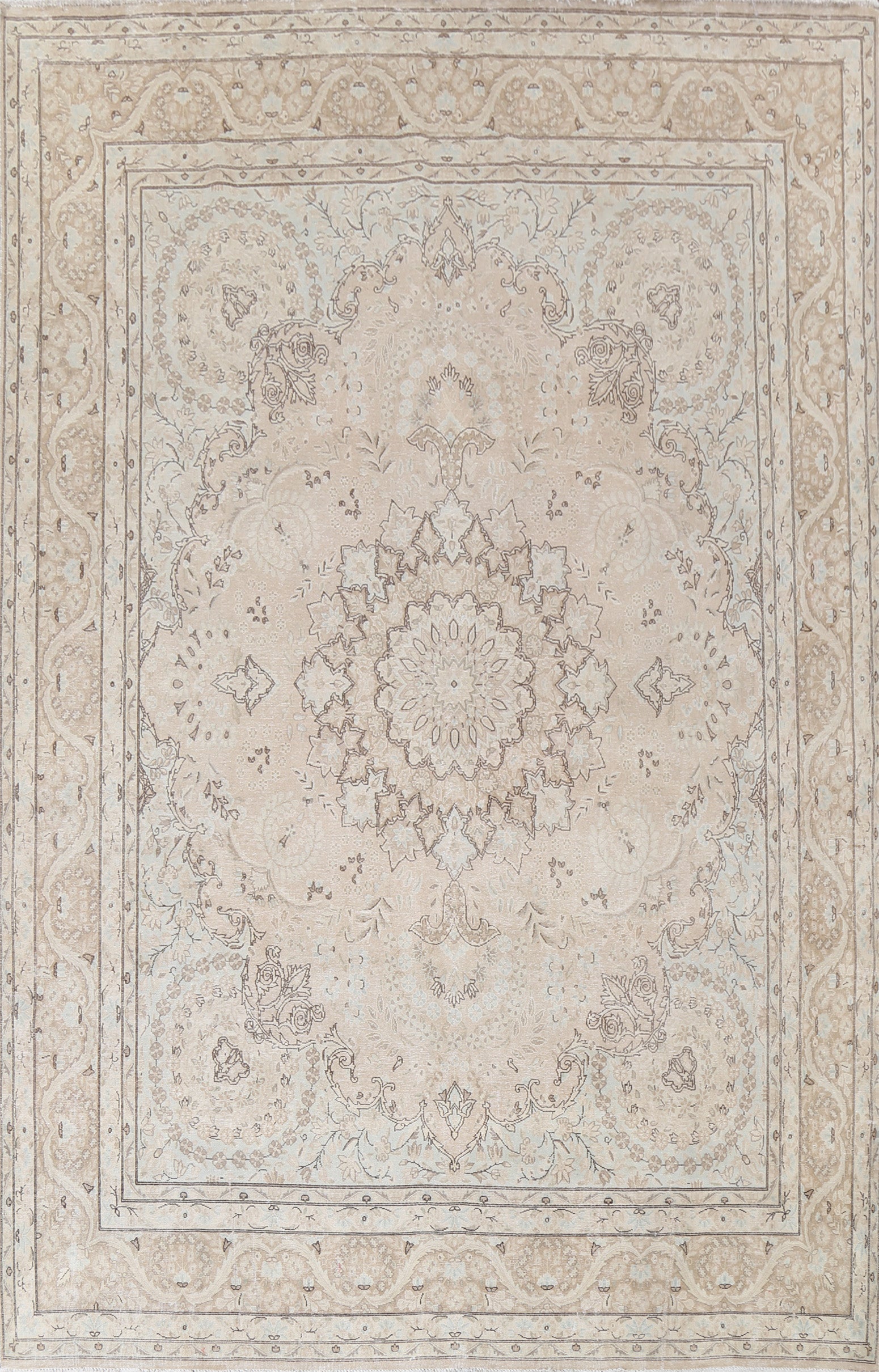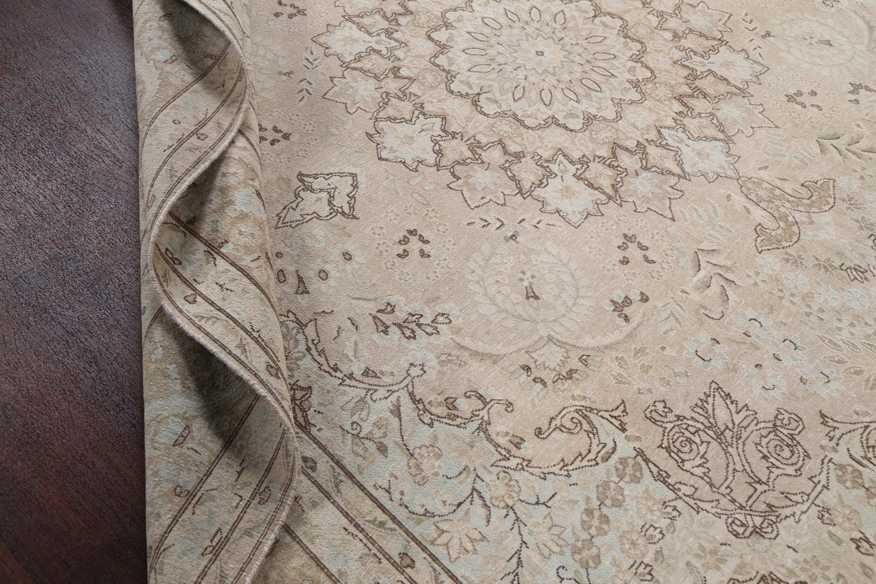 A Beautiful Genuine Persia ( Persia ) Kerman rug is Hand Knotted by skillful weavers in Persia ( Persia ) with 100% Wool Material. This rug is in Very Good (Evenly Low Pile-Repair) condition. dimensions are 12' 10'' X 9' 8'' in foot and 391 X 295 in centimeter. the primary color is Beige & Ivories.