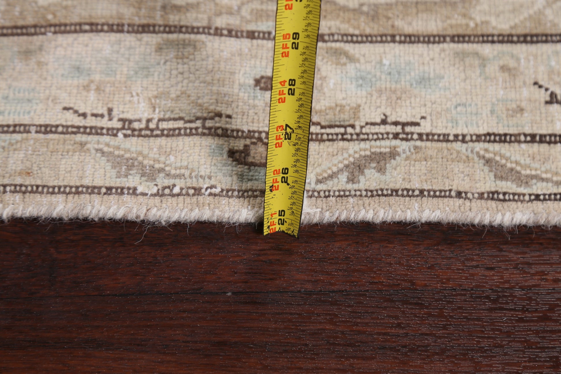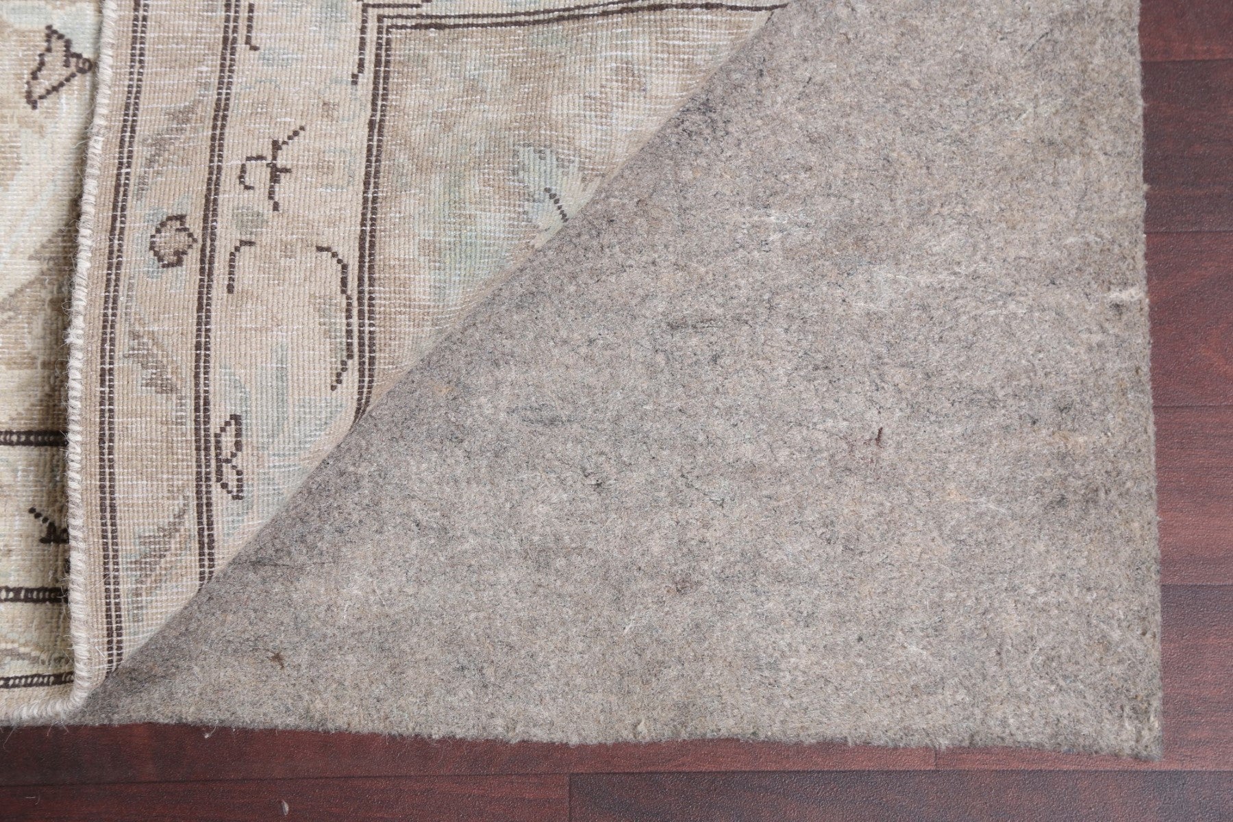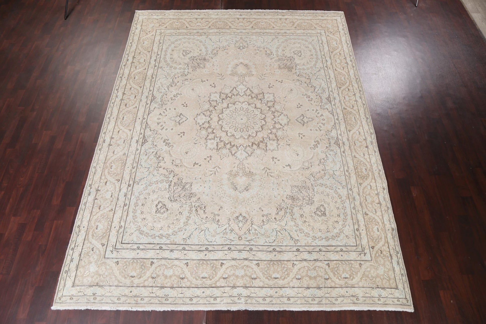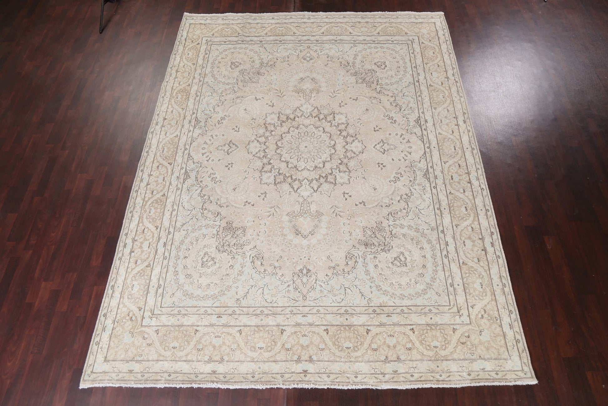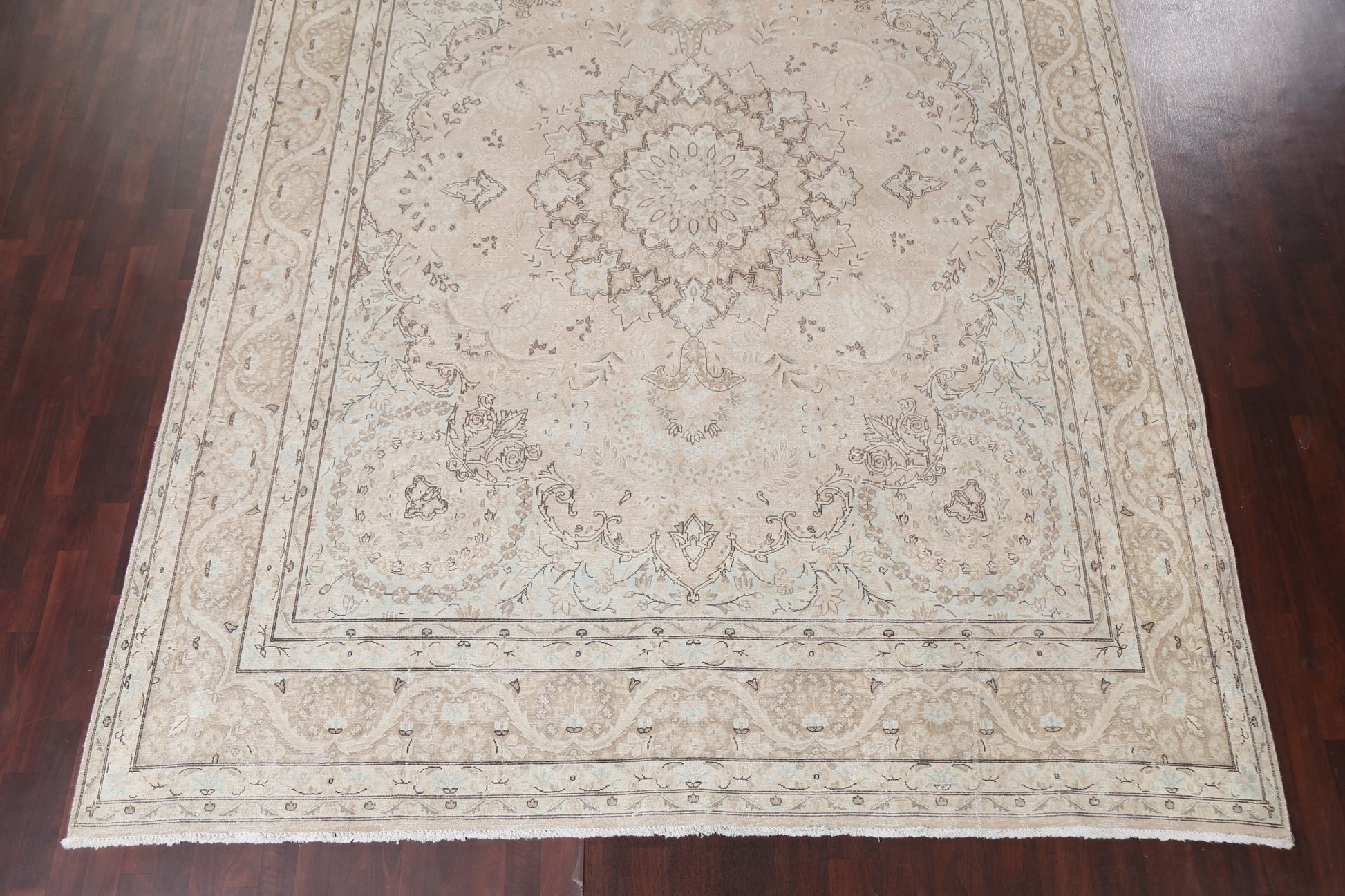 A Beautiful Genuine Persia ( Persia ) Kerman rug is Hand Knotted by skillful weavers in Persia ( Persia ) with 100% Wool Material. This rug is in Very Good (Evenly Low Pile-Repair) condition. dimensions are 12' 10'' X 9' 8'' in foot and 391 X 295 in centimeter. the primary color is Beige & Ivories.