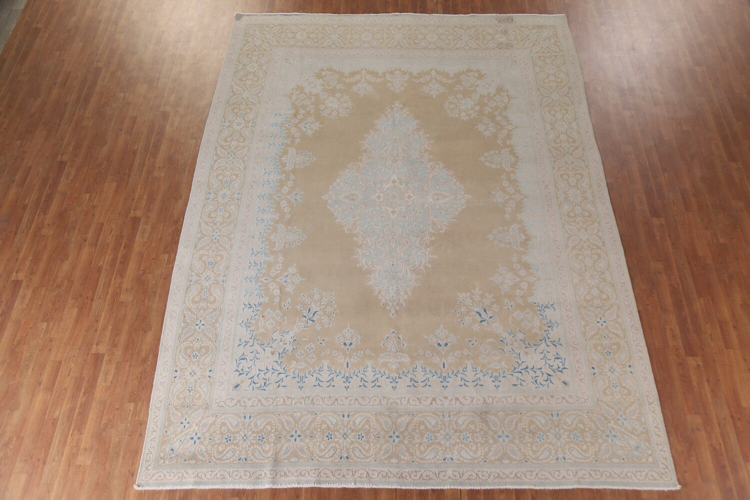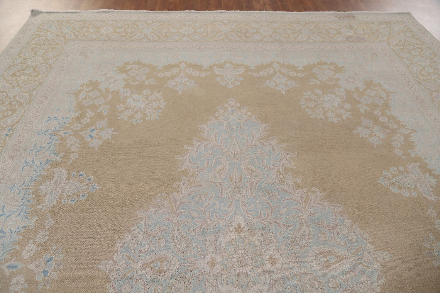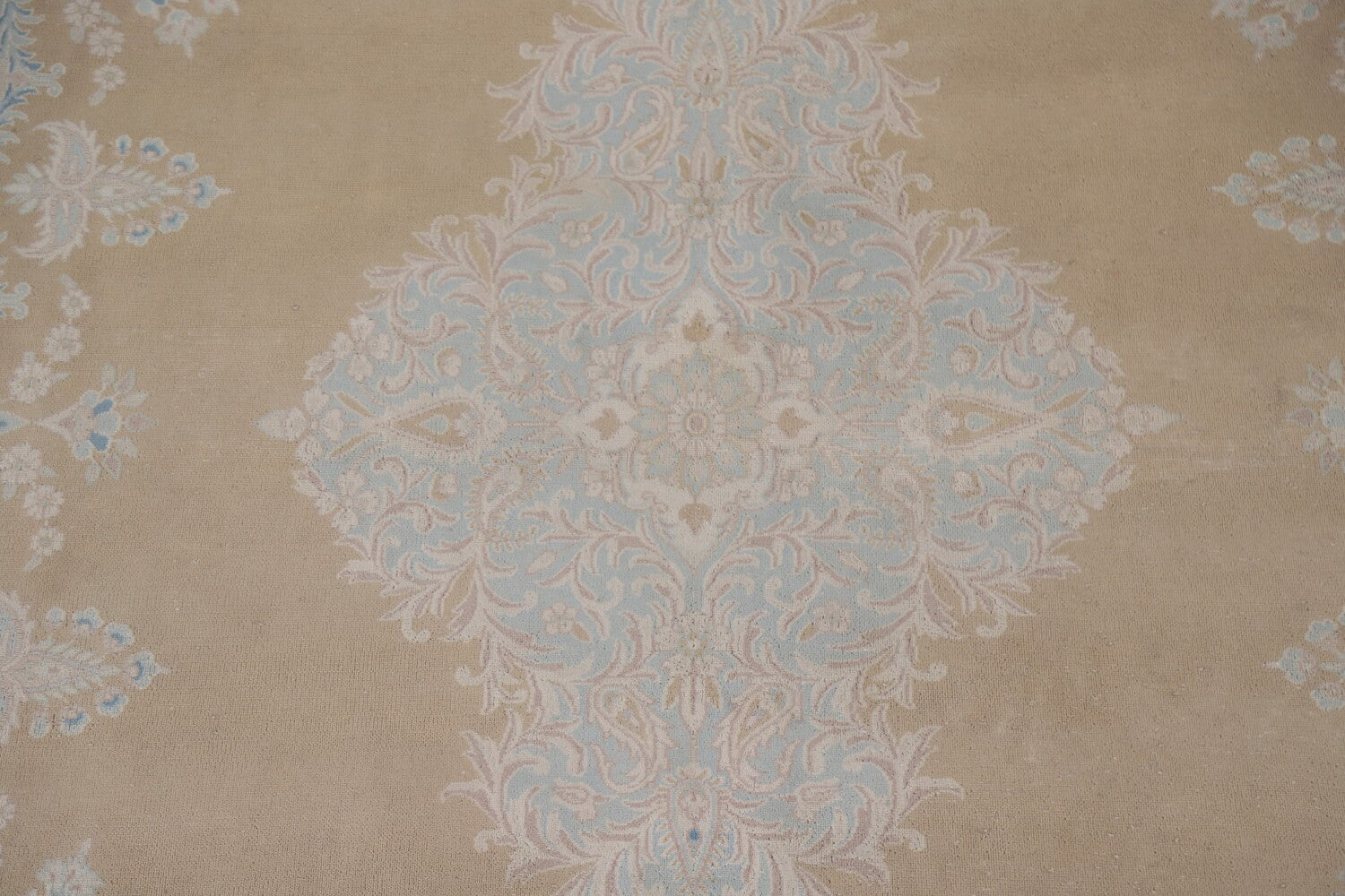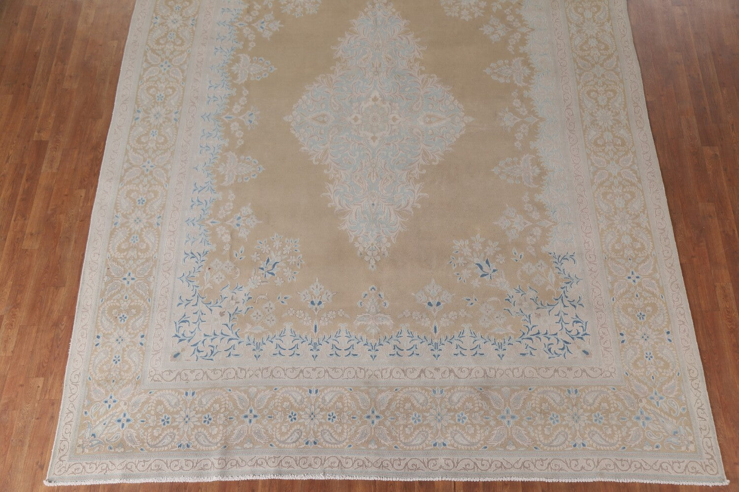 A Beautiful Genuine Persia ( Persia ) Kerman rug is Hand Knotted by skillful weavers in Persia ( Persia ) with 100% Wool Material. This rug is in Very Good (Evenly Low Pile) condition. dimensions are 12' 8'' X 9' 7'' in foot and 386 X 292 in centimeter. the primary color is Yellow & Gold.