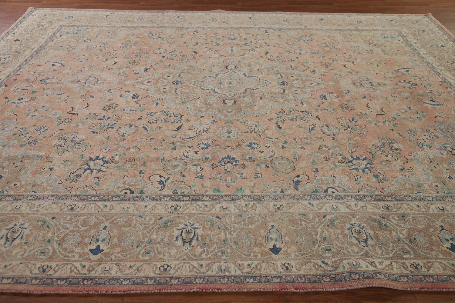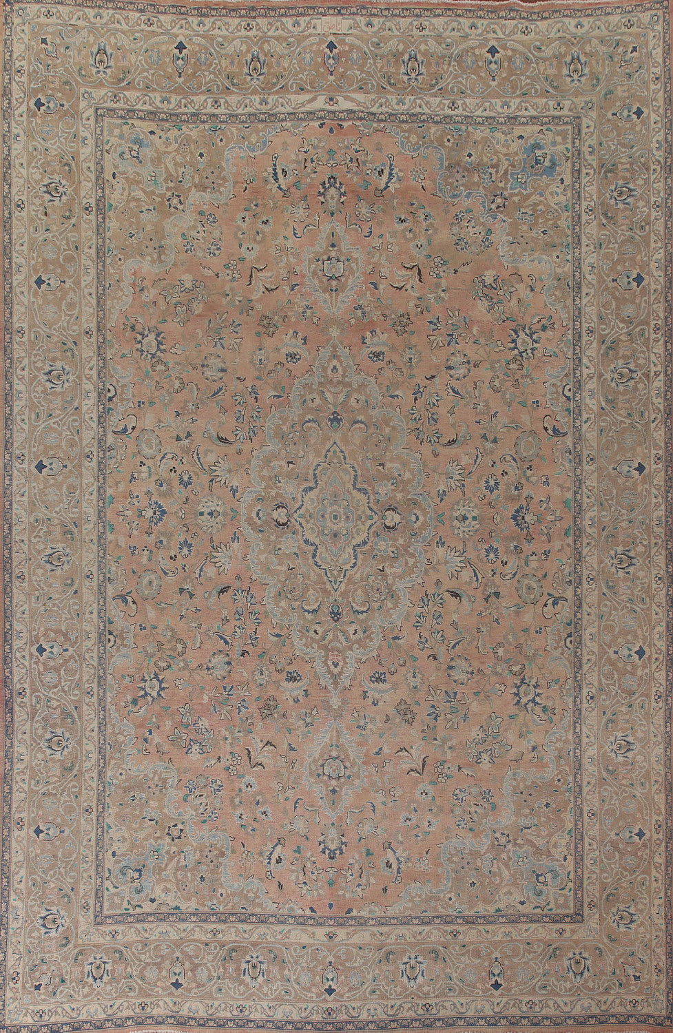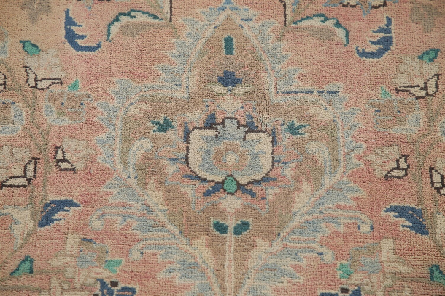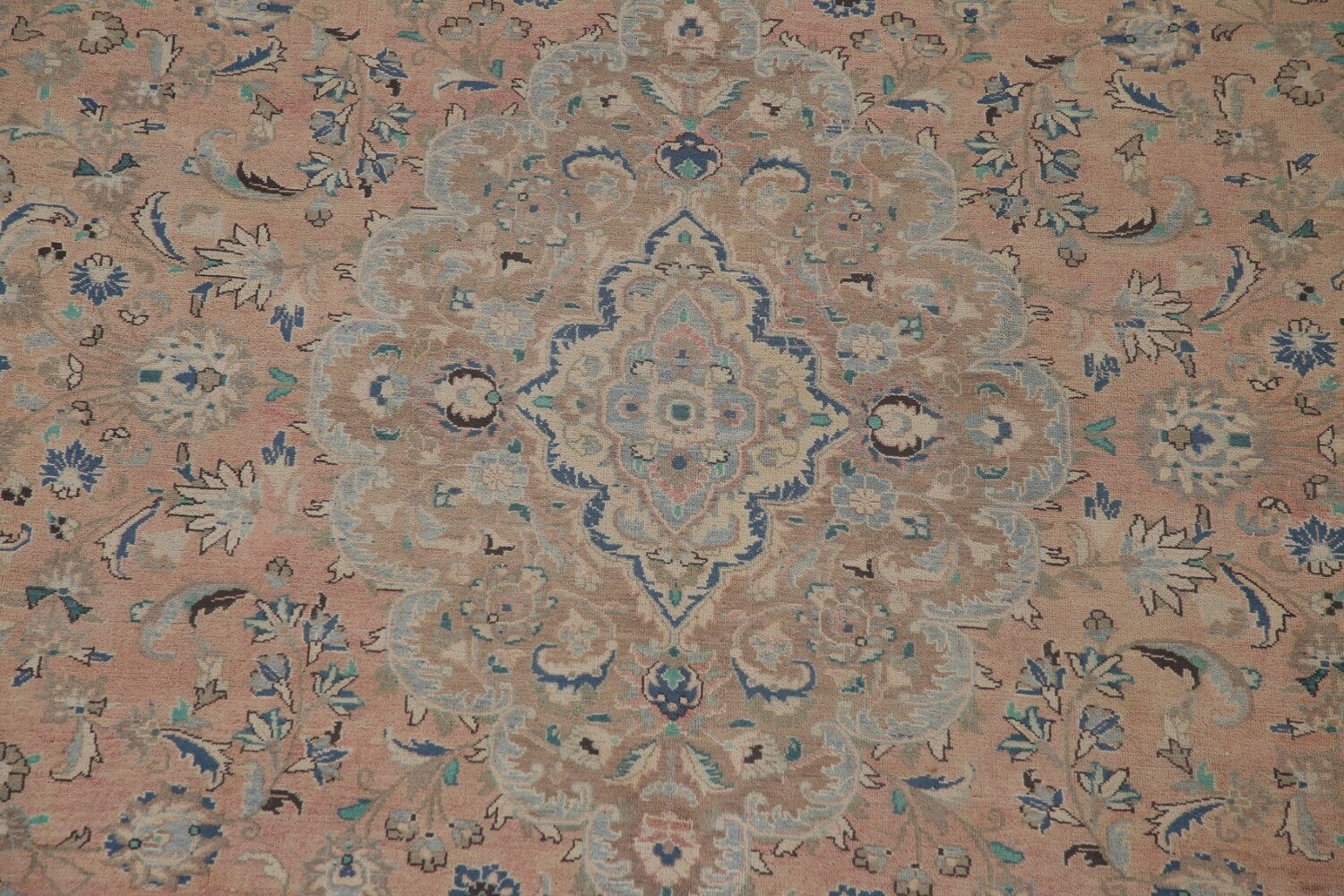 A Beautiful Genuine Persia ( Persia ) Mashad rug is Hand Knotted by skillful weavers in Persia ( Persia ) with 100% Wool Material. This rug is in Very Good (Evenly Low Pile) condition. dimensions are 12' 6'' X 9' 8'' in foot and 381 X 295 in centimeter. the primary color is Pink.