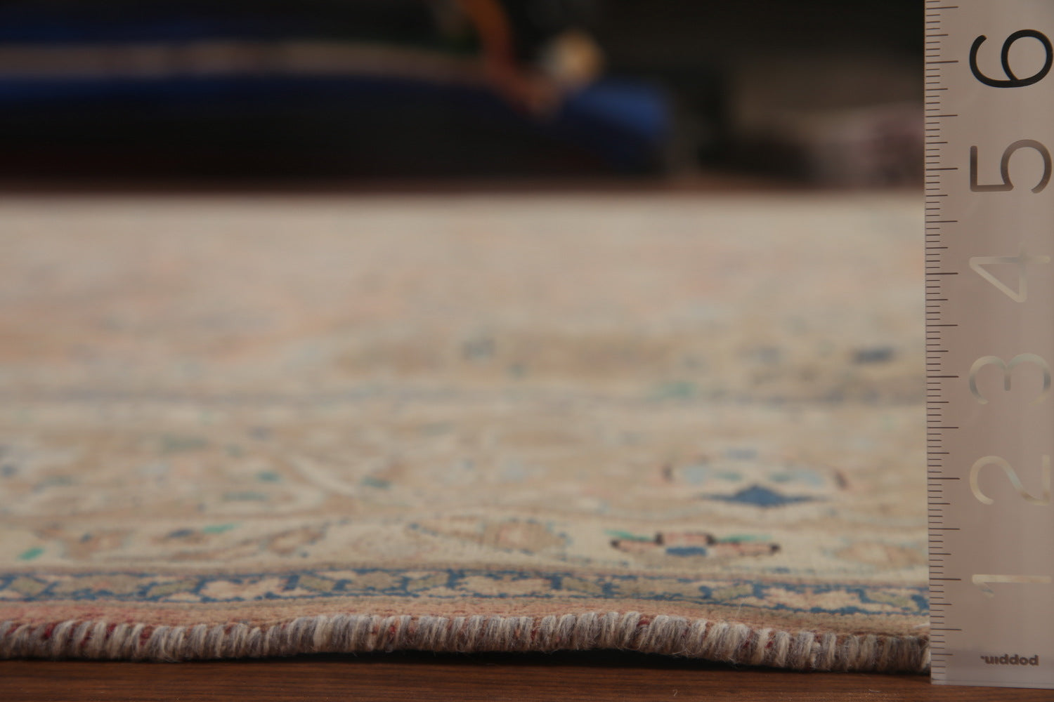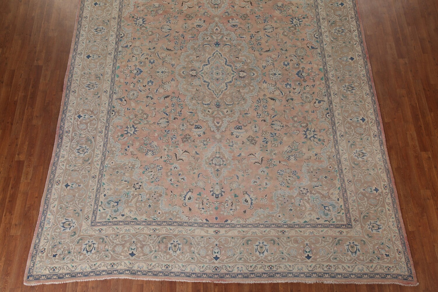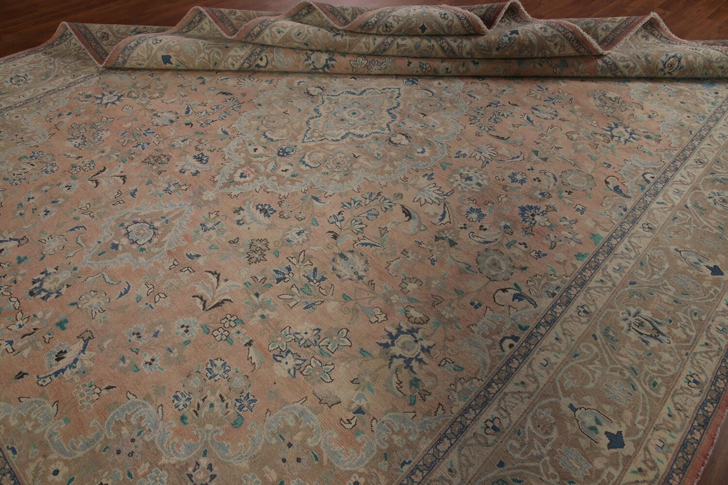 A Beautiful Genuine Persia ( Persia ) Mashad rug is Hand Knotted by skillful weavers in Persia ( Persia ) with 100% Wool Material. This rug is in Very Good (Evenly Low Pile) condition. dimensions are 12' 6'' X 9' 8'' in foot and 381 X 295 in centimeter. the primary color is Pink.