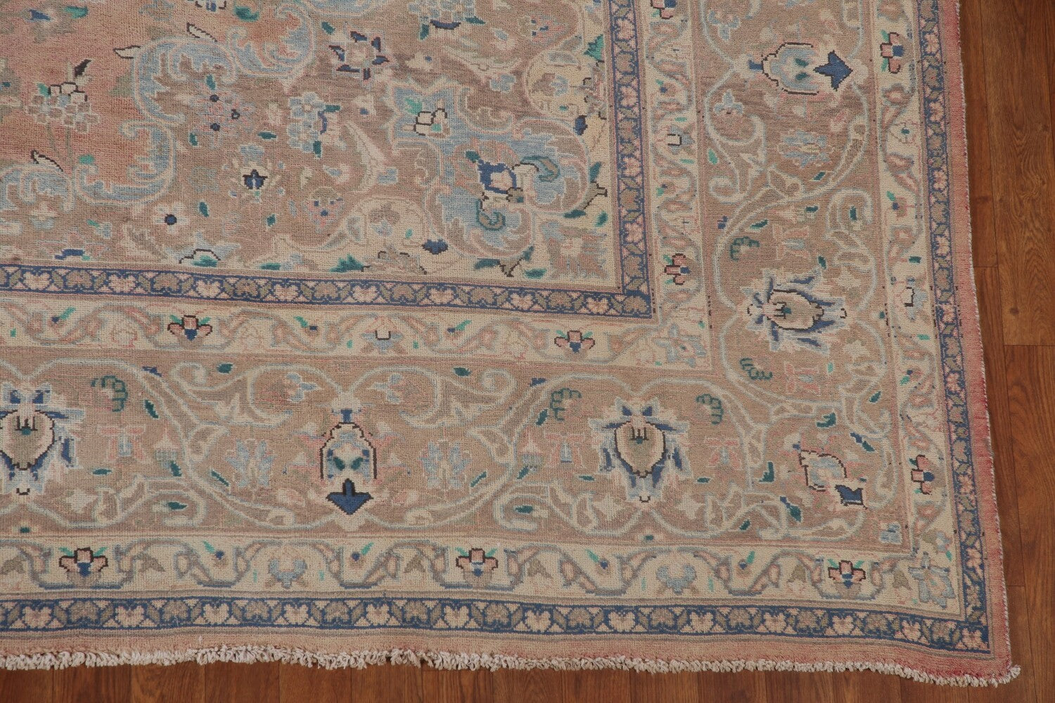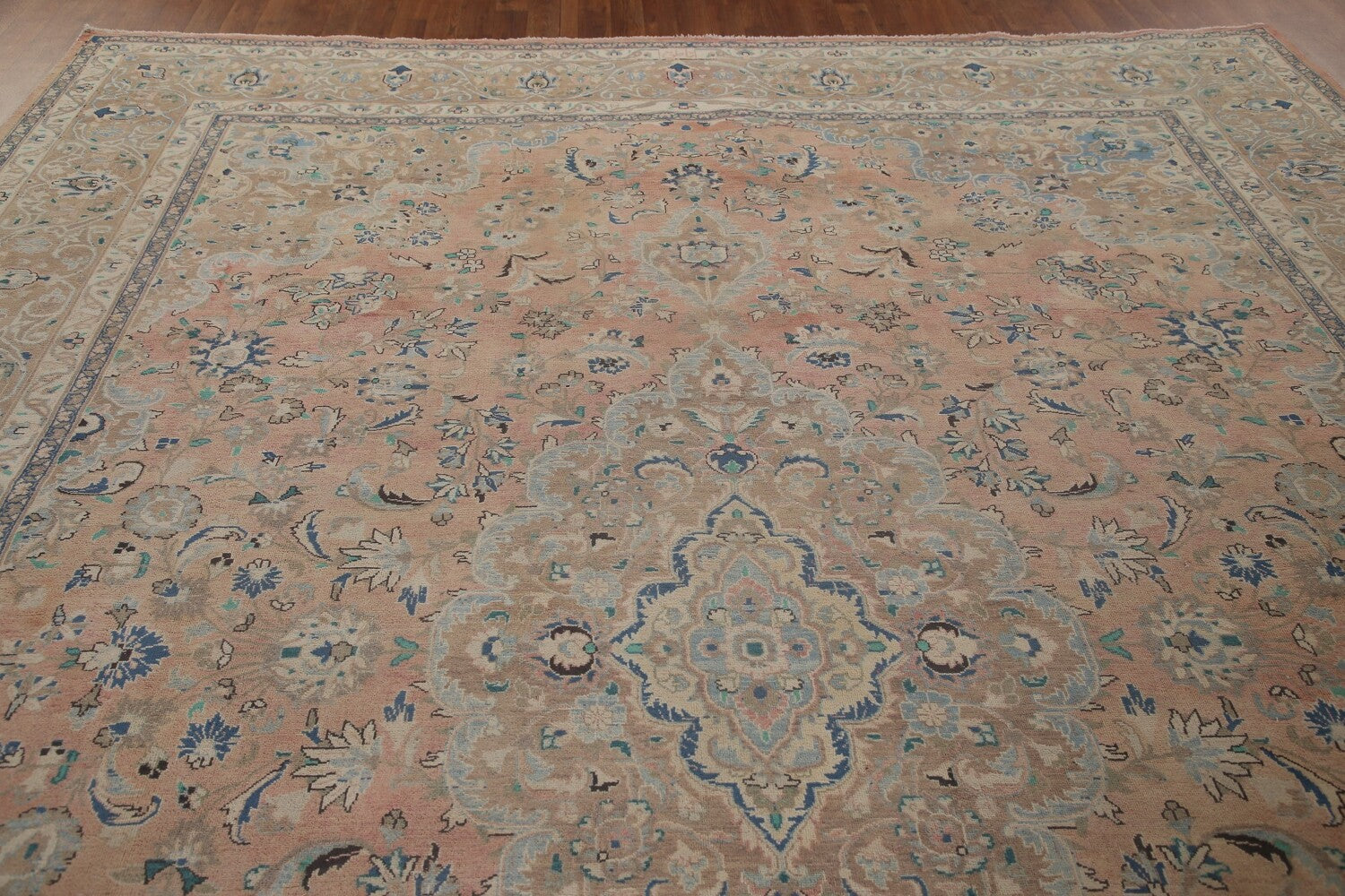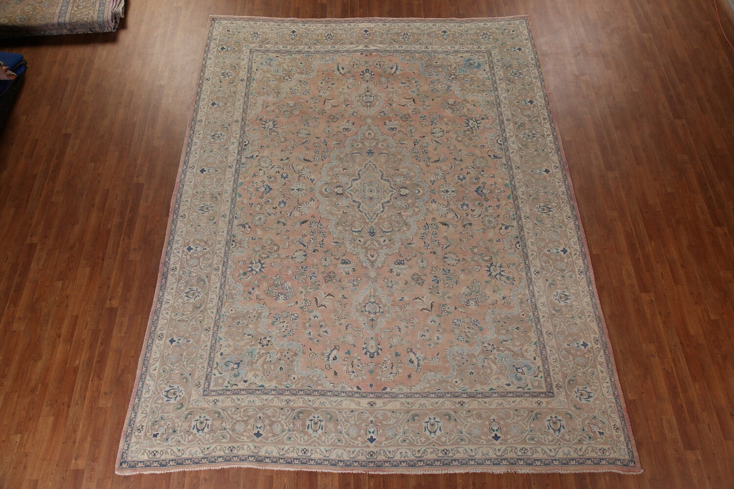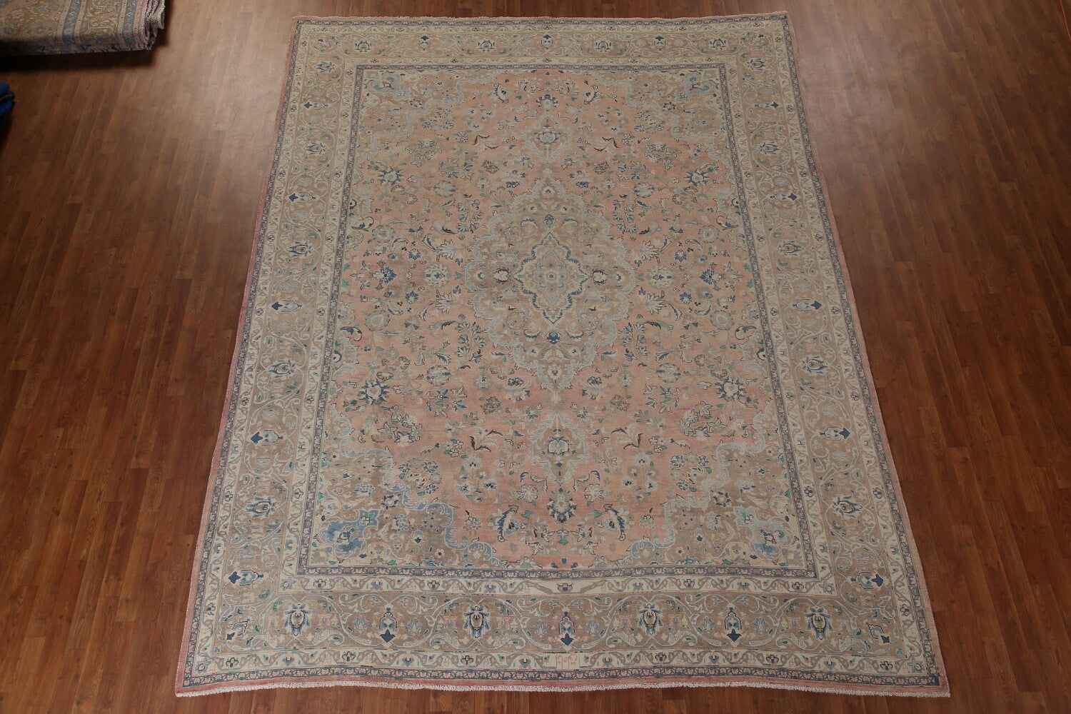 A Beautiful Genuine Persia ( Persia ) Mashad rug is Hand Knotted by skillful weavers in Persia ( Persia ) with 100% Wool Material. This rug is in Very Good (Evenly Low Pile) condition. dimensions are 12' 6'' X 9' 8'' in foot and 381 X 295 in centimeter. the primary color is Pink.