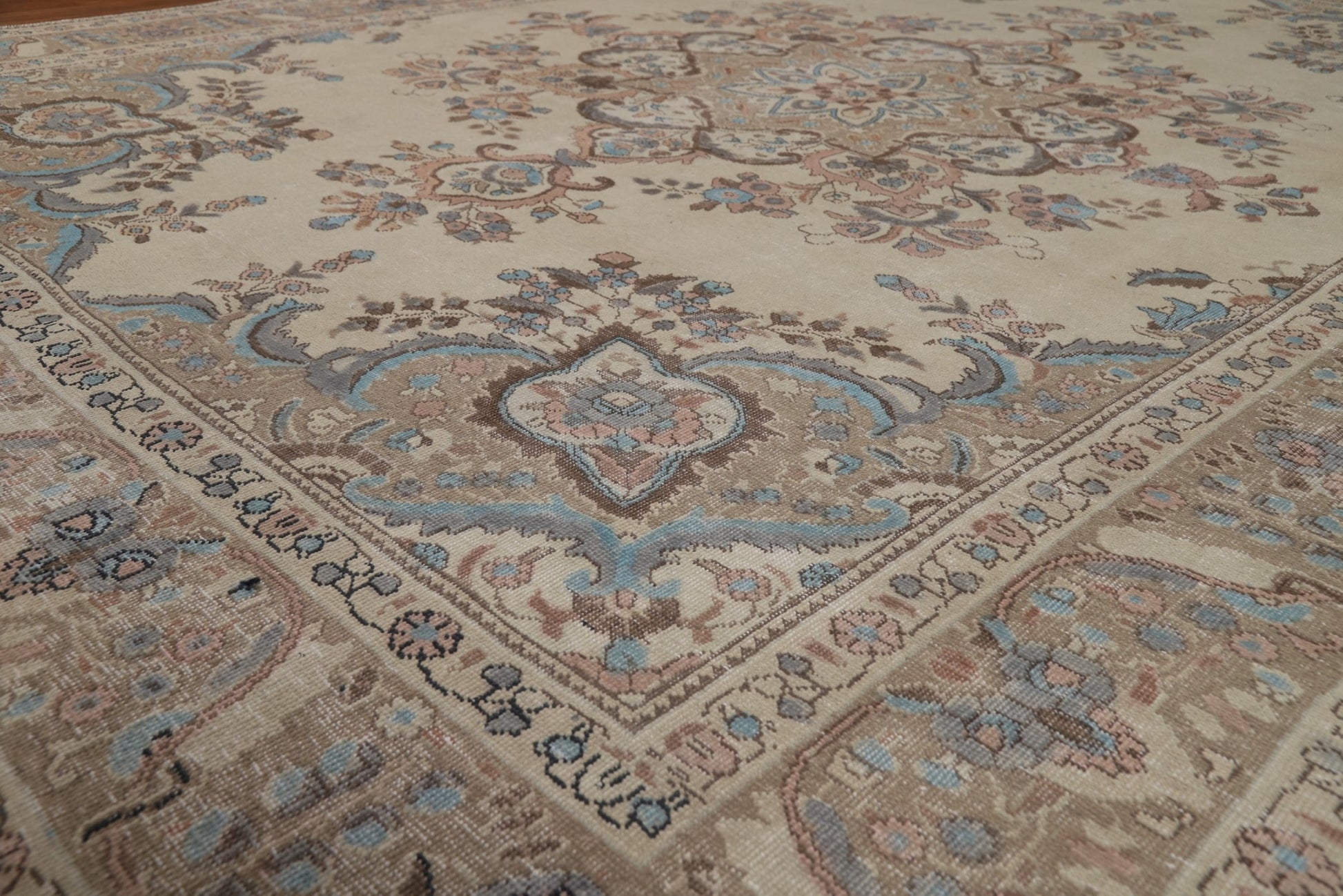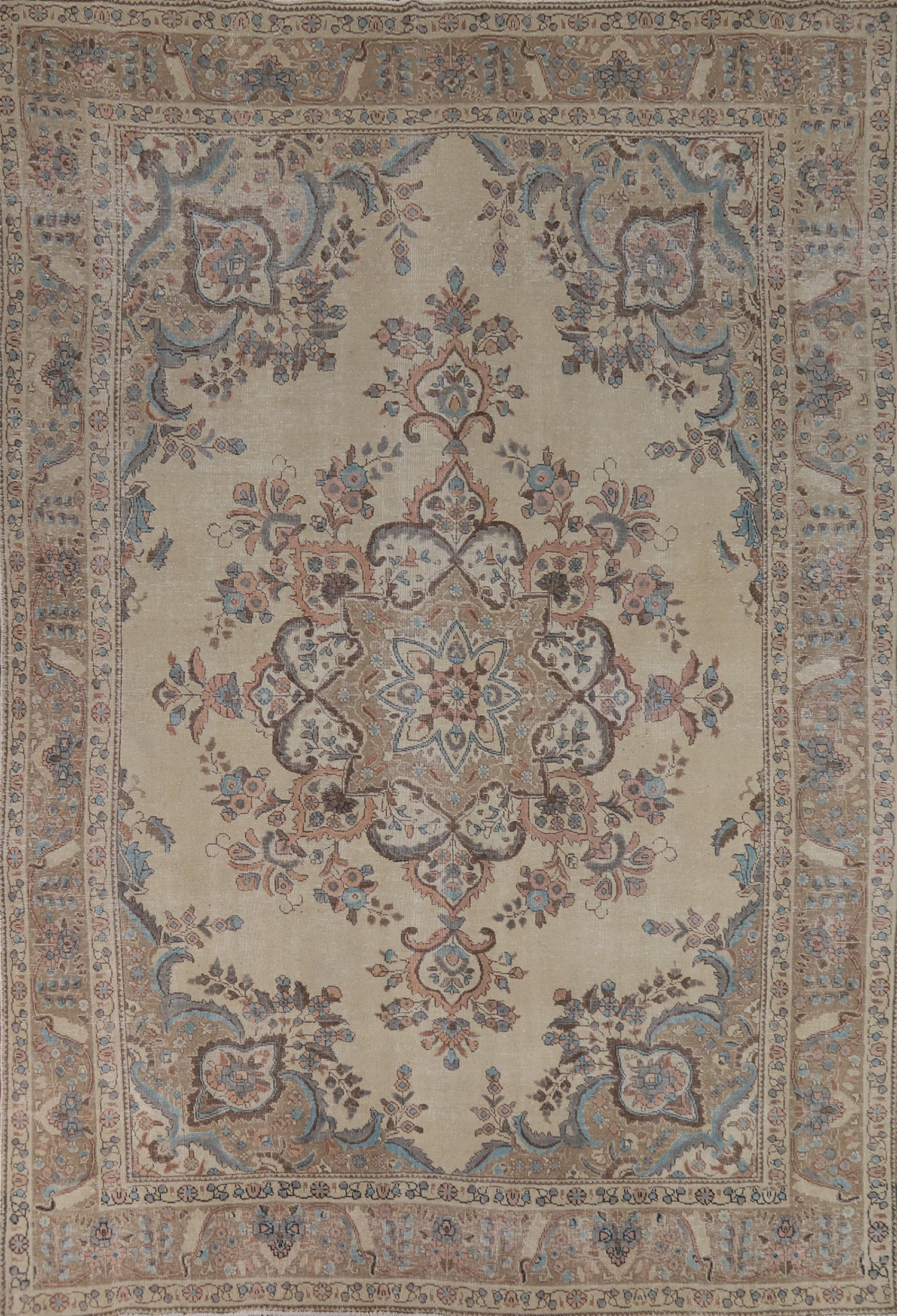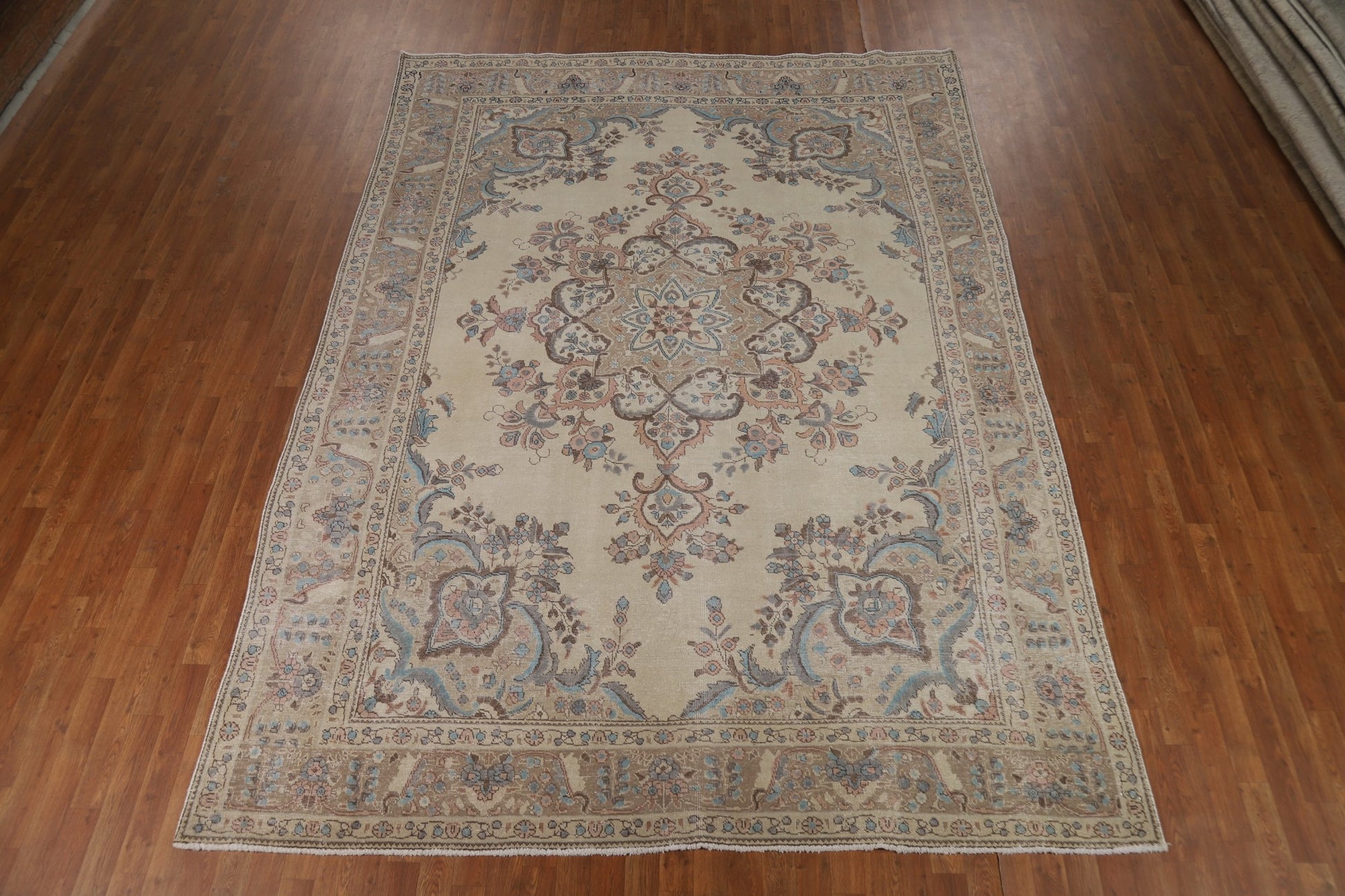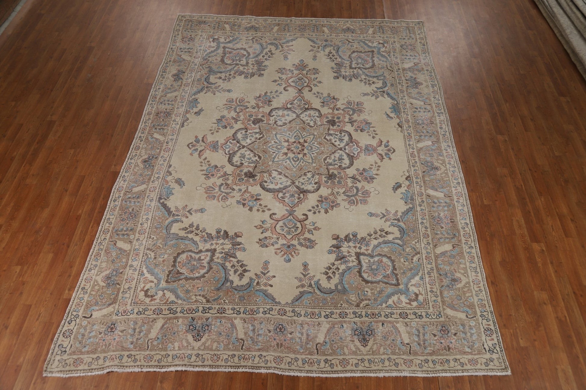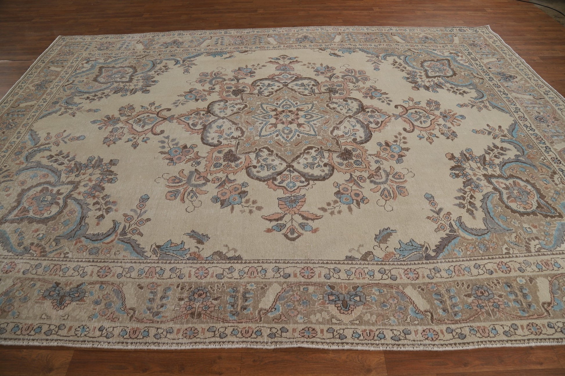 A Beautiful Genuine Persia ( Persia ) Tabriz rug is Hand Knotted by skillful weavers in Persia ( Persia ) with 100% Wool Material. This rug is in Very Good (Evenly Low Pile) condition. dimensions are 11' 3'' X 8' 0'' in foot and 343 X 244 in centimeter. the primary color is Beige & Ivories.