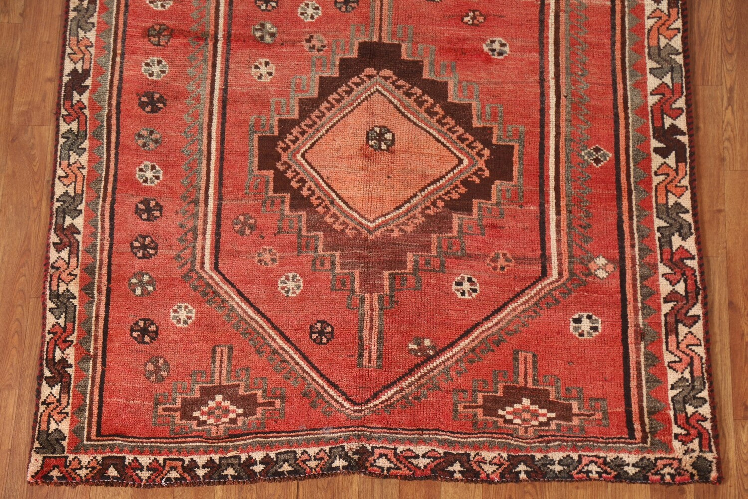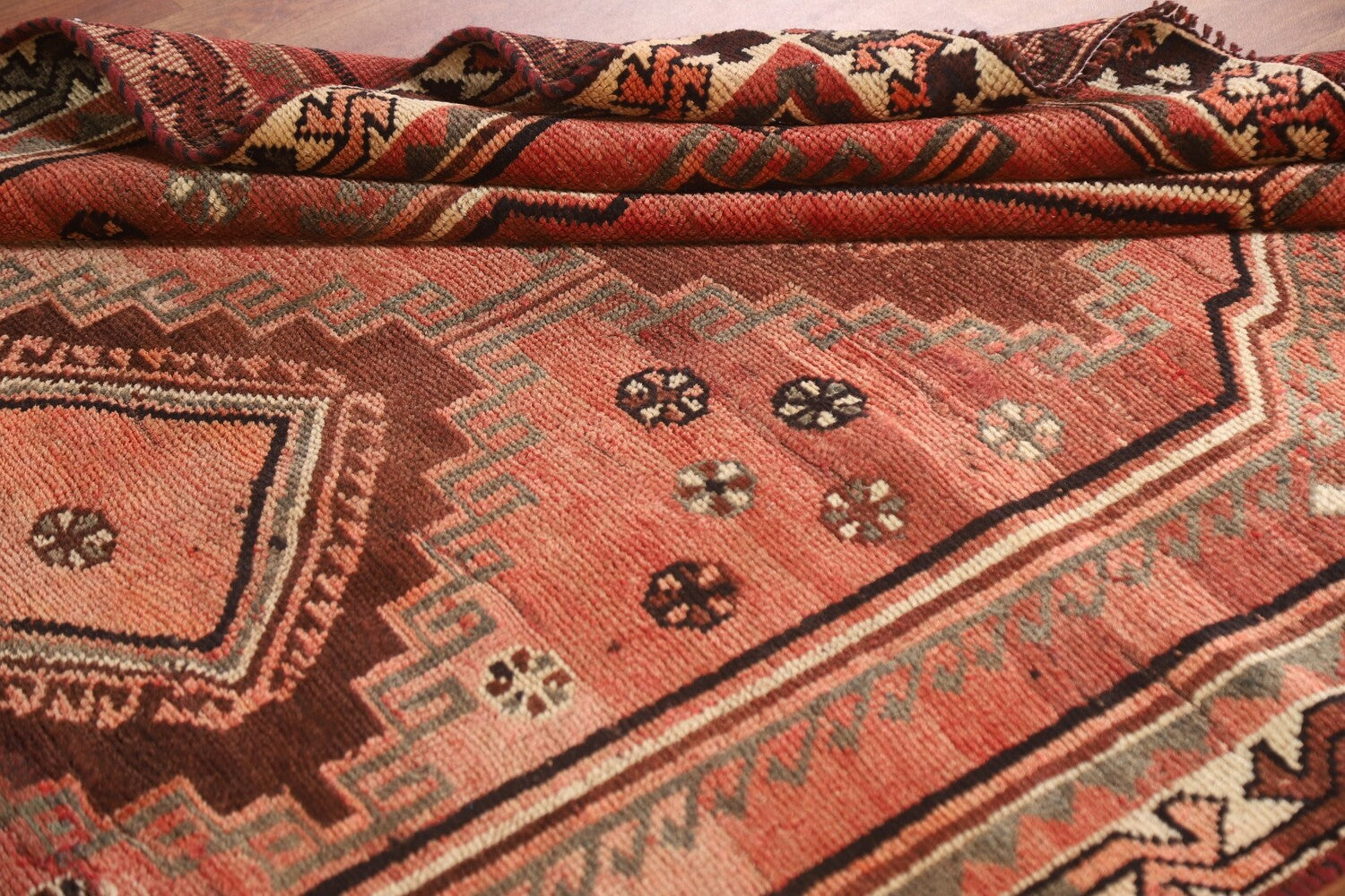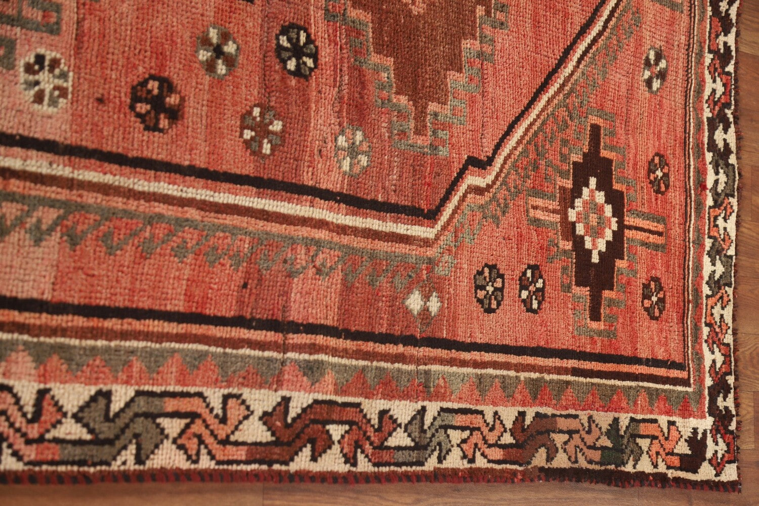 A Beautiful Genuine Persia ( Persia ) Qashqai rug is Hand Knotted by skillful weavers in Persia ( Persia ) with 100% Wool Material. This rug is in Very Good (Low Pile-Abrash) condition. dimensions are 8' 9'' X 4' 7'' in foot and 267 X 140 in centimeter. the primary color is Pink.
