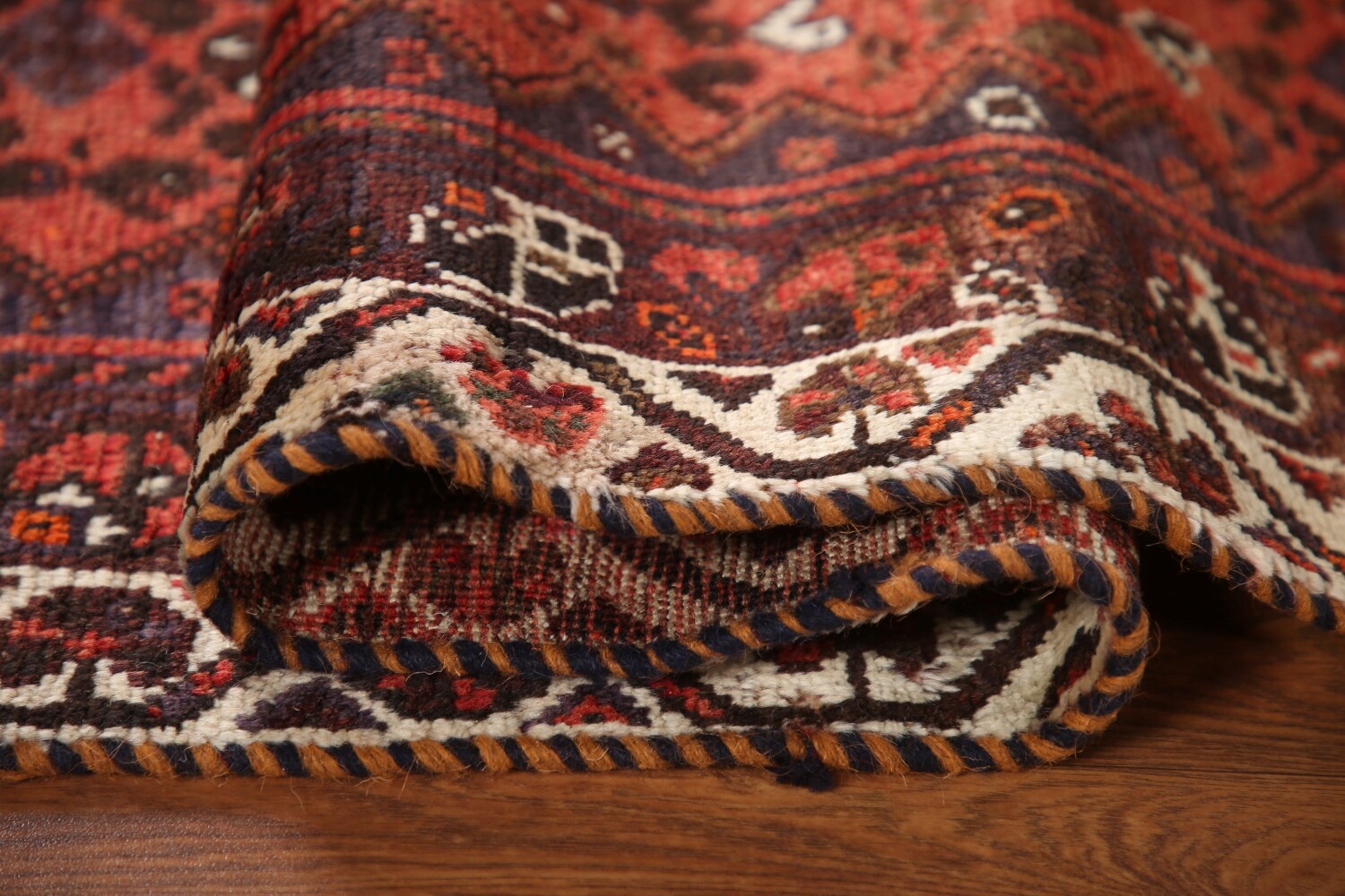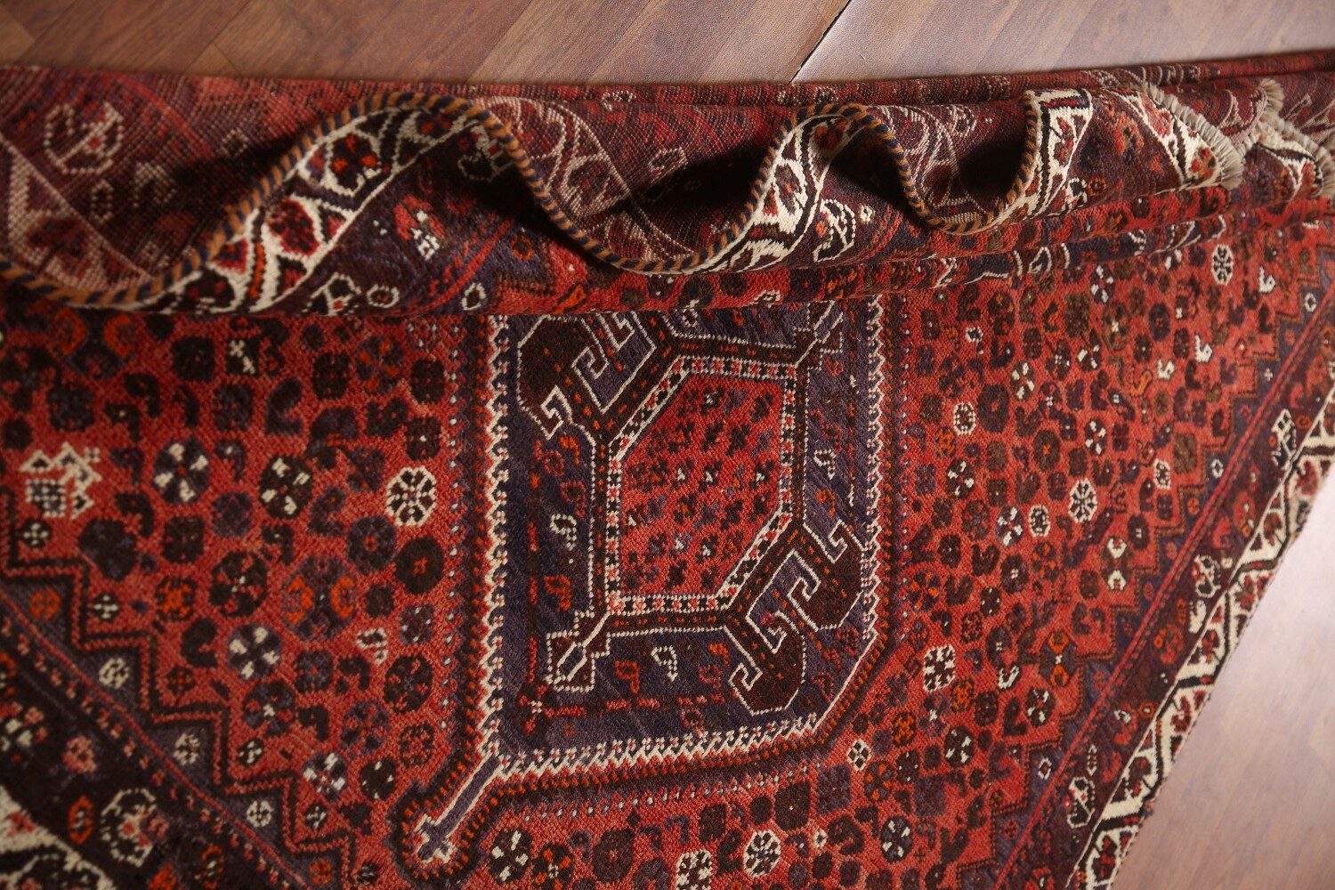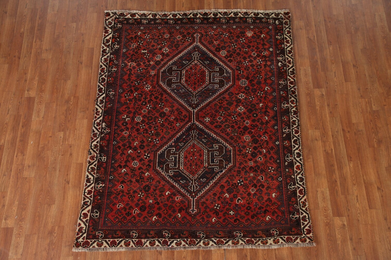 A Beautiful Genuine Persia ( Persia ) Qashqai rug is Hand Knotted by skillful weavers in Persia ( Persia ) with 100% Wool Material. This rug is in Very Good (Low Pile) condition. dimensions are 6' 5'' X 5' 2'' in foot and 196 X 157 in centimeter. the primary color is Red.