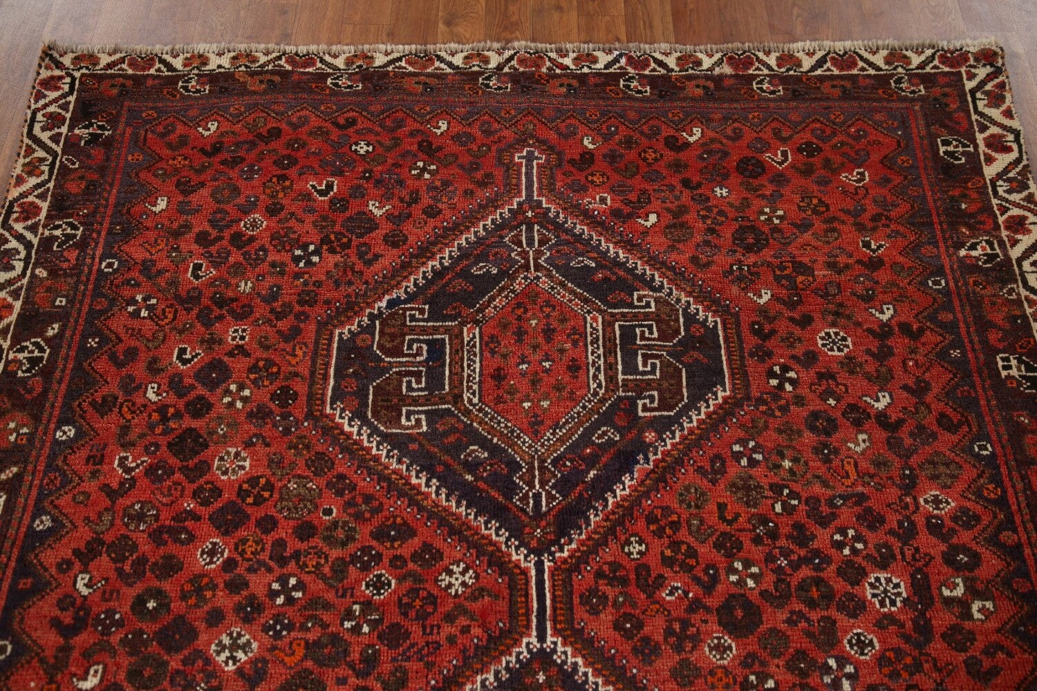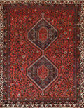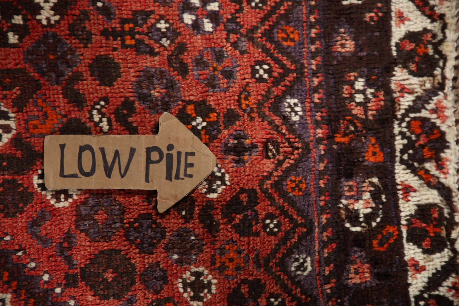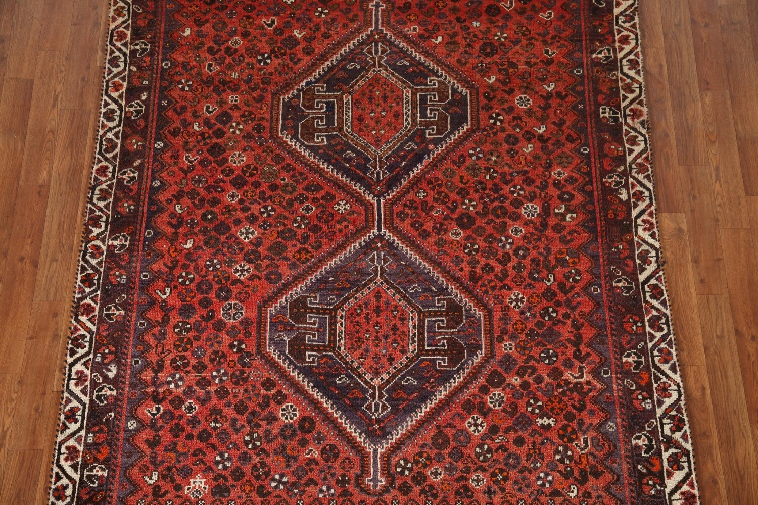 A Beautiful Genuine Persia ( Persia ) Qashqai rug is Hand Knotted by skillful weavers in Persia ( Persia ) with 100% Wool Material. This rug is in Very Good (Low Pile) condition. dimensions are 6' 5'' X 5' 2'' in foot and 196 X 157 in centimeter. the primary color is Red.