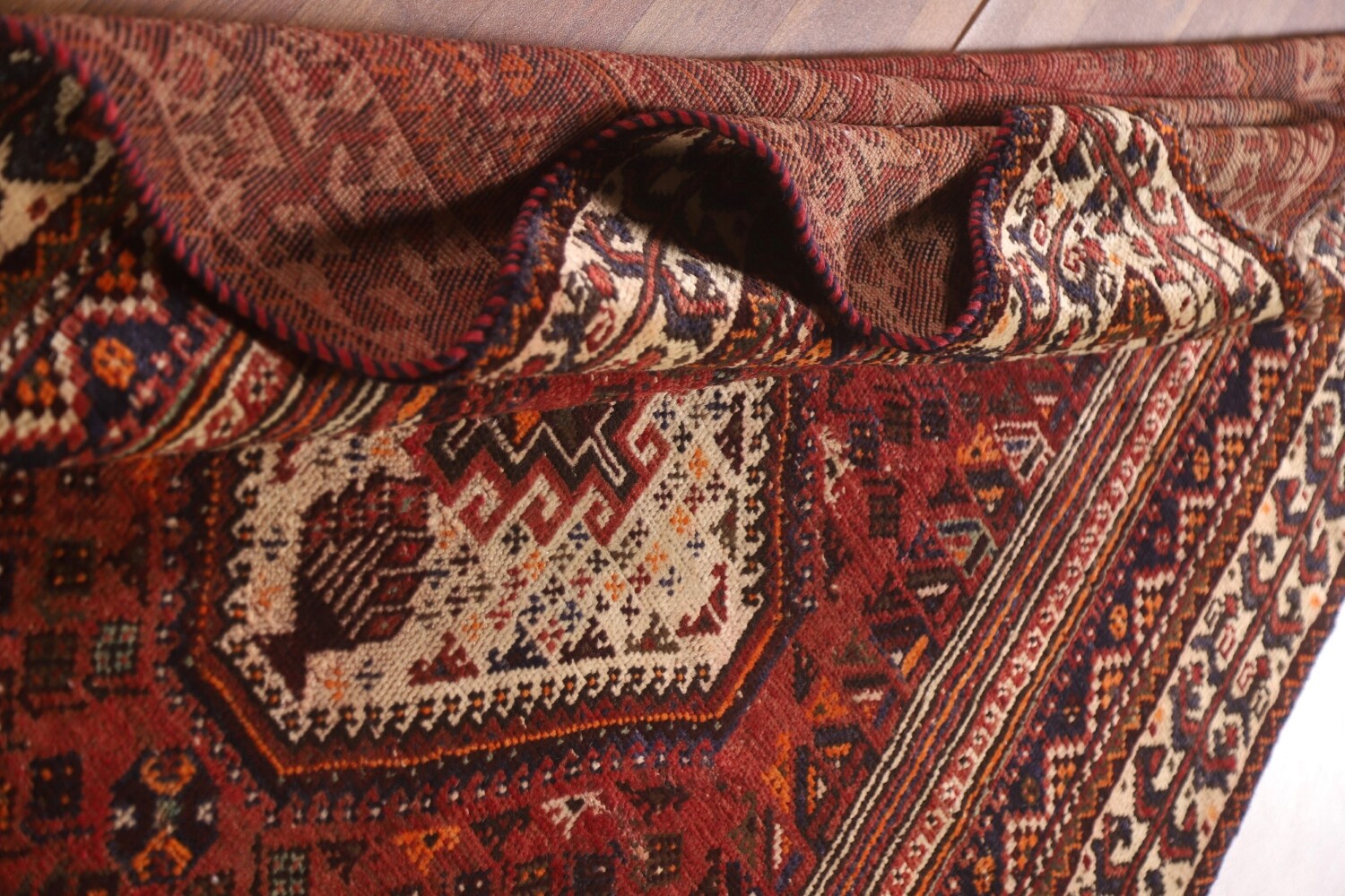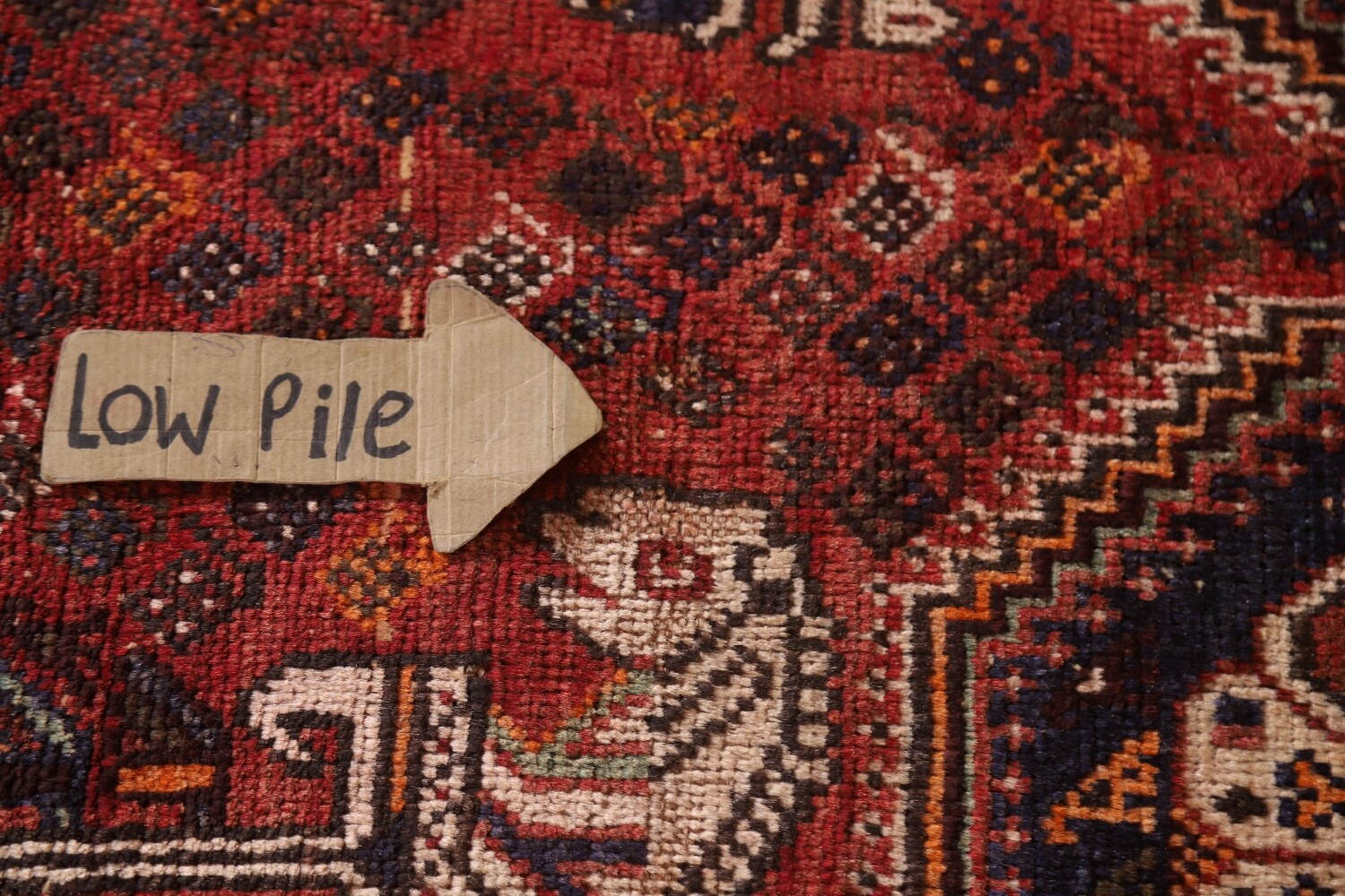 A Beautiful Genuine Persia ( Persia ) Shiraz rug is Hand Knotted by skillful weavers in Persia ( Persia ) with 100% Wool Material. This rug is in Very Good (Low Pile) condition. dimensions are 8' 0'' X 5' 0'' in foot and 244 X 152 in centimeter. the primary color is Red.