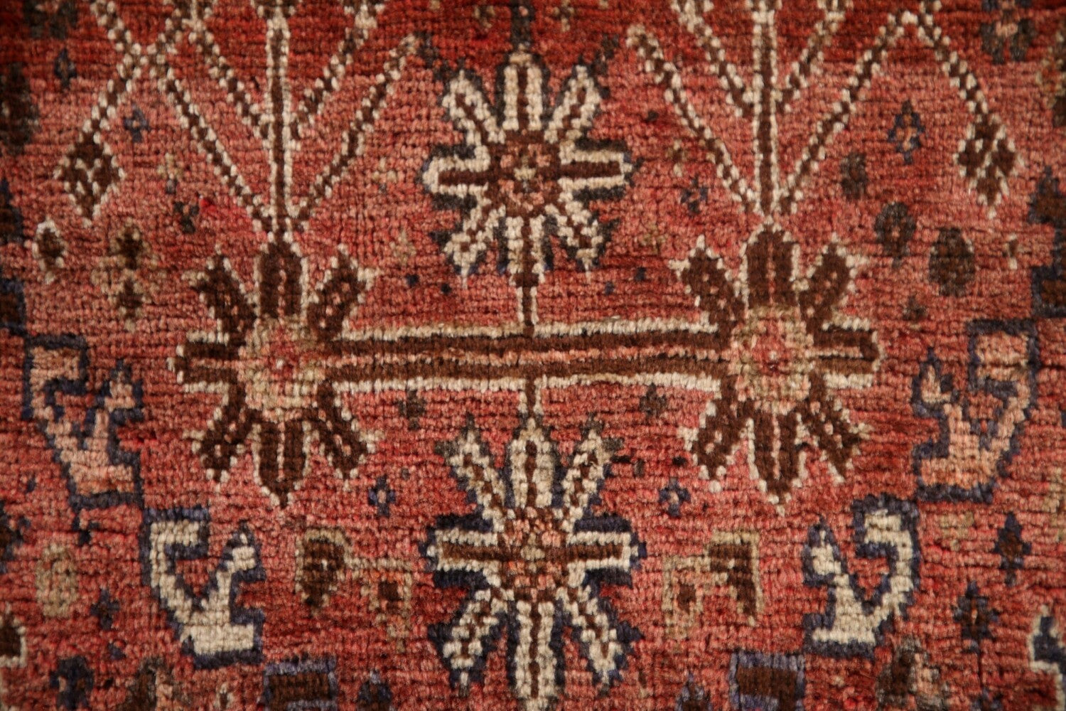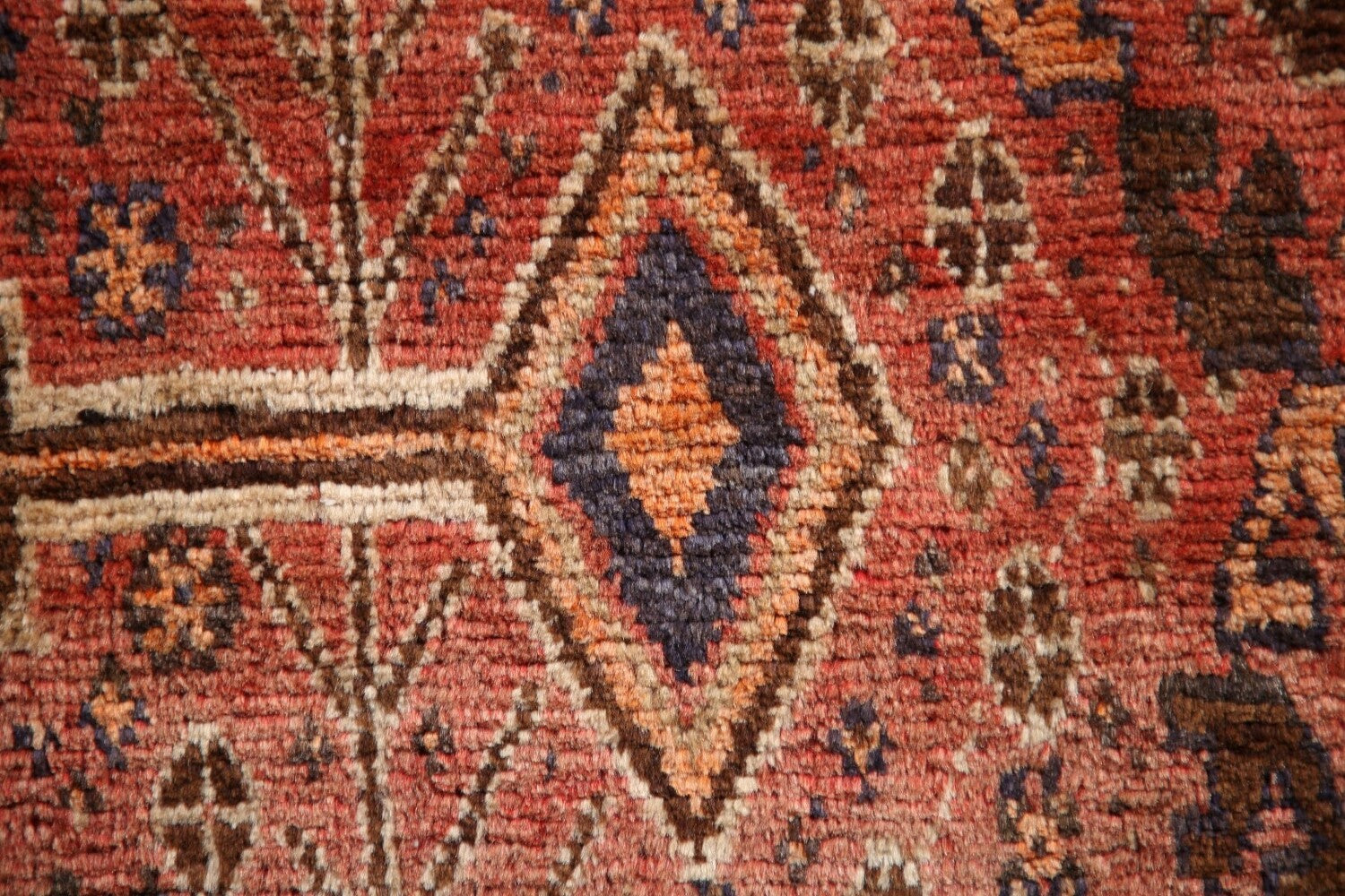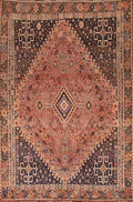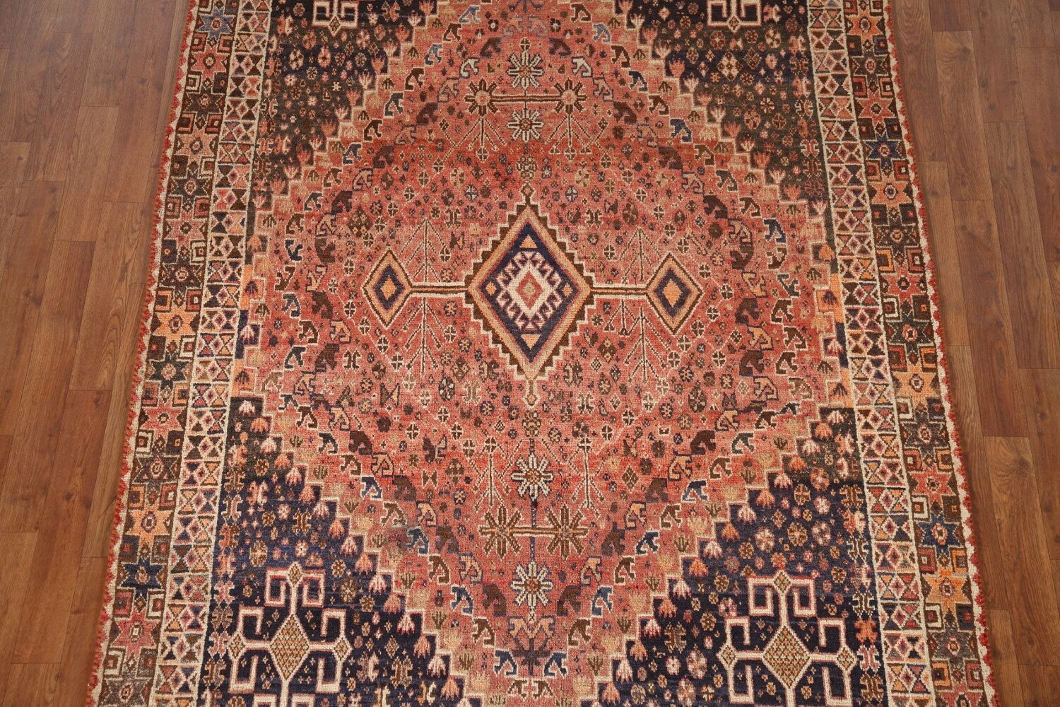 A Beautiful Genuine Persia ( Persia ) Shiraz rug is Hand Knotted by skillful weavers in Persia ( Persia ) with 100% Wool Material. This rug is in Very Good (Stain) condition. dimensions are 7' 10'' X 5' 2'' in foot and 239 X 157 in centimeter. the primary color is Pink.