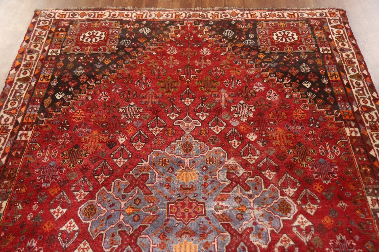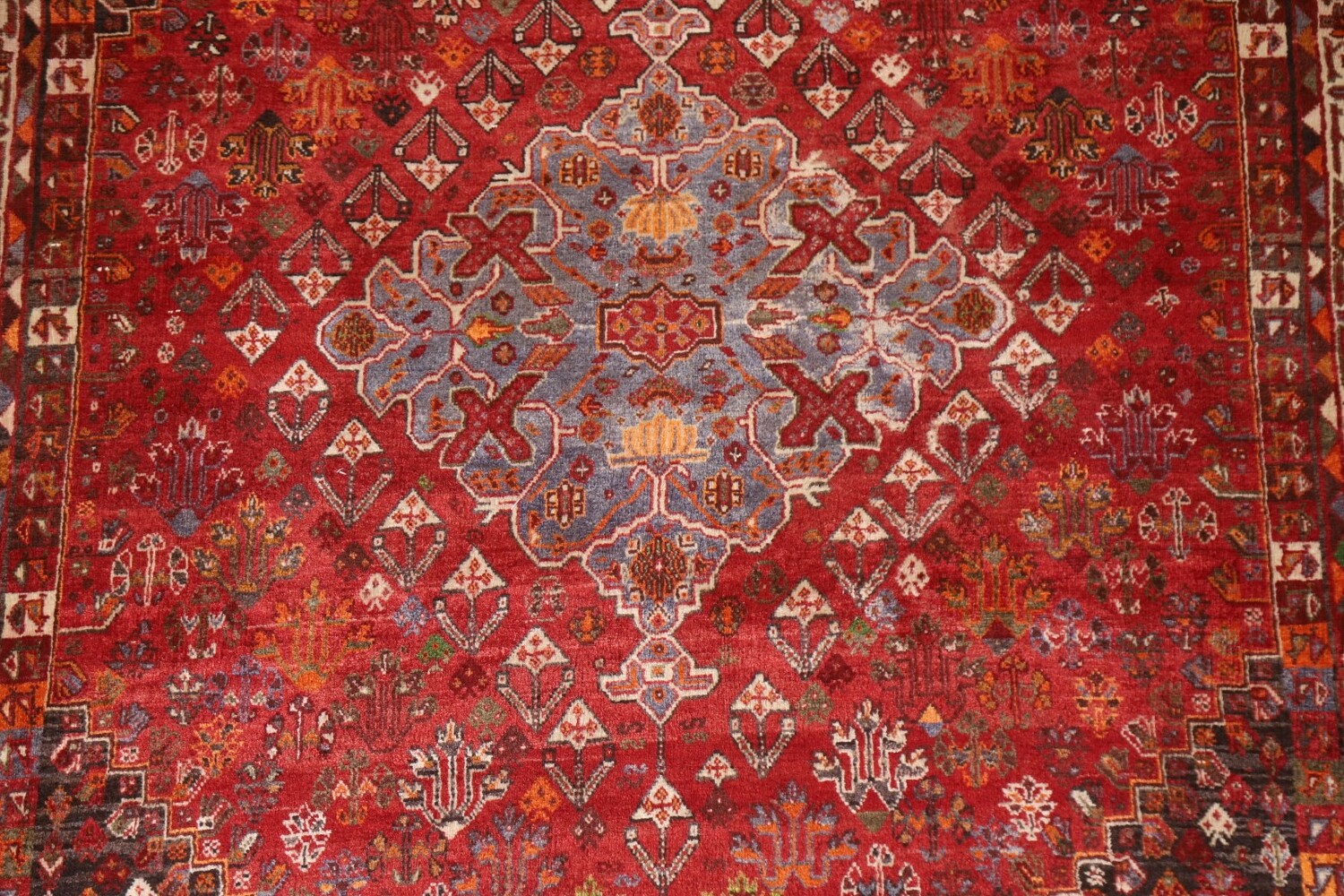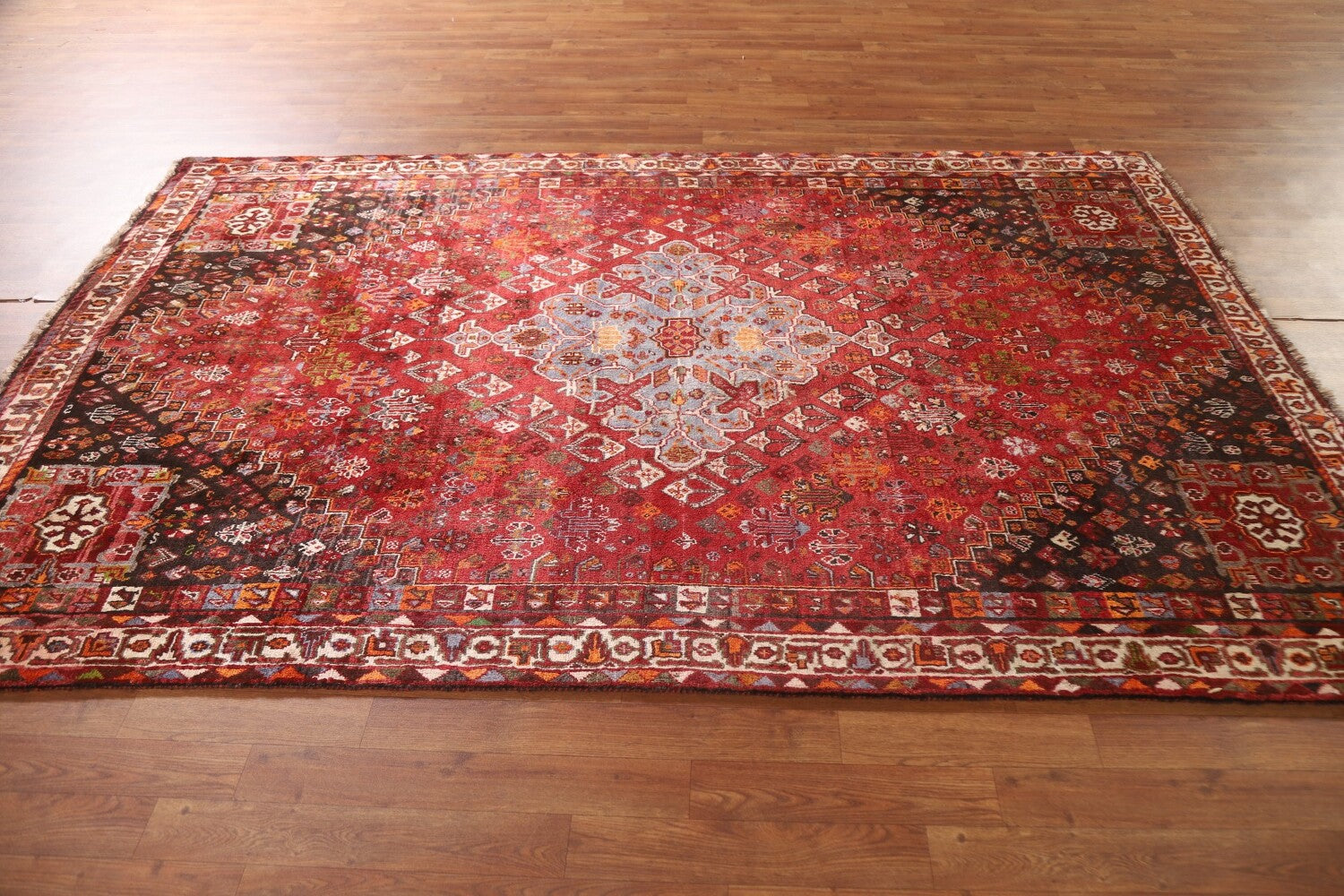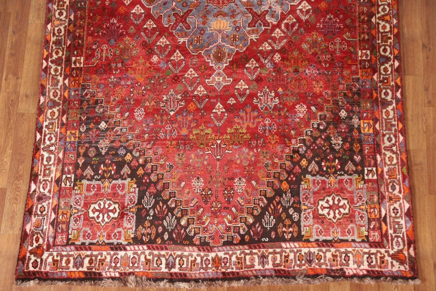 A Beautiful Genuine Persia ( Persia ) Shiraz rug is Hand Knotted by skillful weavers in Persia ( Persia ) with 100% Wool Material. This rug is in Very Good (Abrash) condition. dimensions are 8' 5'' X 5' 4'' in foot and 257 X 163 in centimeter. the primary color is Red.