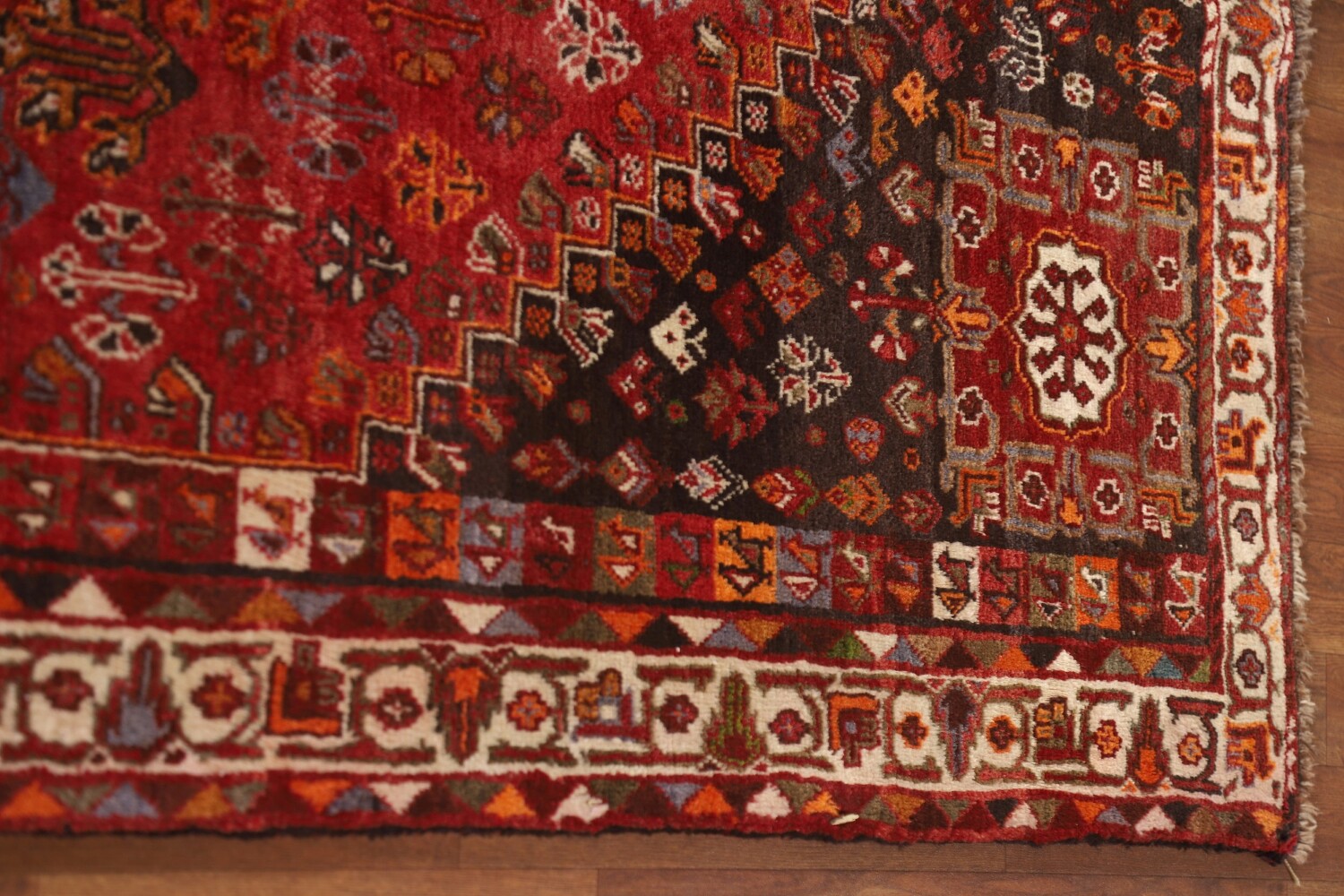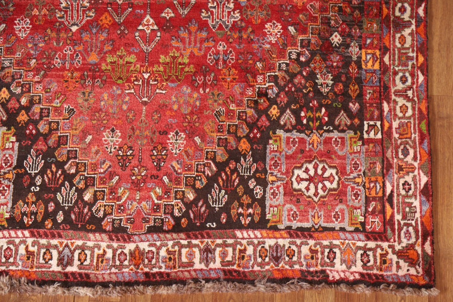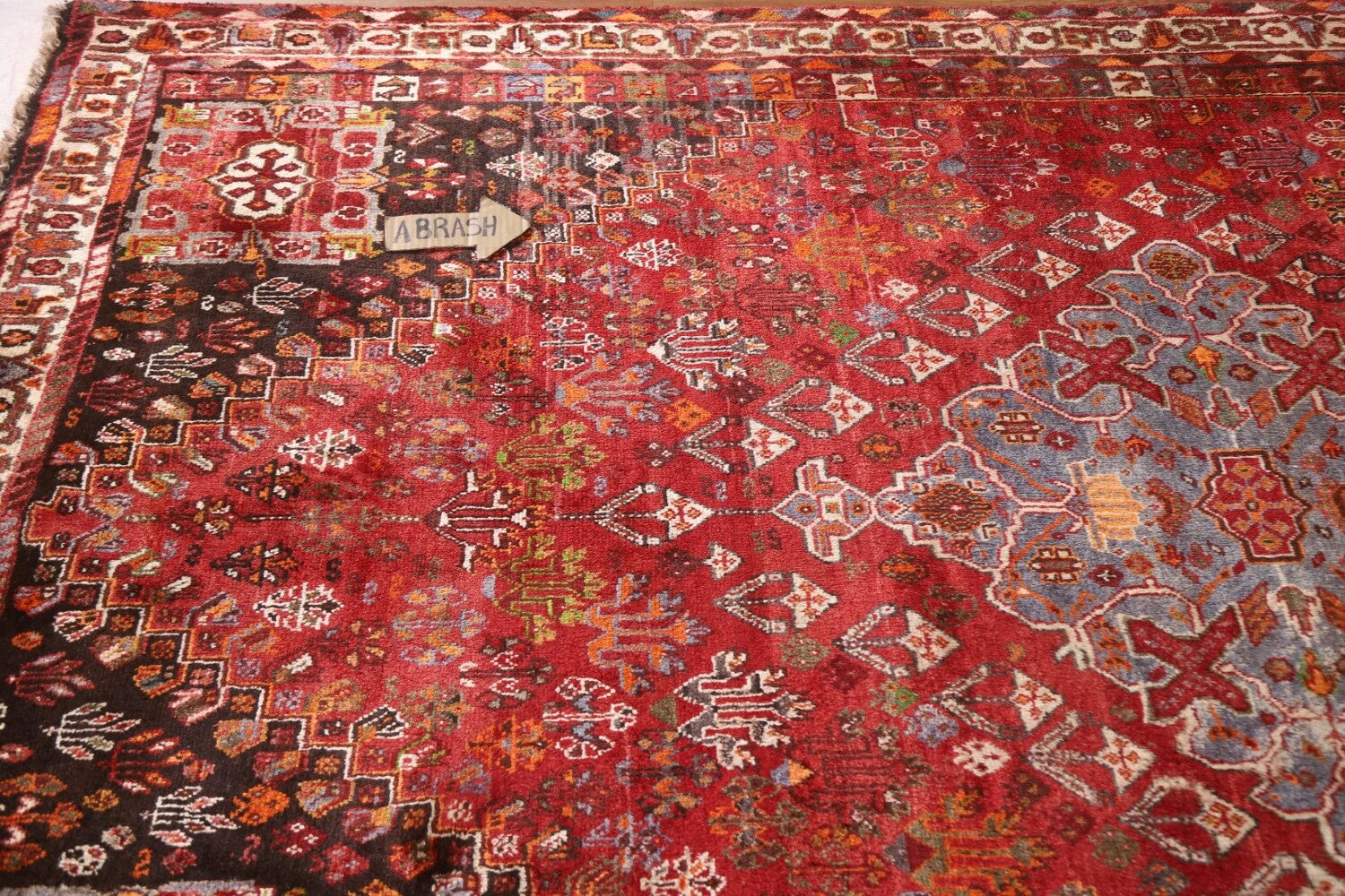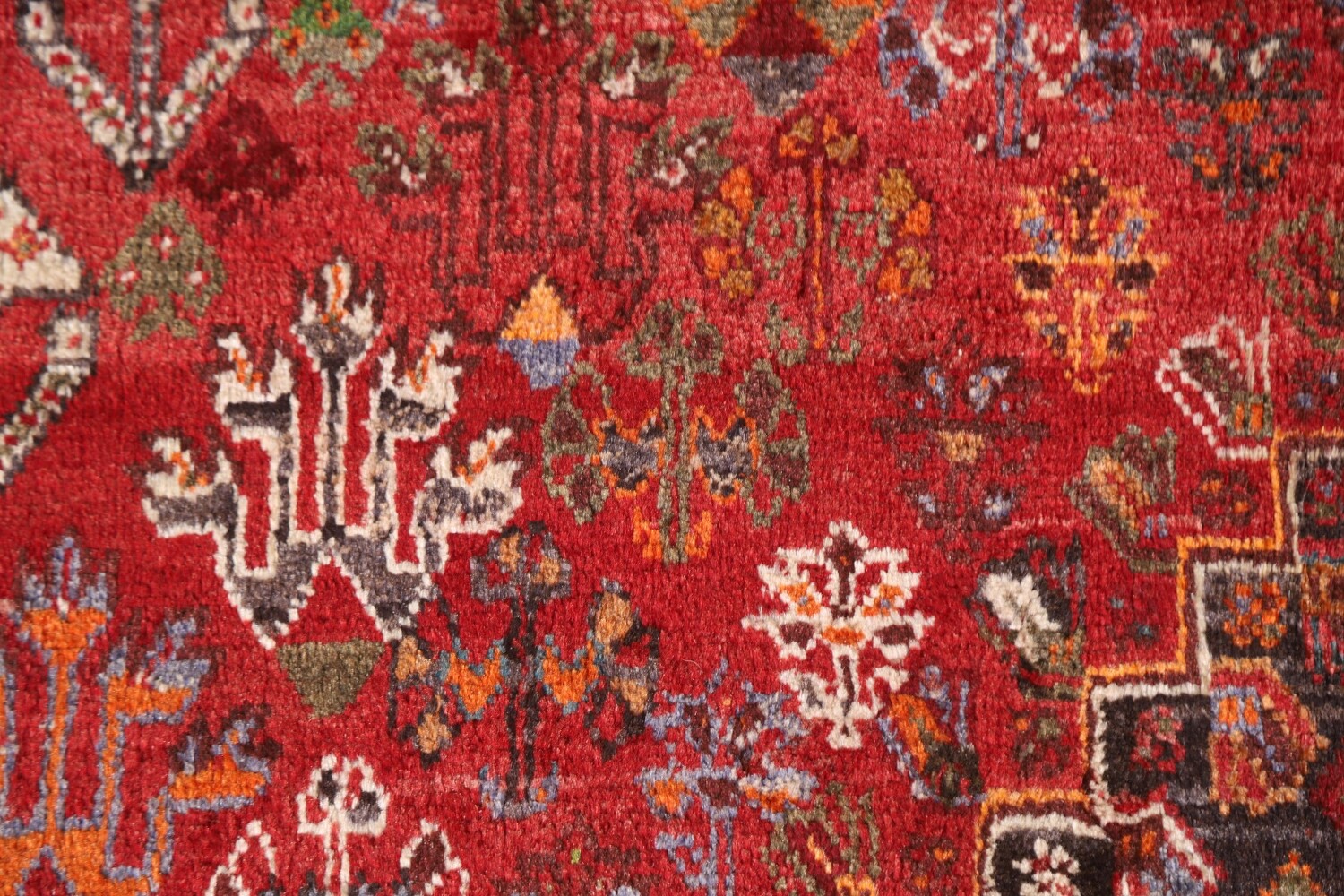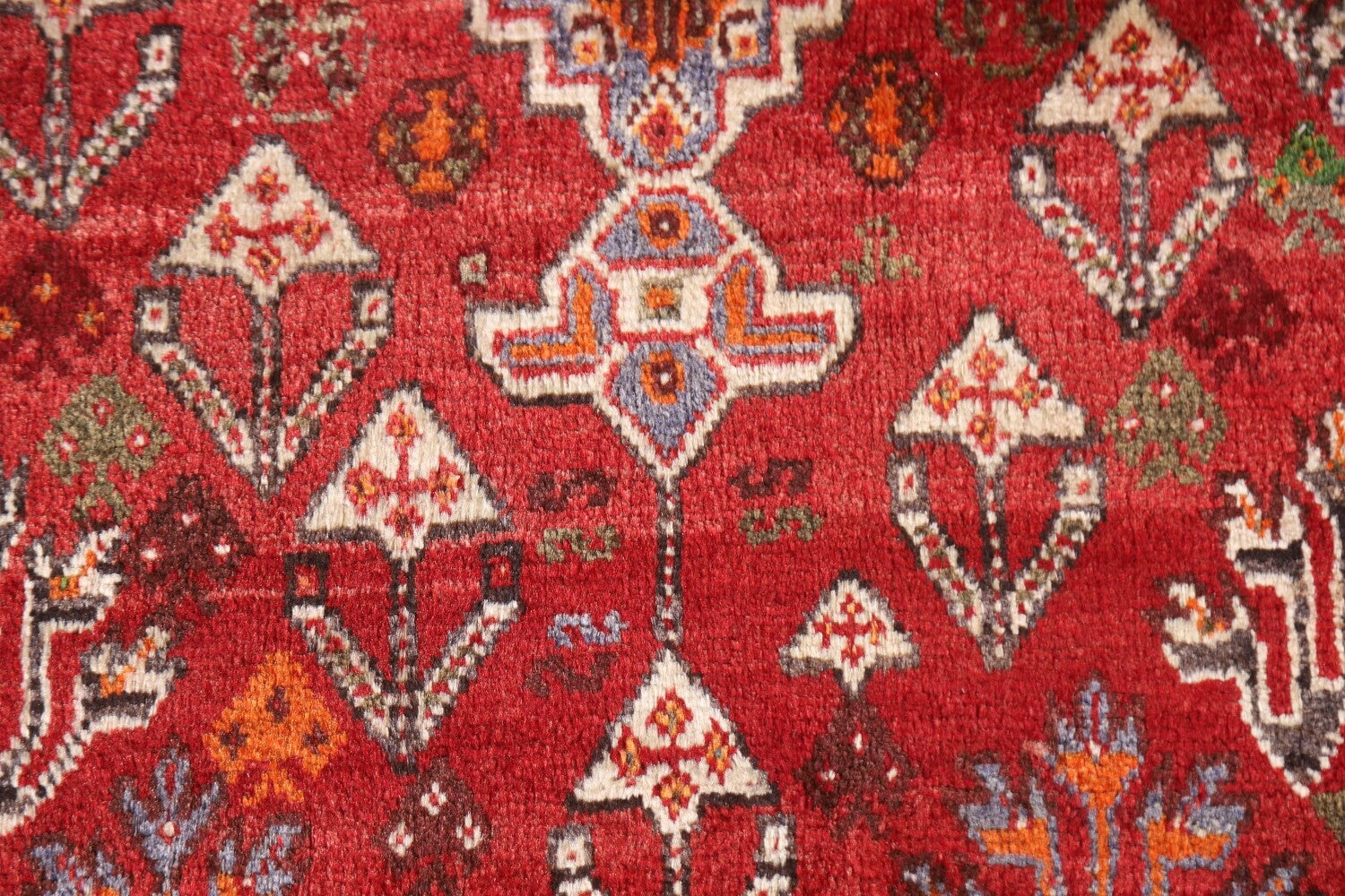 A Beautiful Genuine Persia ( Persia ) Shiraz rug is Hand Knotted by skillful weavers in Persia ( Persia ) with 100% Wool Material. This rug is in Very Good (Abrash) condition. dimensions are 8' 5'' X 5' 4'' in foot and 257 X 163 in centimeter. the primary color is Red.