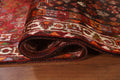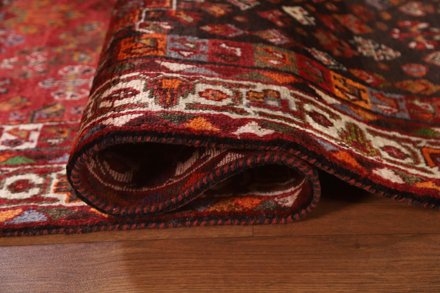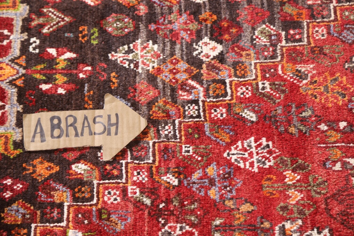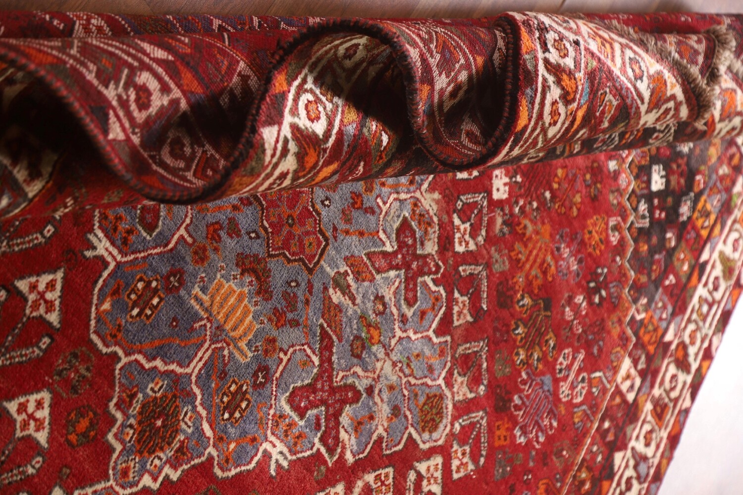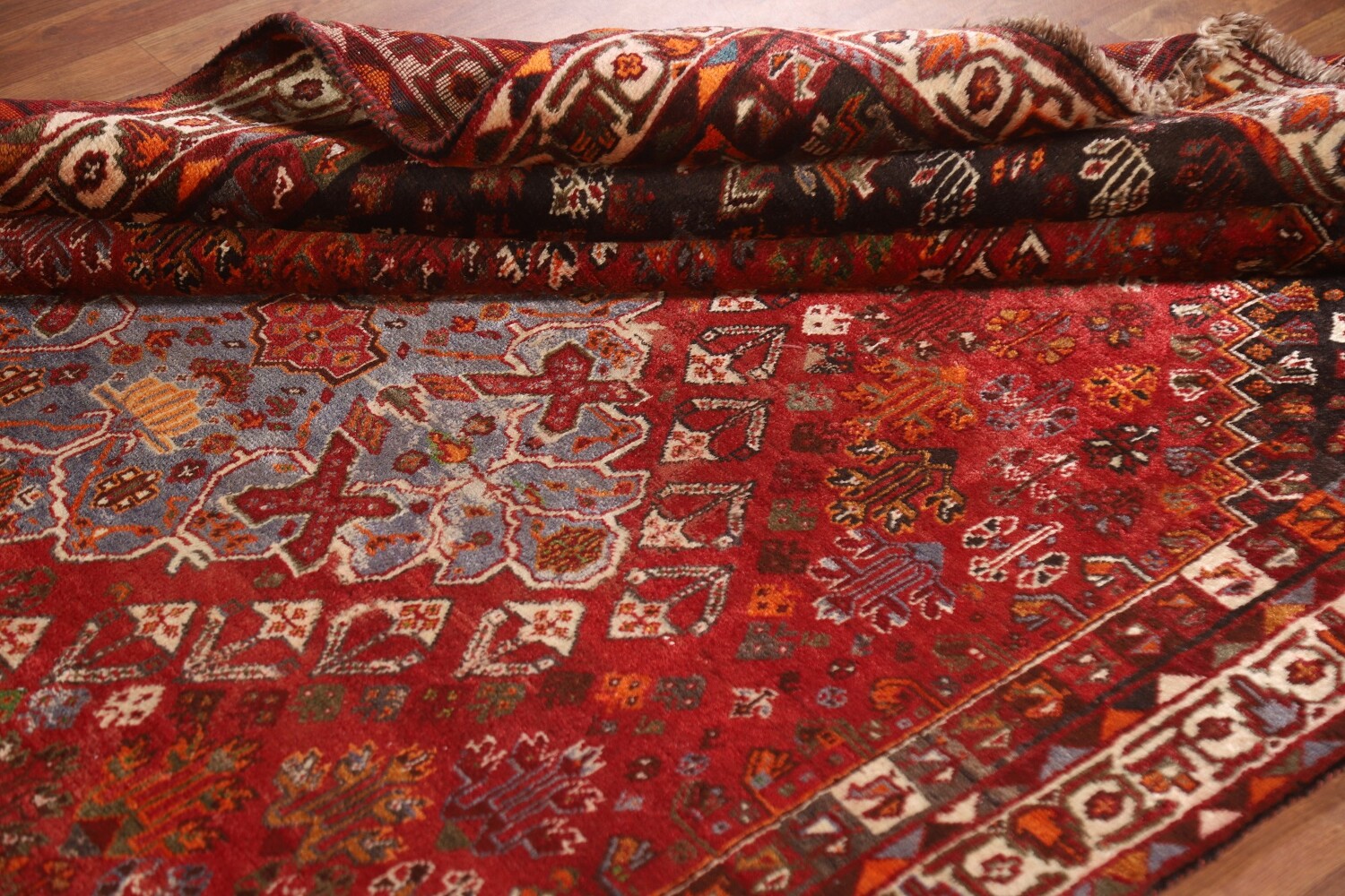 A Beautiful Genuine Persia ( Persia ) Shiraz rug is Hand Knotted by skillful weavers in Persia ( Persia ) with 100% Wool Material. This rug is in Very Good (Abrash) condition. dimensions are 8' 5'' X 5' 4'' in foot and 257 X 163 in centimeter. the primary color is Red.