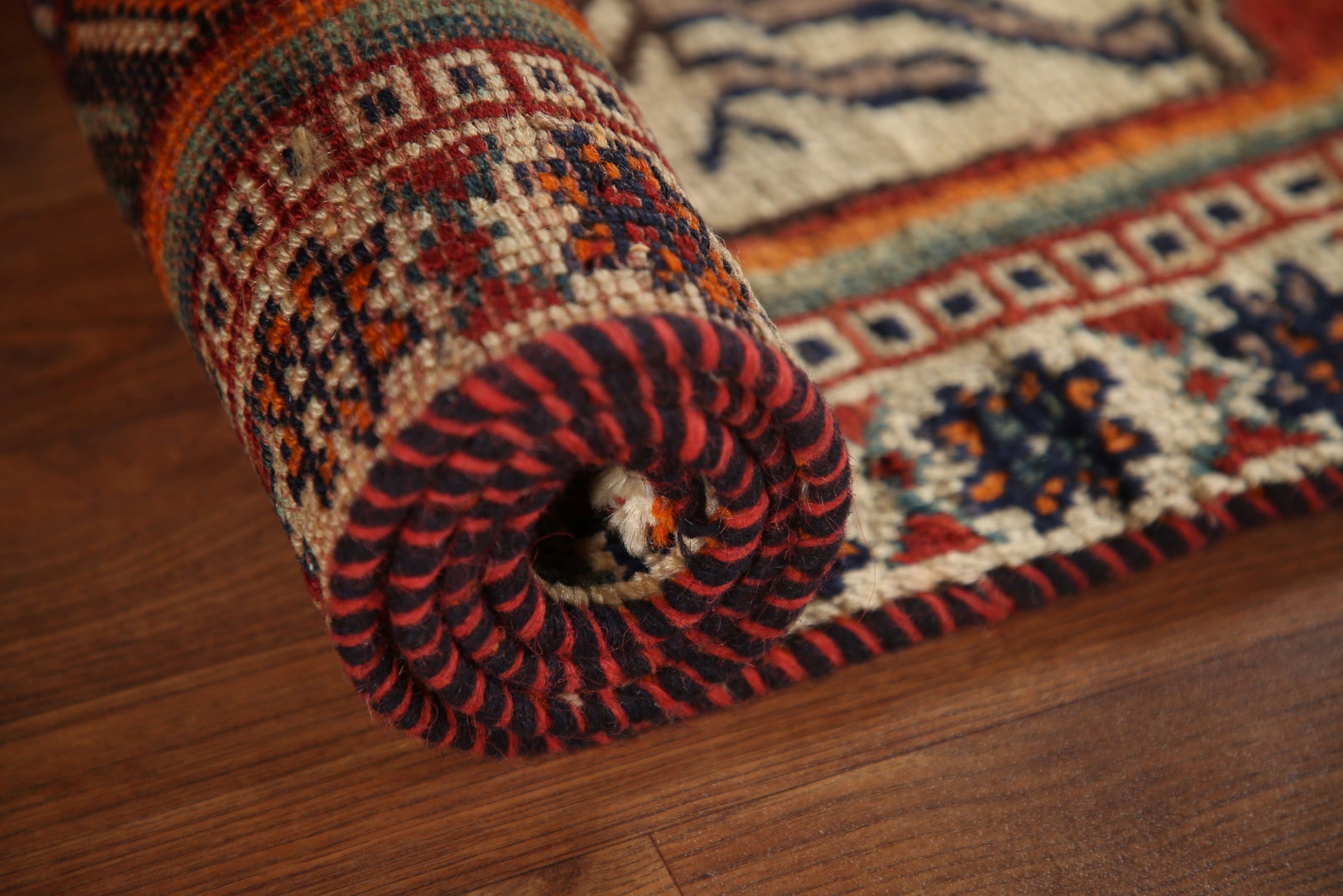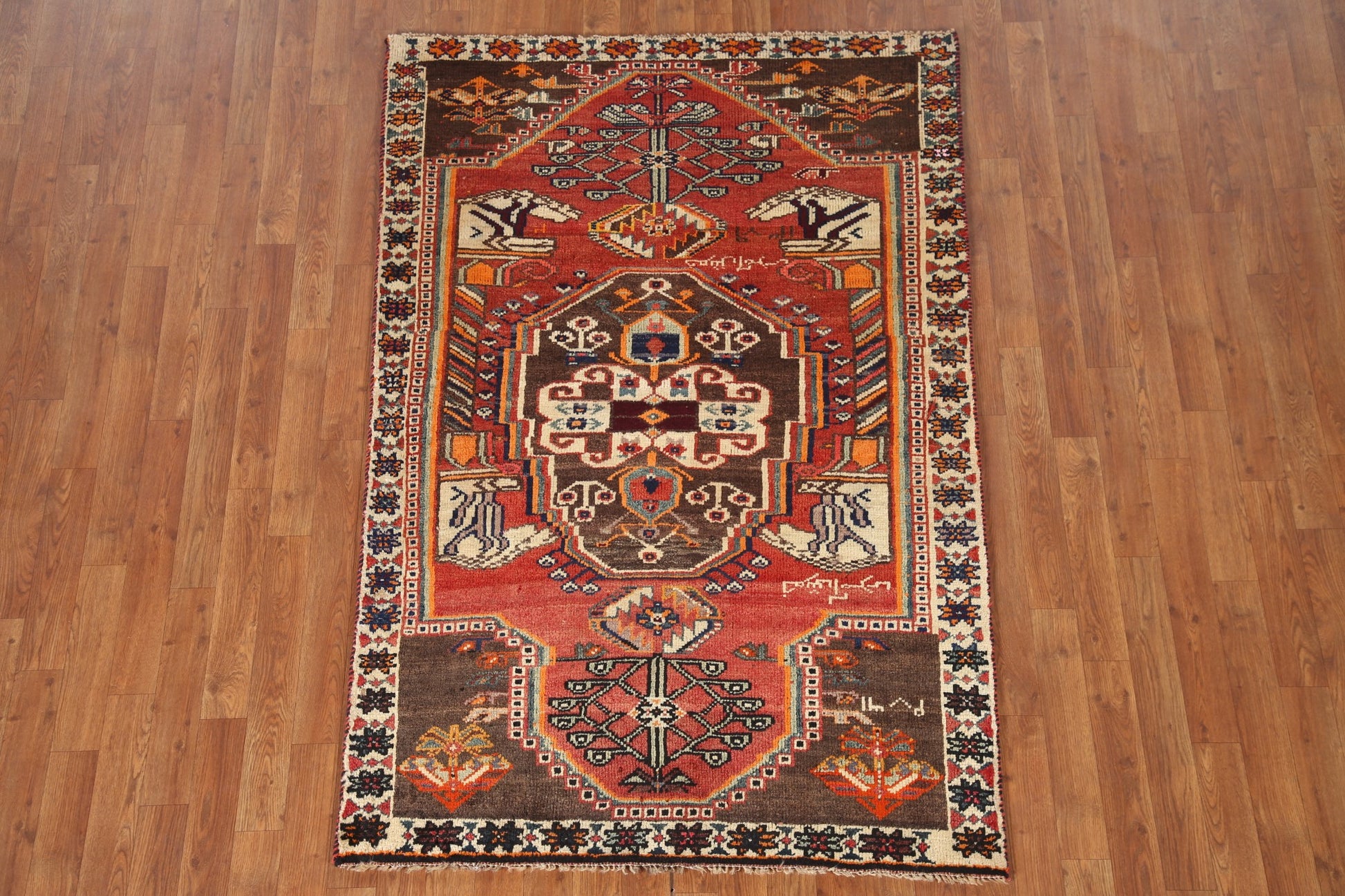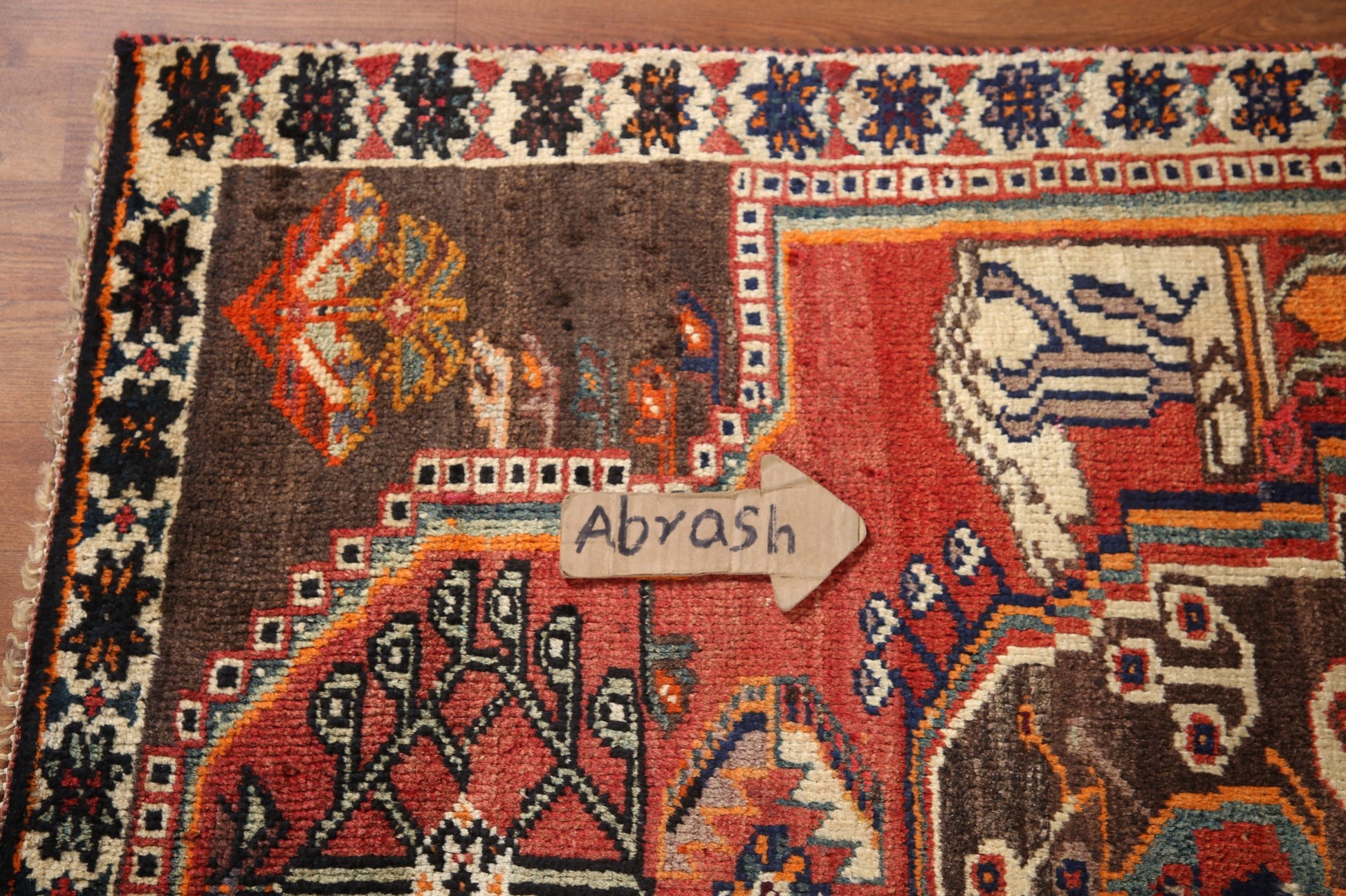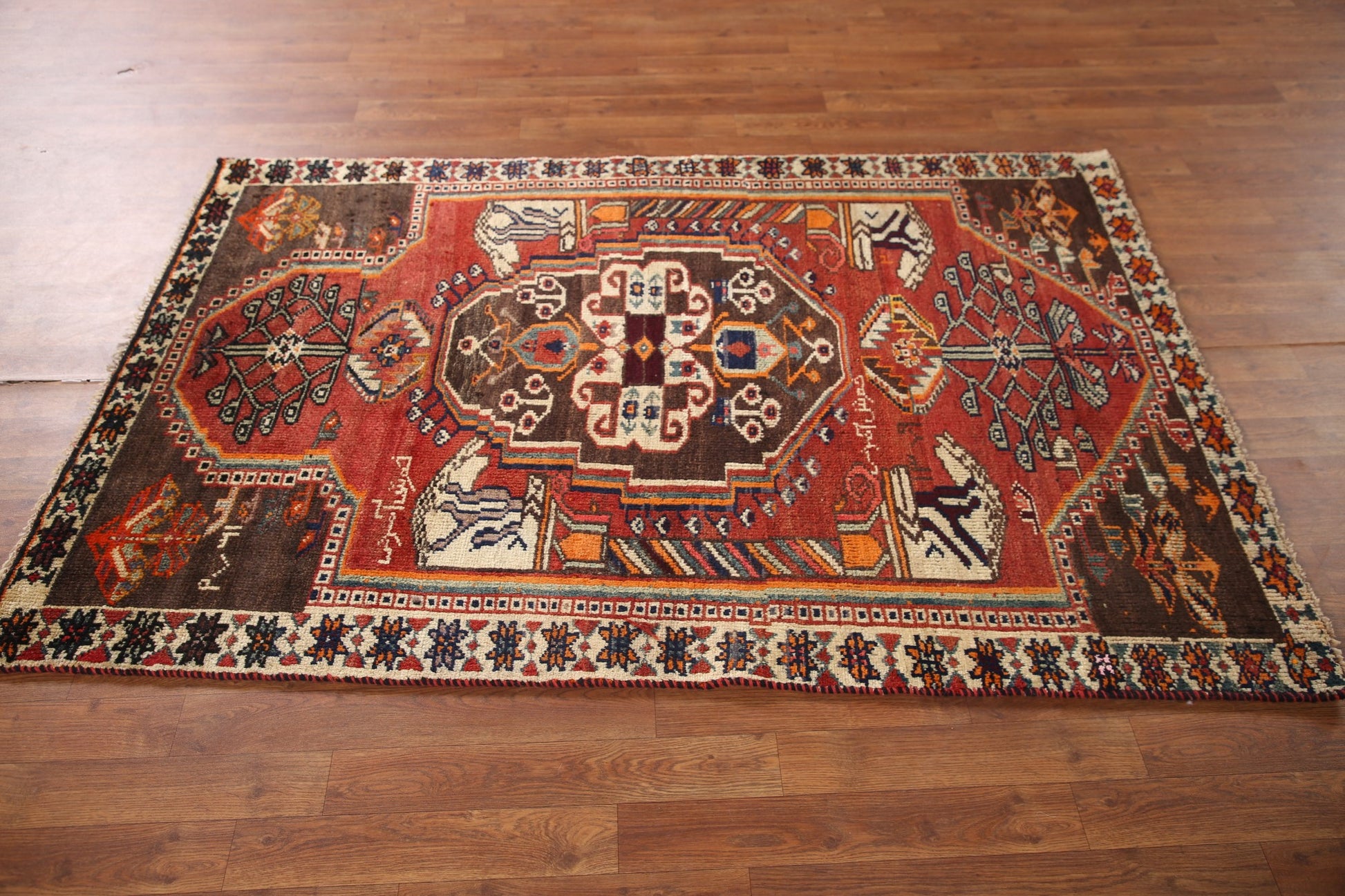 A Beautiful Genuine Persia ( Persia ) Shiraz rug is Hand Knotted by skillful weavers in Persia ( Persia ) with 100% Wool Material. This rug is in Very Good (Low Pile-Abrash) condition. dimensions are 5' 10'' X 3' 11'' in foot and 178 X 119 in centimeter. the primary color is Red.