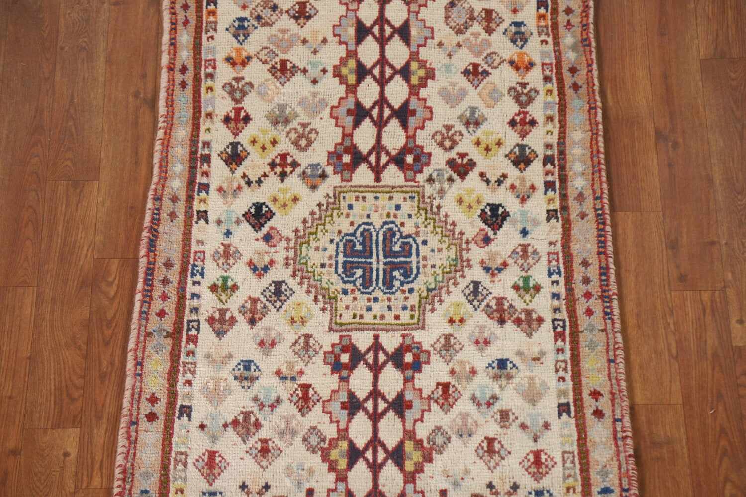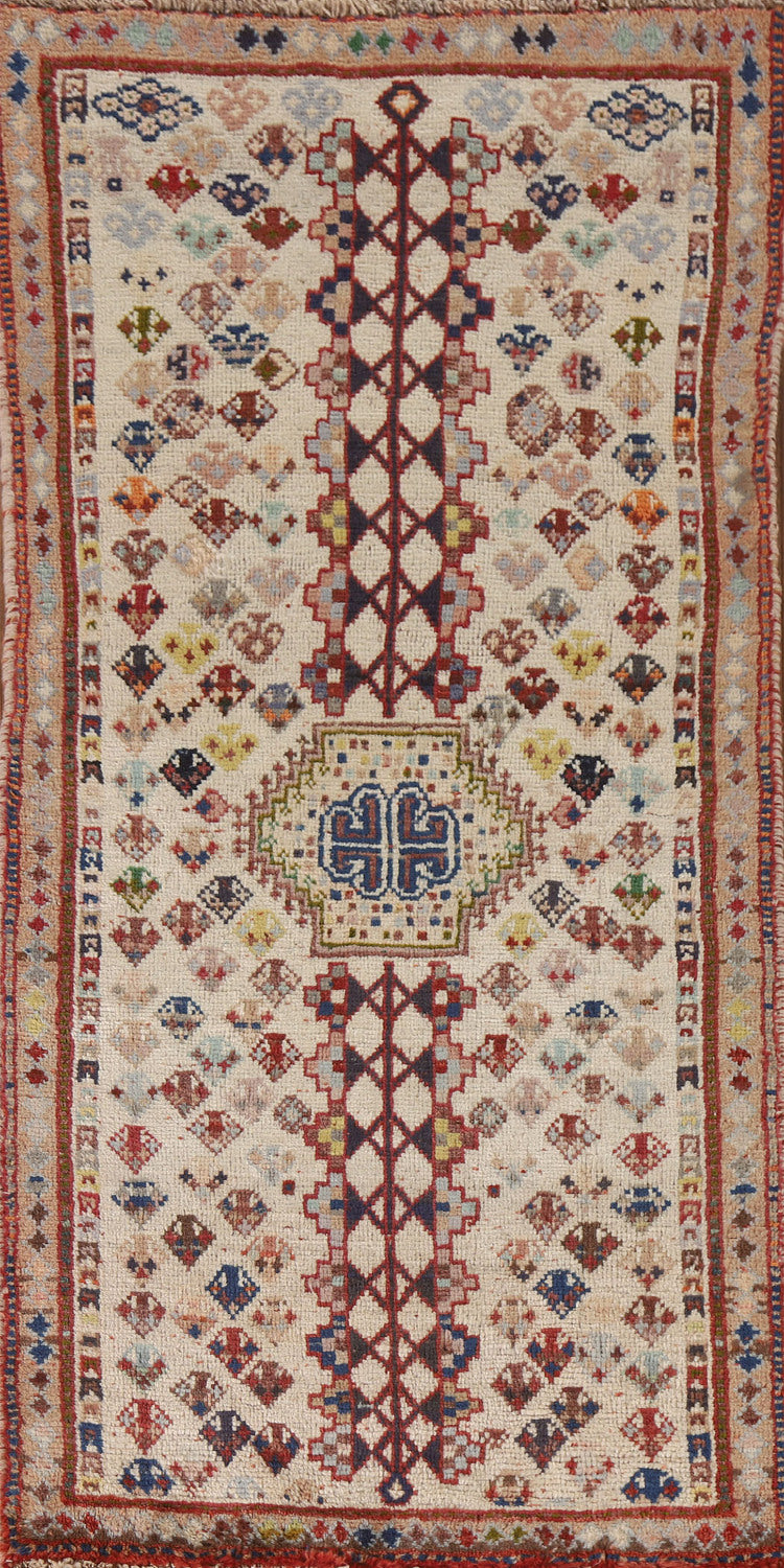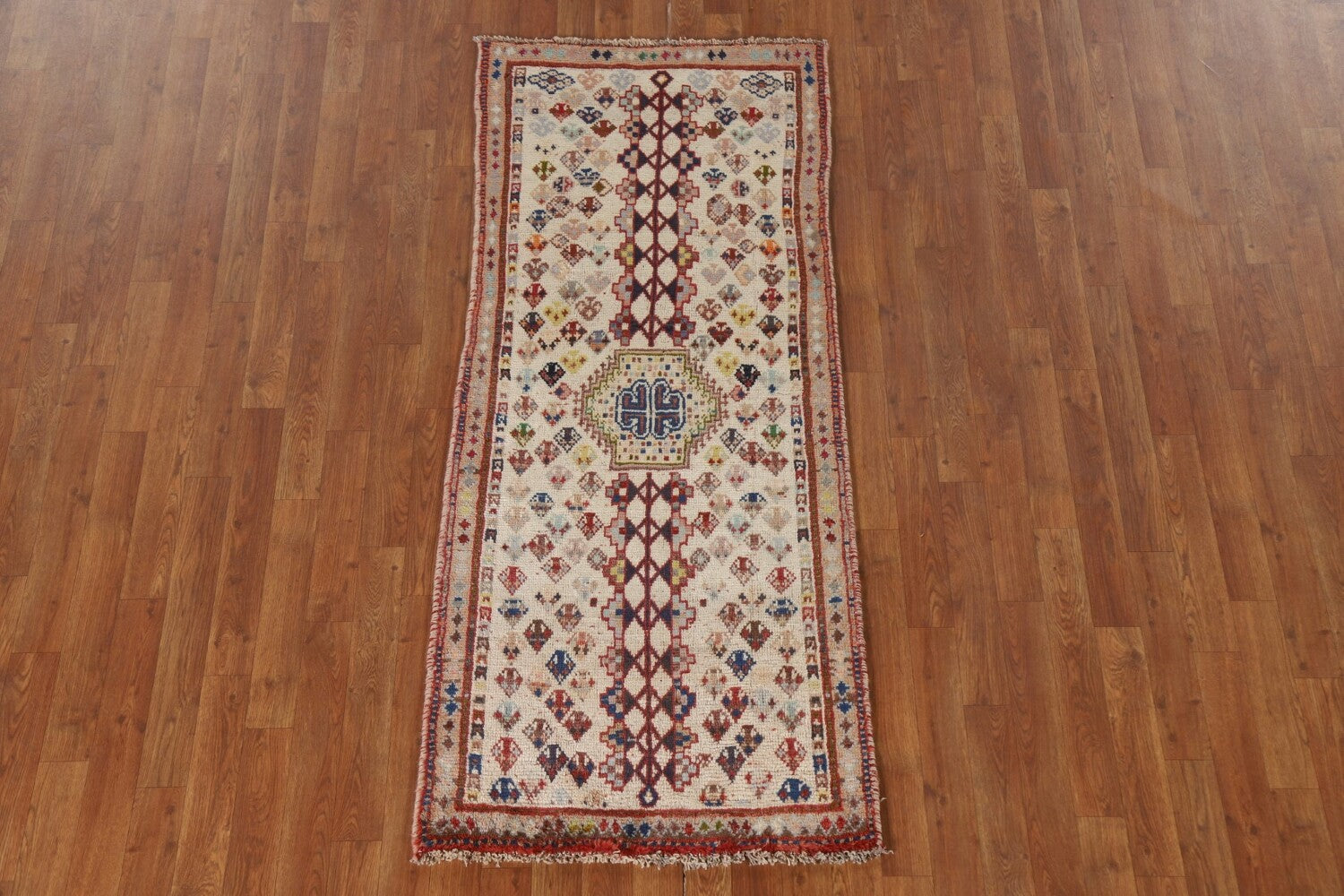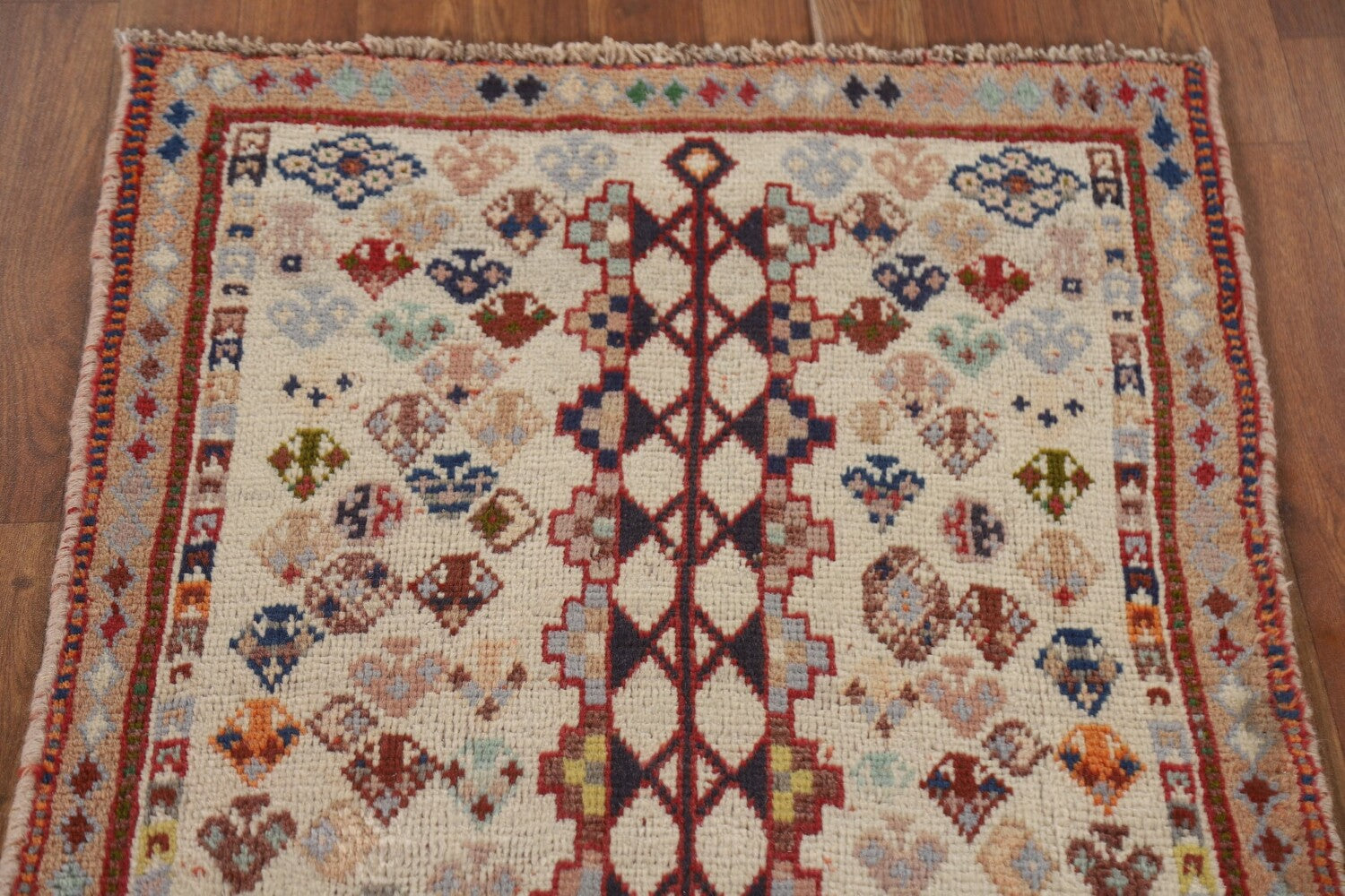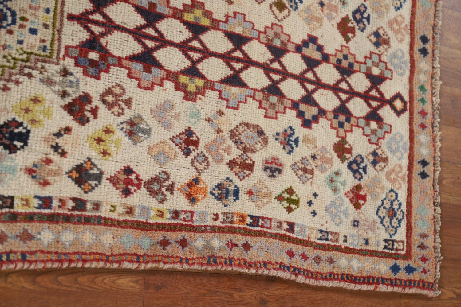 A Beautiful Genuine Persia ( Persia ) Shiraz rug is Hand Knotted by skillful weavers in Persia ( Persia ) with 100% Wool Material. This rug is in Very Good (Small Bleeding) condition. dimensions are 6' 0'' X 3' 7'' in foot and 183 X 109 in centimeter. the primary color is Beige & Ivories.
