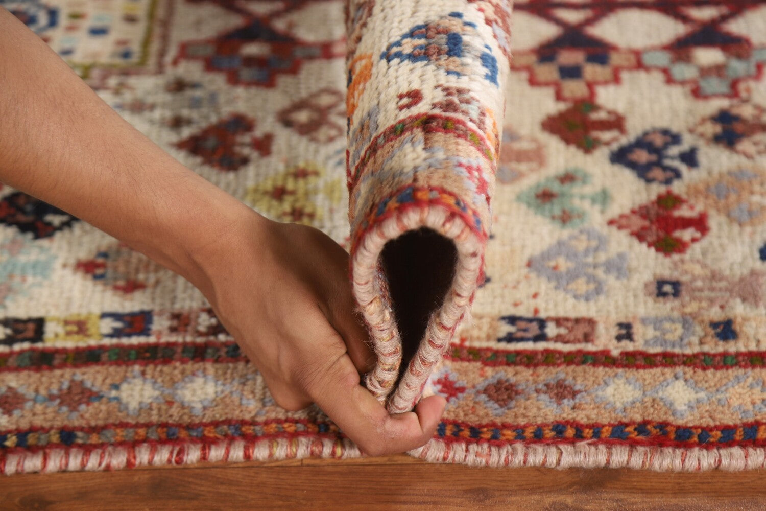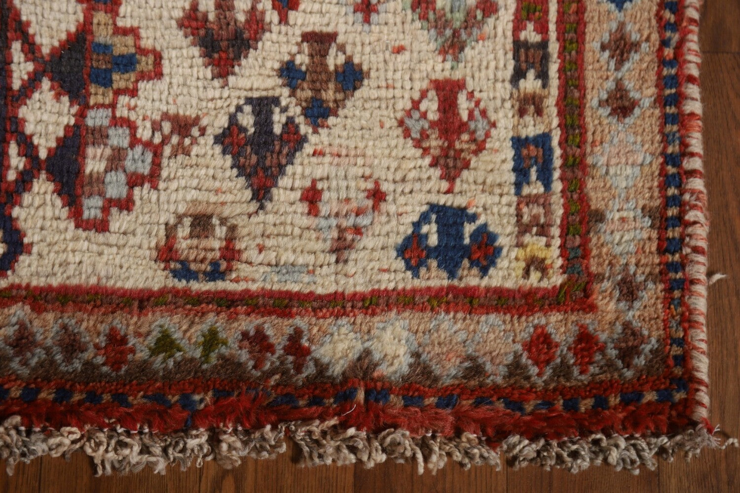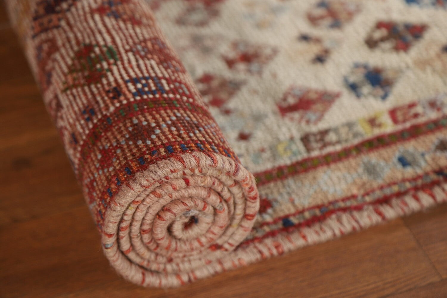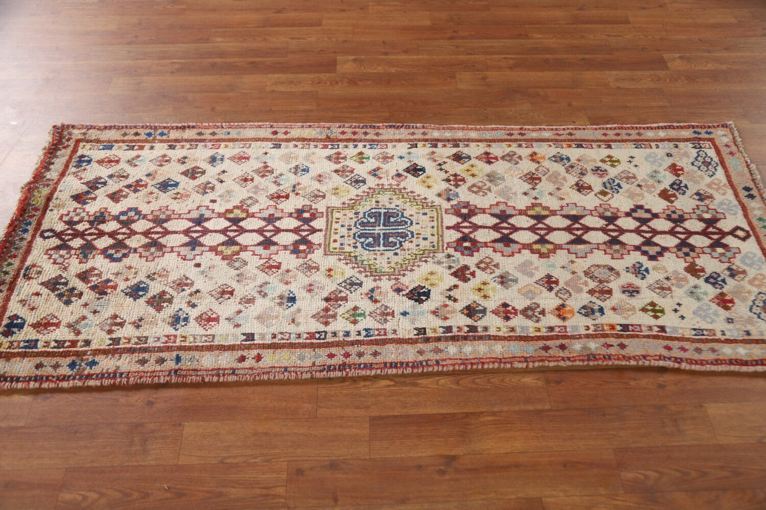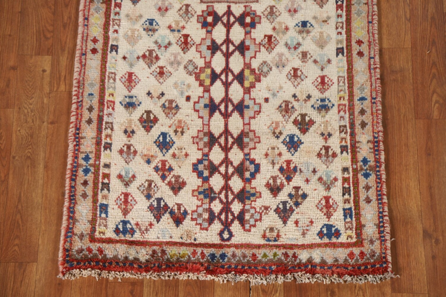 A Beautiful Genuine Persia ( Persia ) Shiraz rug is Hand Knotted by skillful weavers in Persia ( Persia ) with 100% Wool Material. This rug is in Very Good (Small Bleeding) condition. dimensions are 6' 0'' X 3' 7'' in foot and 183 X 109 in centimeter. the primary color is Beige & Ivories.