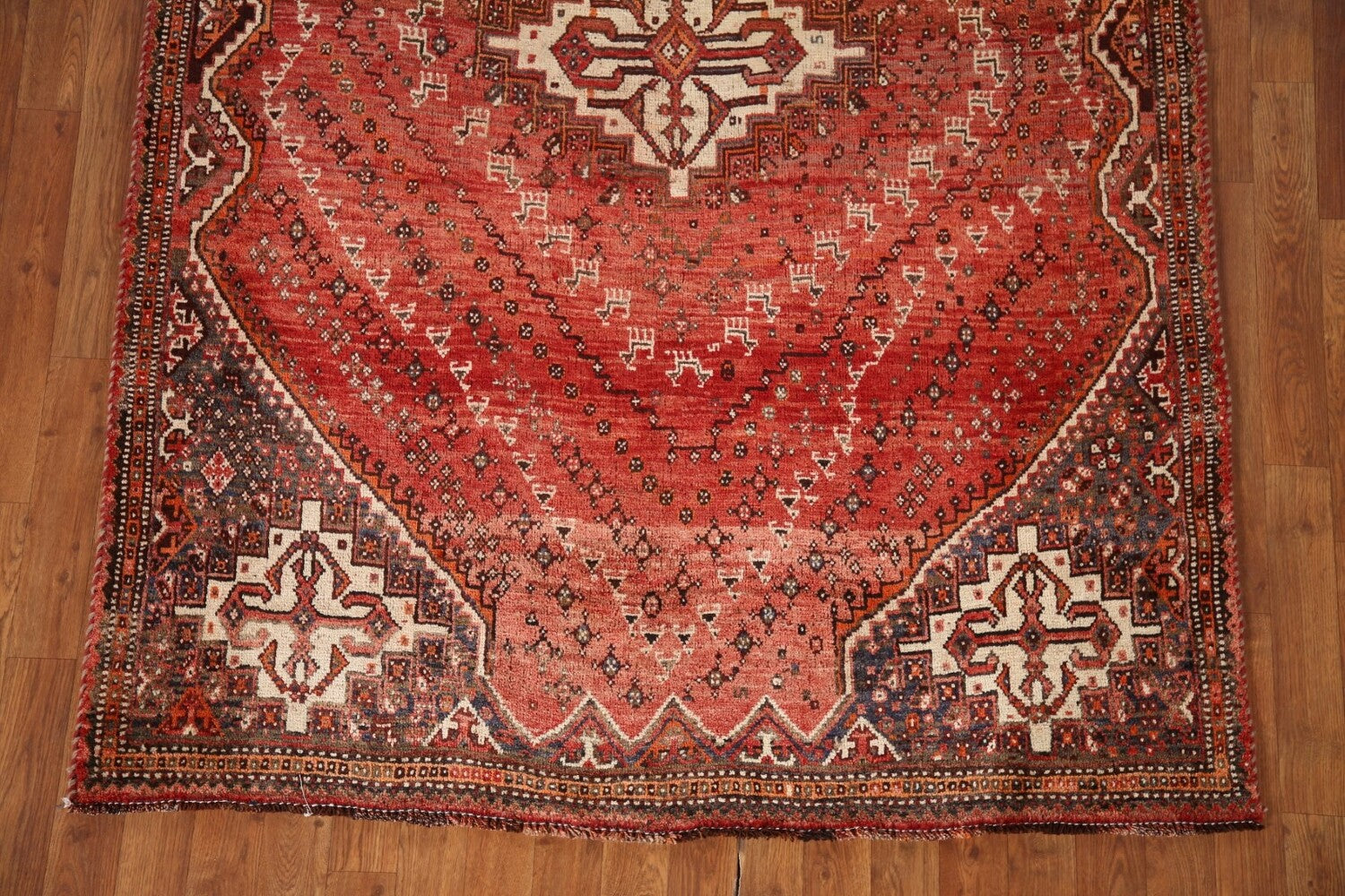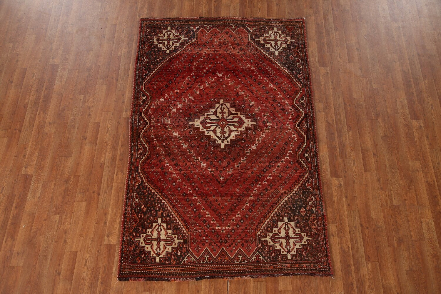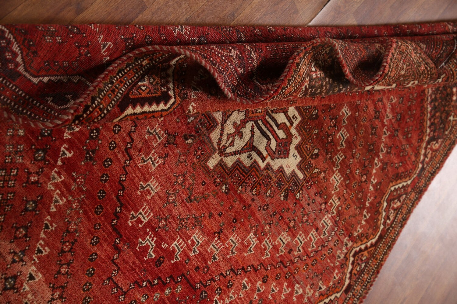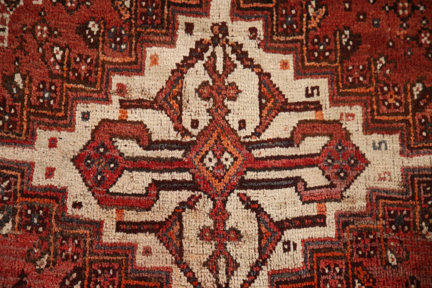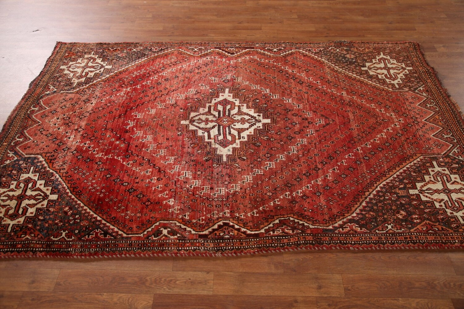 A Beautiful Genuine Persia ( Persia ) Shiraz rug is Hand Knotted by skillful weavers in Persia ( Persia ) with 100% Wool Material. This rug is in Very Good (Abrash) condition. dimensions are 7' 4'' X 4' 9'' in foot and 224 X 145 in centimeter. the primary color is Red.