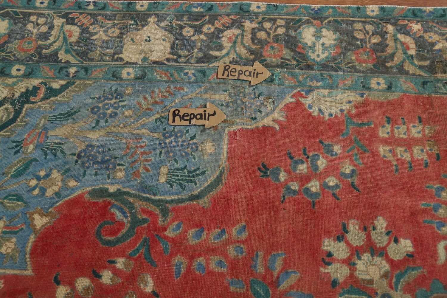 A Beautiful Genuine Persia ( Persia ) Tabriz rug is Hand Knotted by skillful weavers in Persia ( Persia ) with 100% Wool Material. This rug is in Good (Evenly Low Pile-Repair) condition. dimensions are 12' 4'' X 9' 9'' in foot and 376 X 297 in centimeter. the primary color is Oranges & Rust.