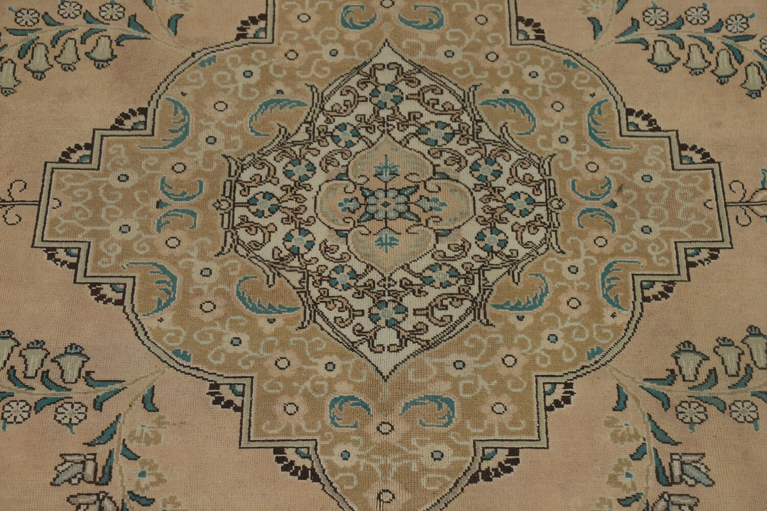 A Beautiful Genuine Persia ( Persia ) Tabriz rug is Hand Knotted by skillful weavers in Persia ( Persia ) with 100% Wool Material. This rug is in Good ( Low Pile ) condition. dimensions are 12' 8'' X 9' 7'' in foot and 386 X 292 in centimeter. the primary color is Peach.
