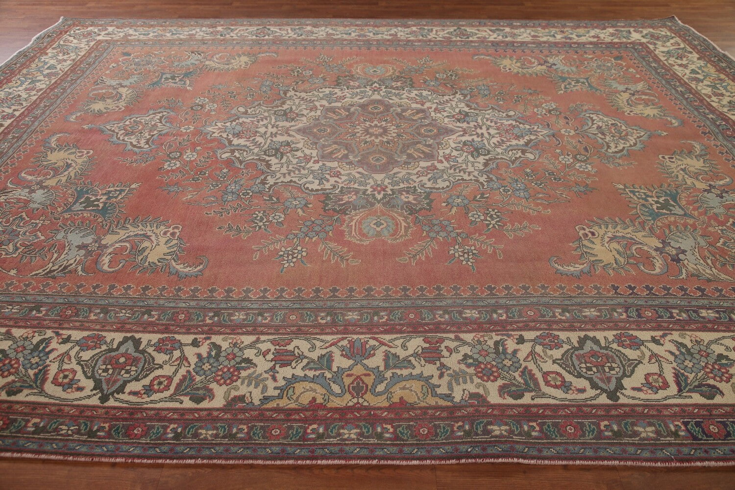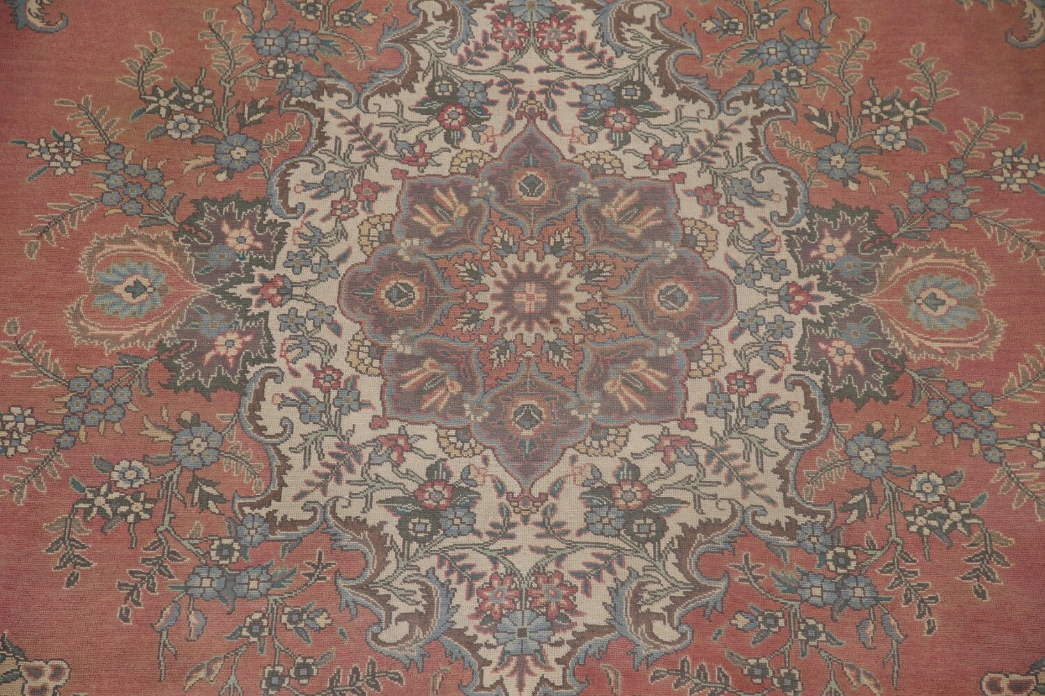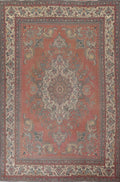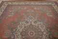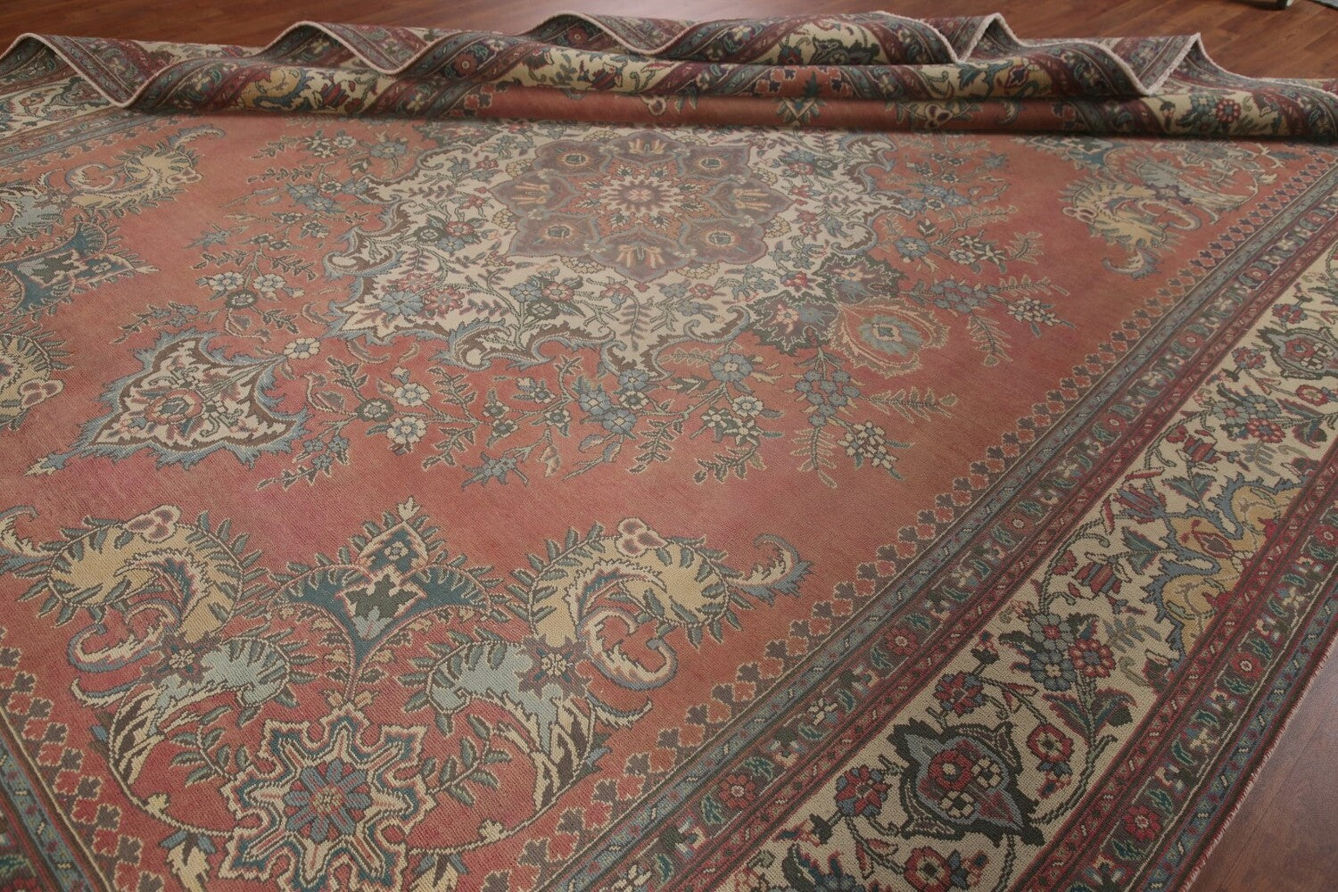 A Beautiful Genuine Persia ( Persia ) Tabriz rug is Hand Knotted by skillful weavers in Persia ( Persia ) with 100% Wool Material. This rug is in Very Good (Low Pile) condition. dimensions are 12' 11'' X 9' 10'' in foot and 394 X 300 in centimeter. the primary color is Pink.