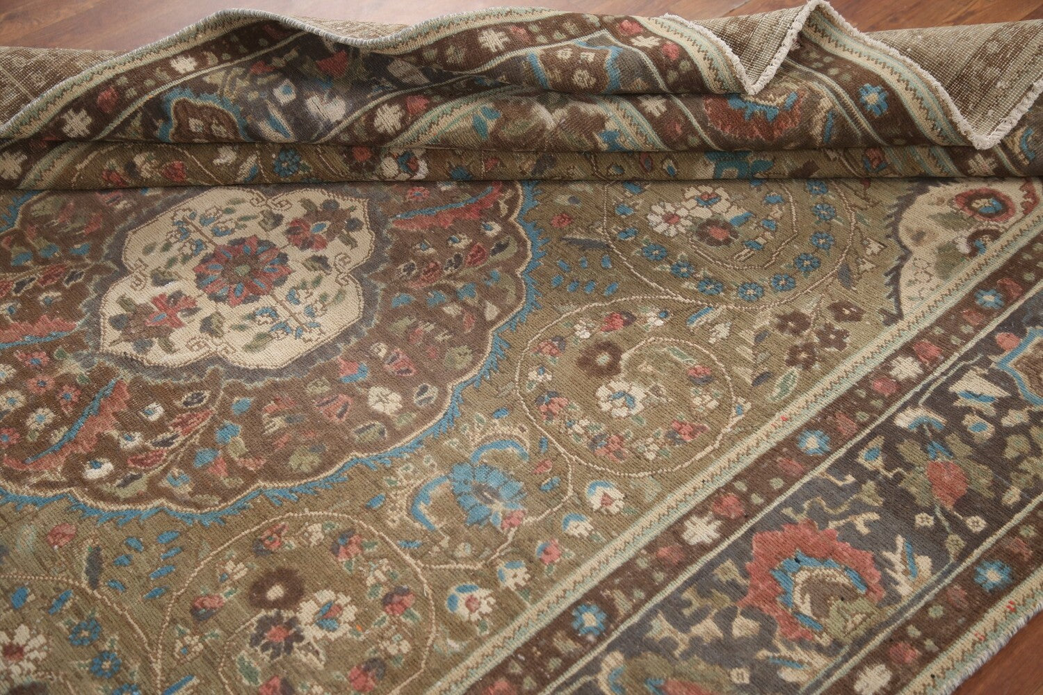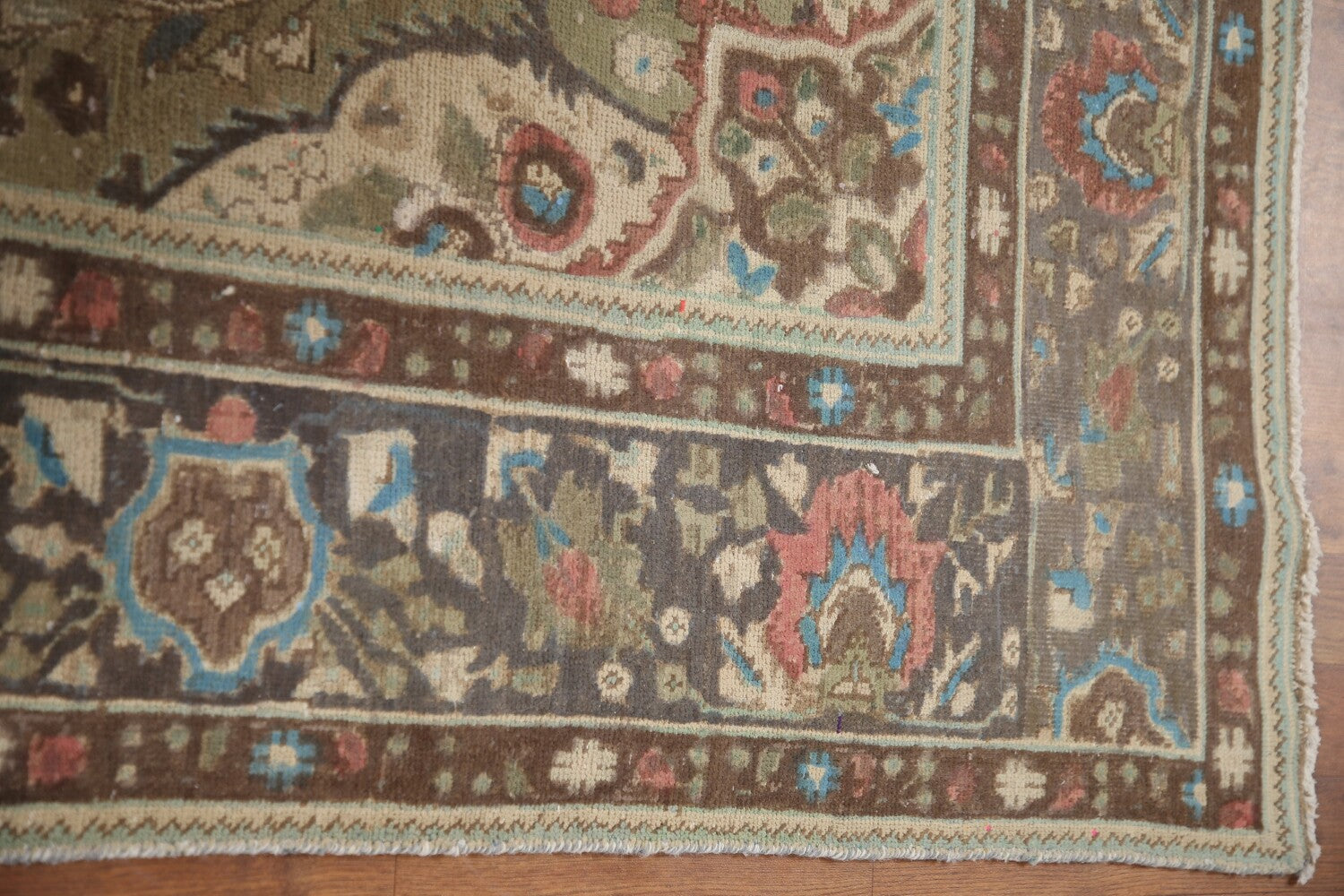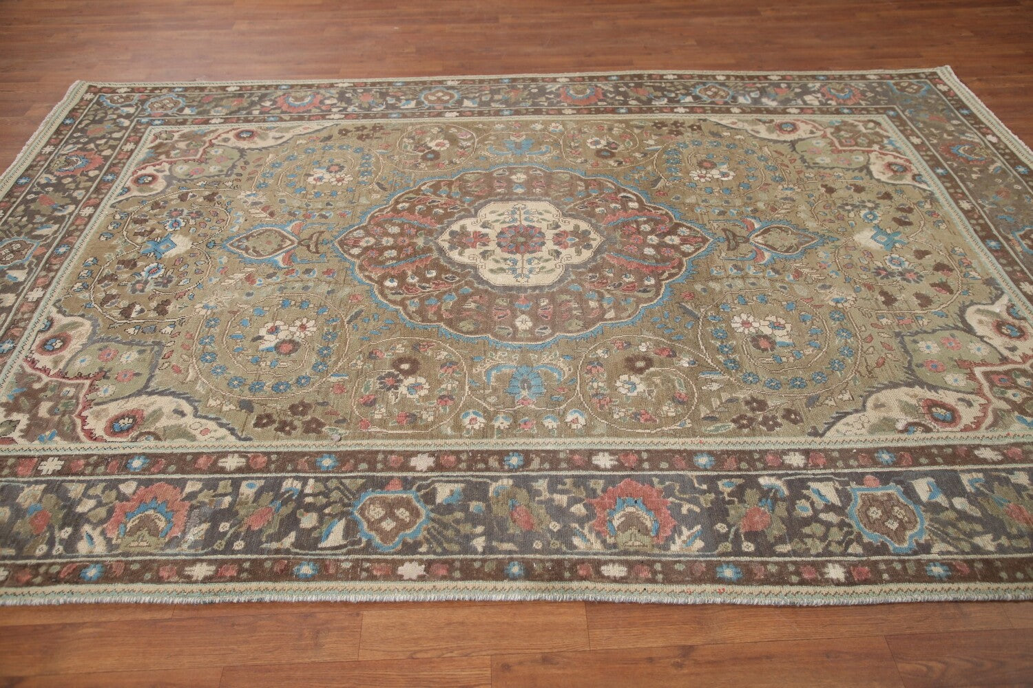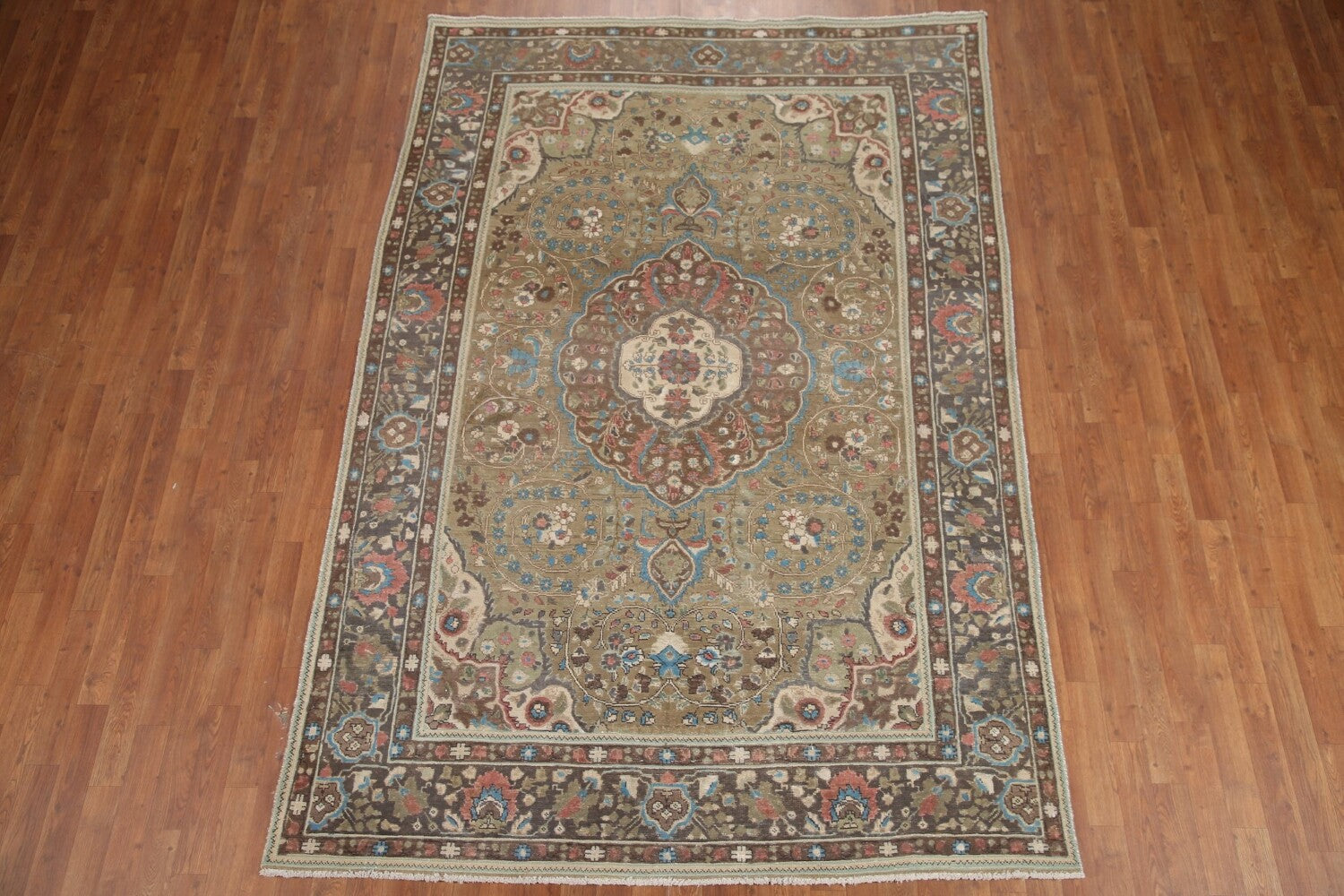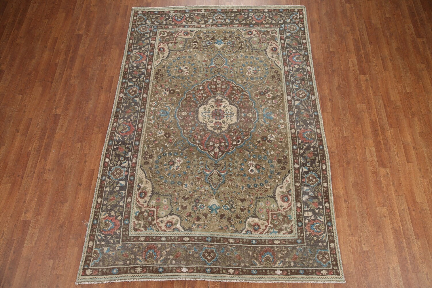 A Beautiful Genuine Persia ( Persia ) Tabriz rug is Hand Knotted by skillful weavers in Persia ( Persia ) with 100% Wool Material. This rug is in Very Good (Evenly Low Pile-Repair) condition. dimensions are 9' 5'' X 6' 4'' in foot and 287 X 193 in centimeter. the primary color is Green.