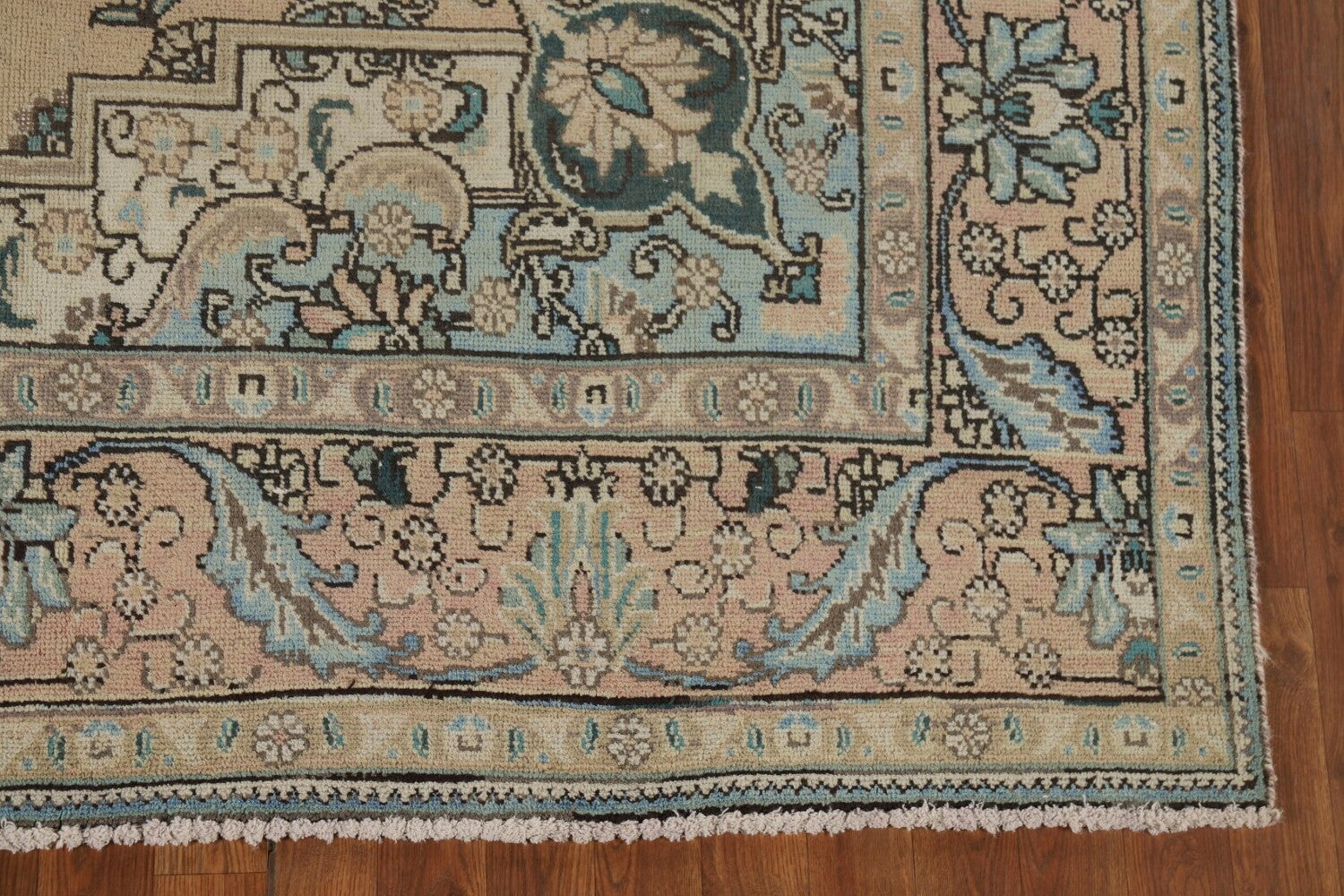 A Beautiful Genuine Persia ( Persia ) Tabriz rug is Hand Knotted by skillful weavers in Persia ( Persia ) with 100% Wool Material. This rug is in Very Good (Evenly Low Pile) condition. dimensions are 9' 8'' X 6' 8'' in foot and 295 X 203 in centimeter. the primary color is Peach.