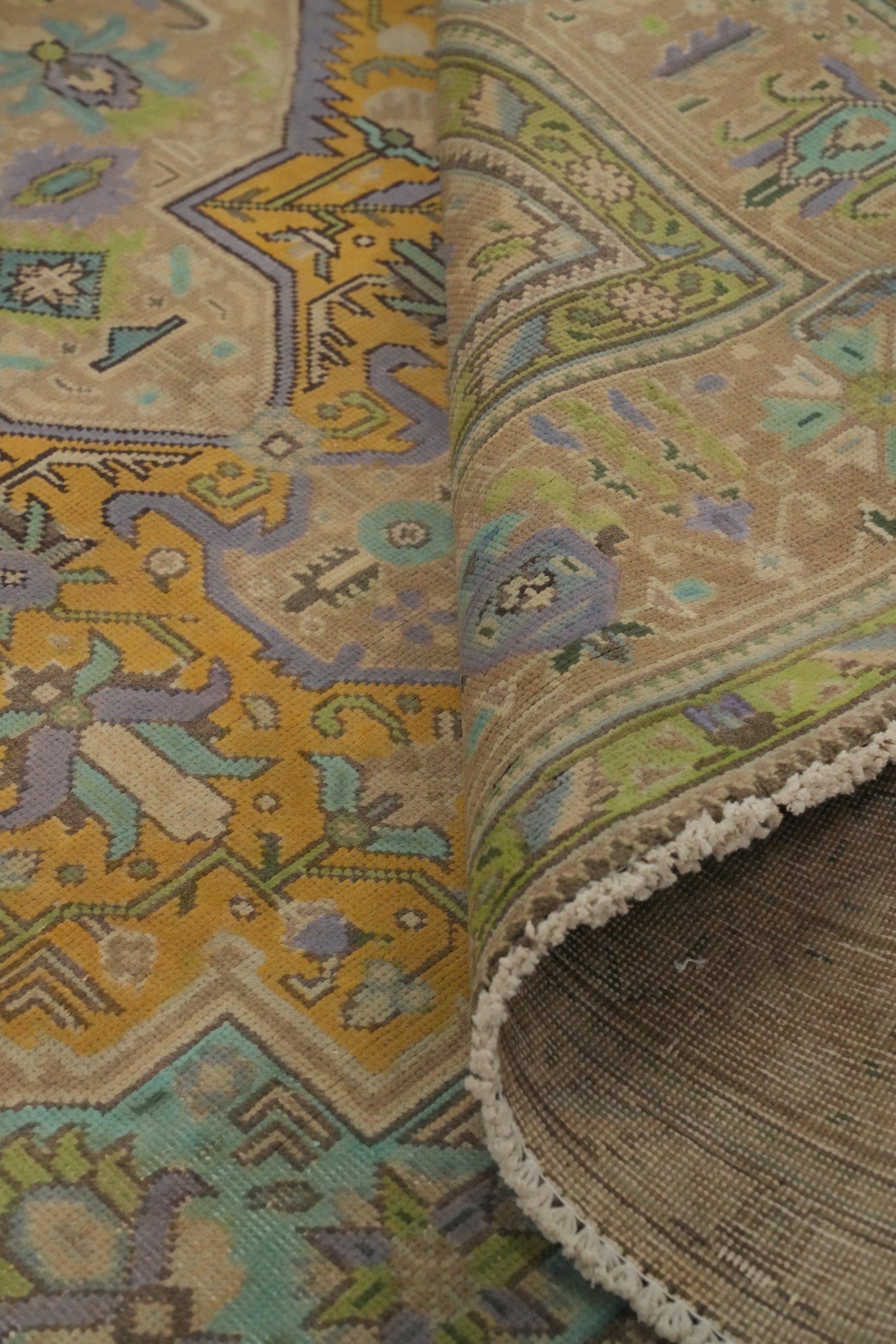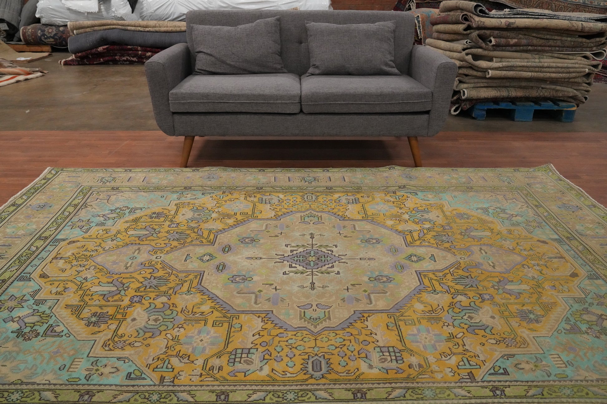 A Beautiful Genuine Persia ( Persia ) Tabriz rug is Hand Knotted by skillful weavers in Persia ( Persia ) with 100% Wool Material. This rug is in Very Good (Evenly Low Pile) condition. dimensions are 9' 6'' X 6' 7'' in foot and 290 X 201 in centimeter. the primary color is Yellow & Gold.
