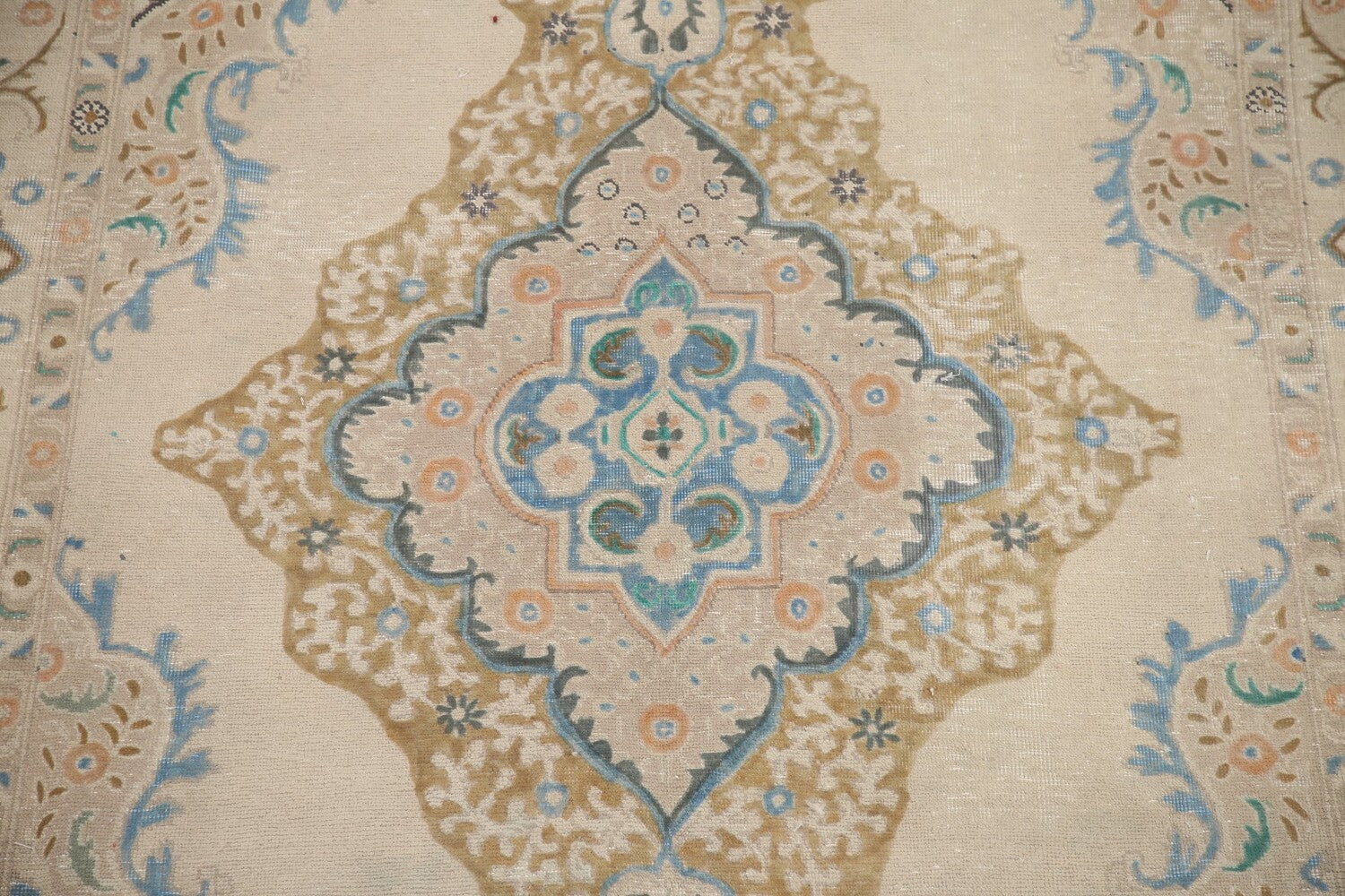 A Beautiful Genuine Persia ( Persia ) Tabriz rug is Hand Knotted by skillful weavers in Persia ( Persia ) with 100% Wool Material. This rug is in Very Good ( Evenly Low-Pile) condition. dimensions are 9' 5'' X 6' 7'' in foot and 287 X 201 in centimeter. the primary color is Beige & Ivories.