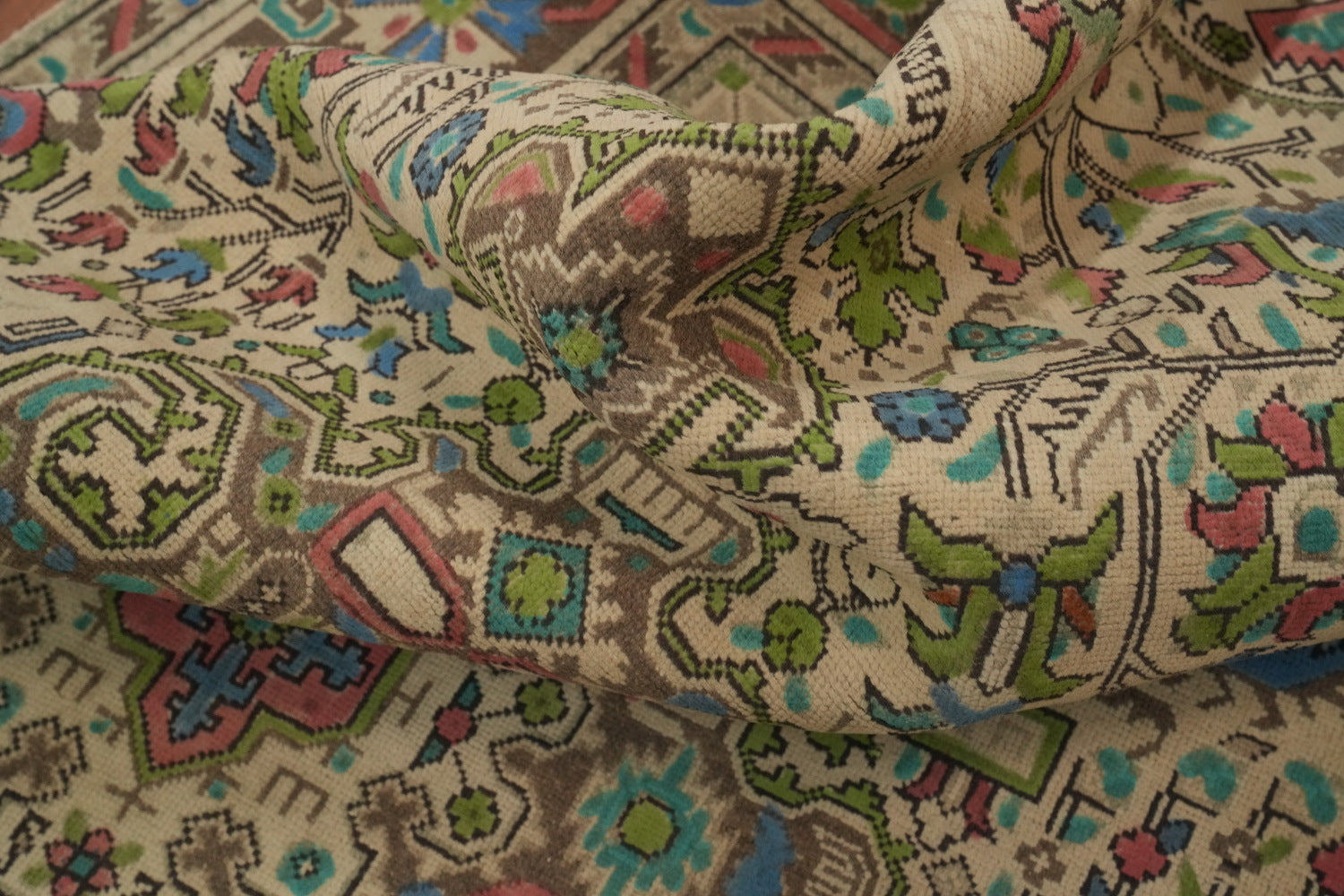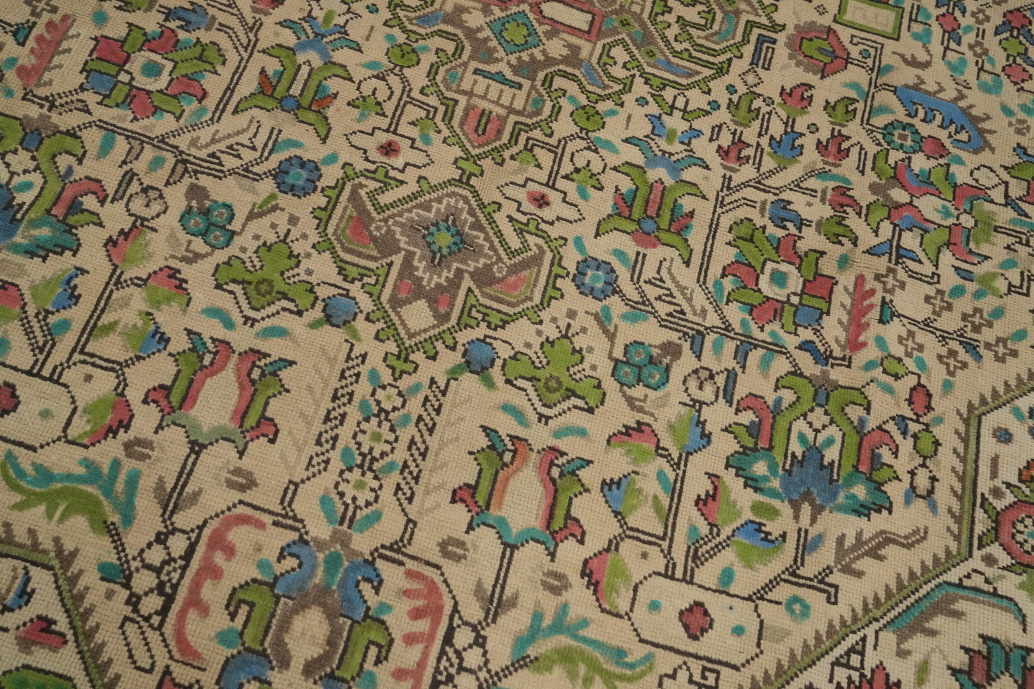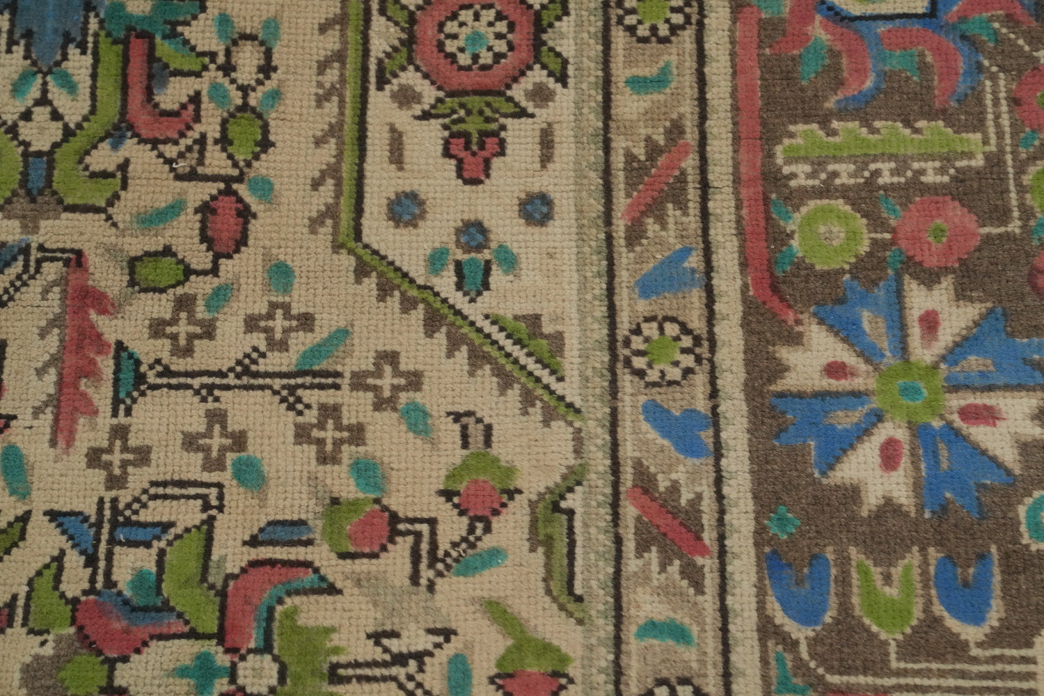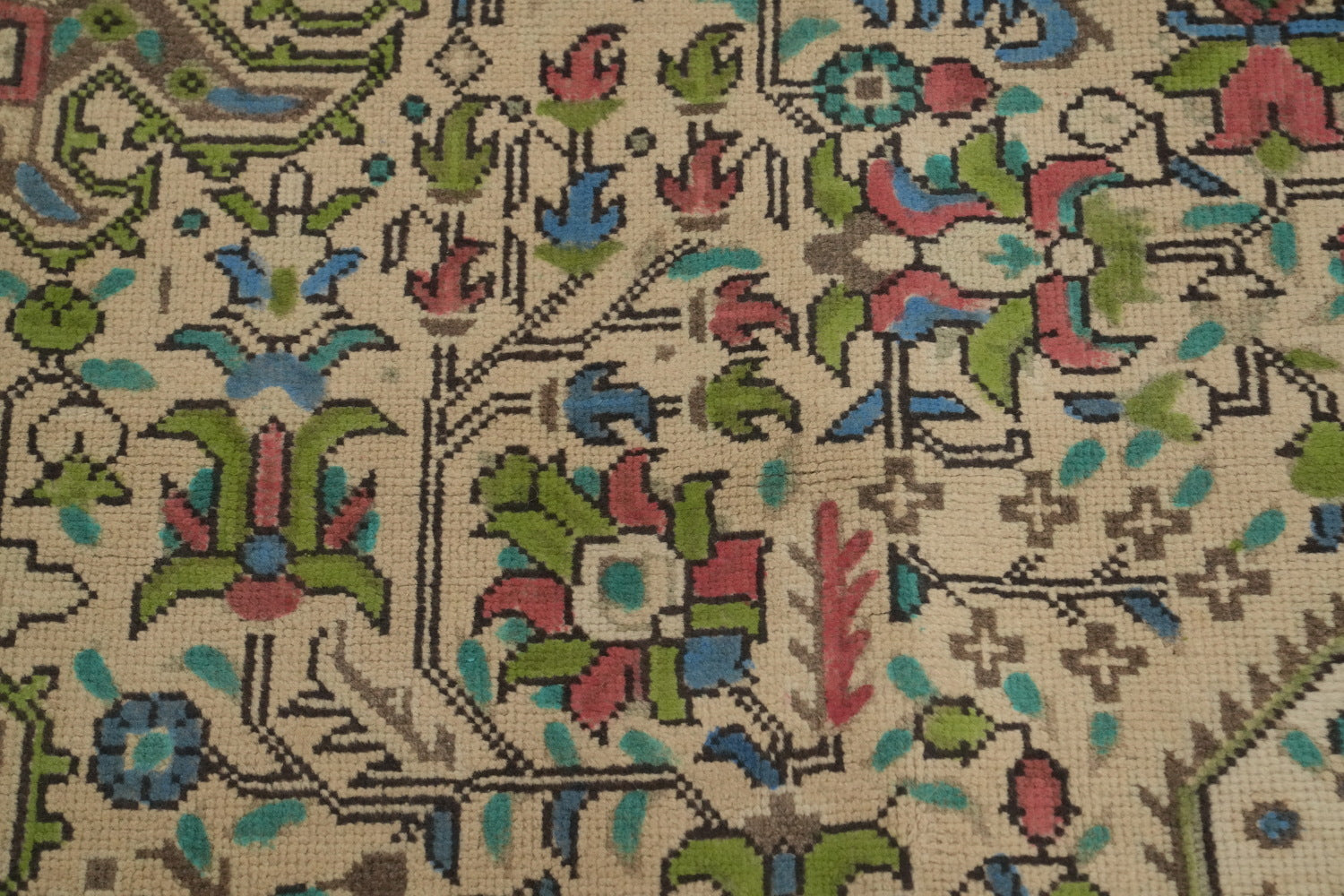 A Beautiful Genuine Persia ( Persia ) Tabriz rug is Hand Knotted by skillful weavers in Persia ( Persia ) with 100% Wool Material. This rug is in very good (small low pile) condition. dimensions are 9' 4'' X 6' 8'' in foot and 284 X 203 in centimeter. the primary color is Beige & Ivories.