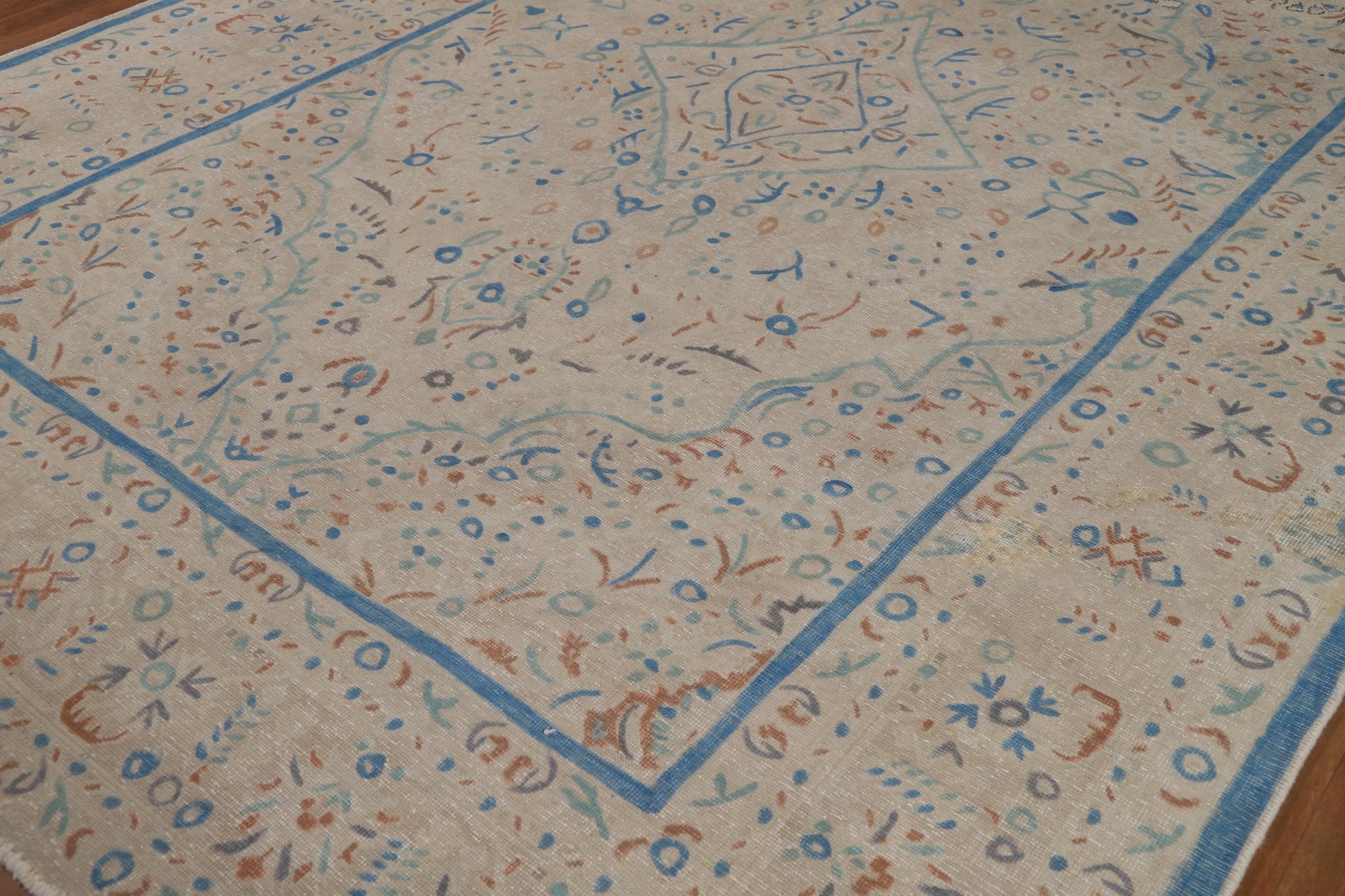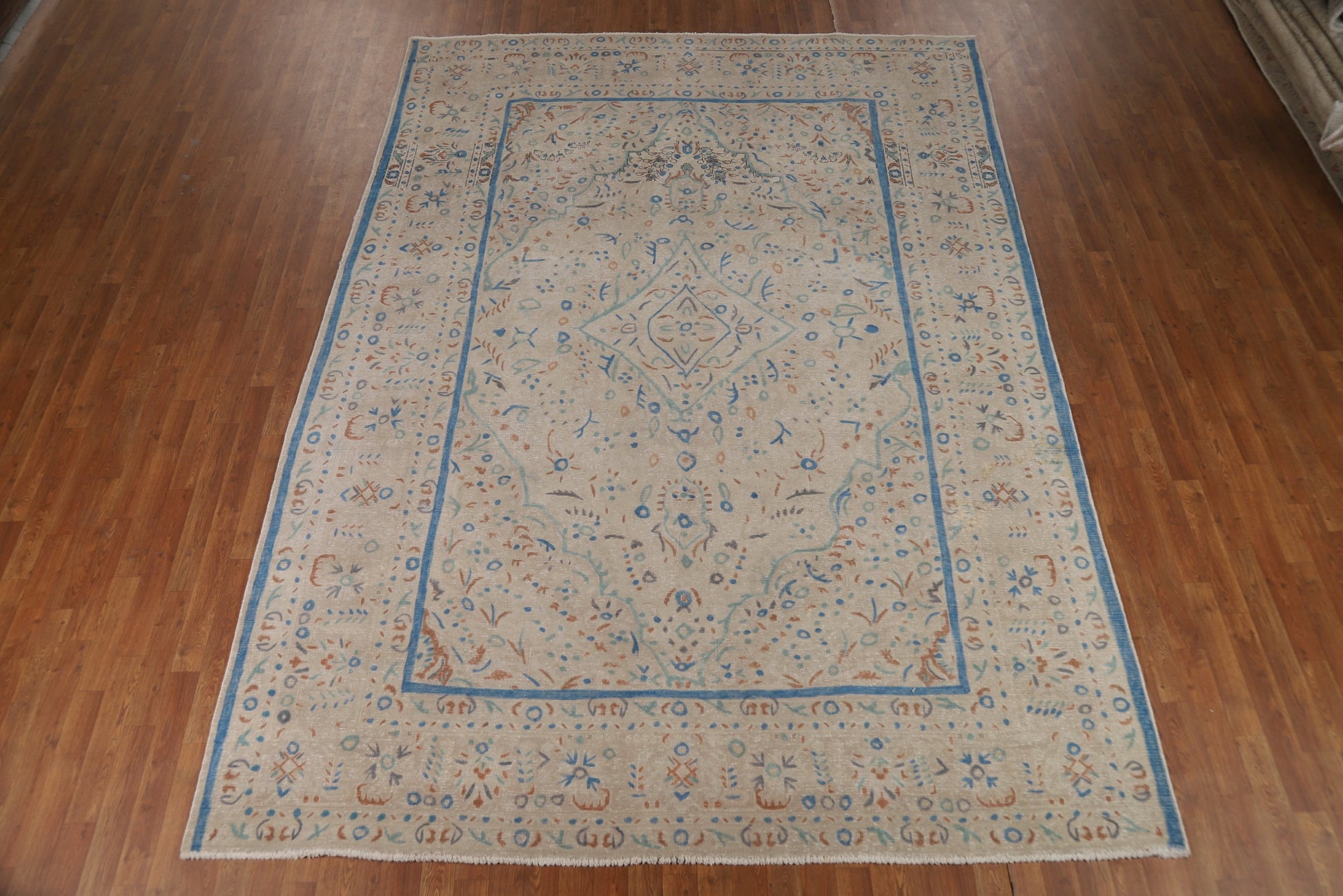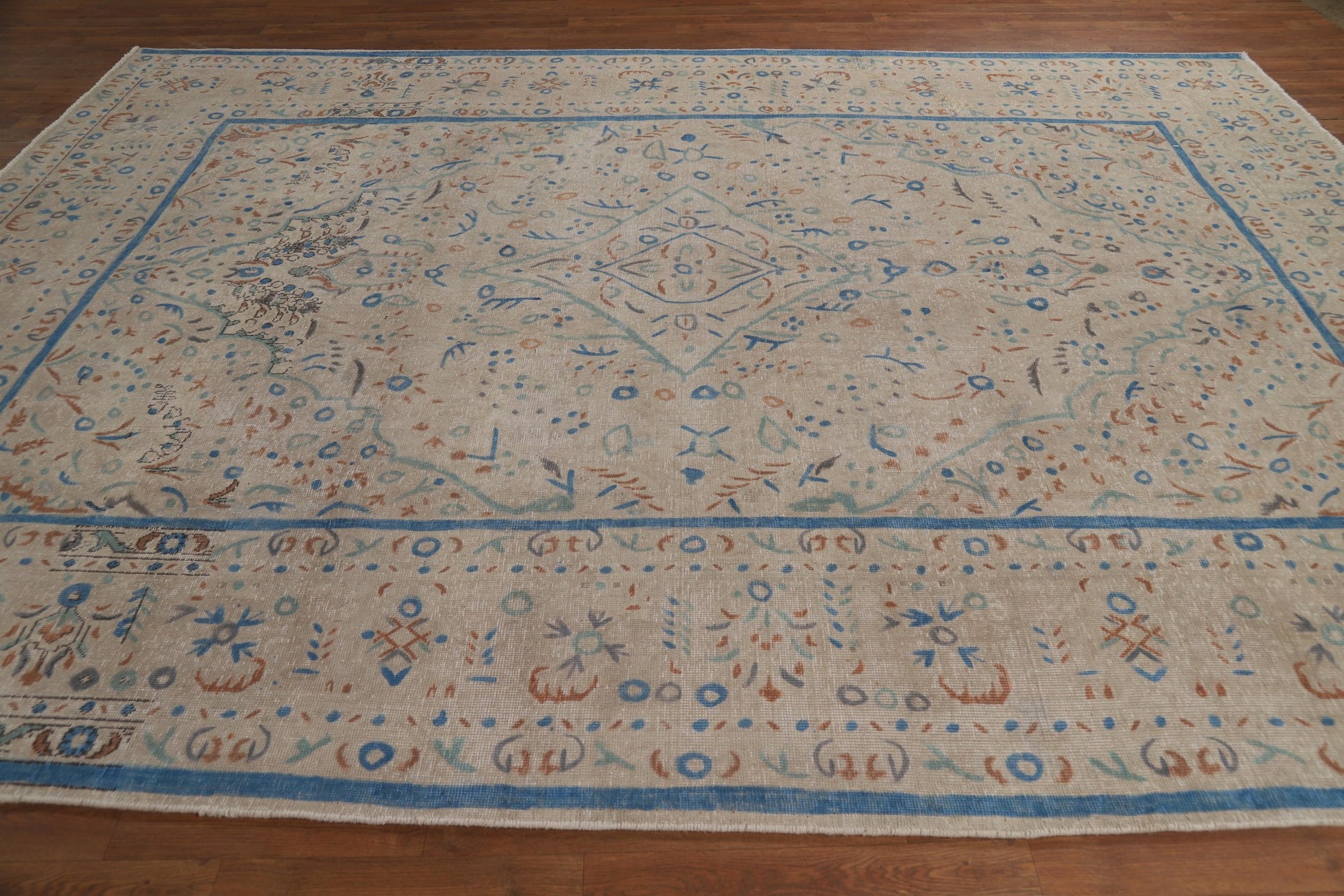 A Beautiful Genuine Persia ( Persia ) Tabriz rug is Hand Knotted by skillful weavers in Persia ( Persia ) with 100% Wool Material. This rug is in Very Good (Evenly Low Pile) condition. dimensions are 11' 3'' X 8' 3'' in foot and 343 X 251 in centimeter. the primary color is Beige & Ivories.
