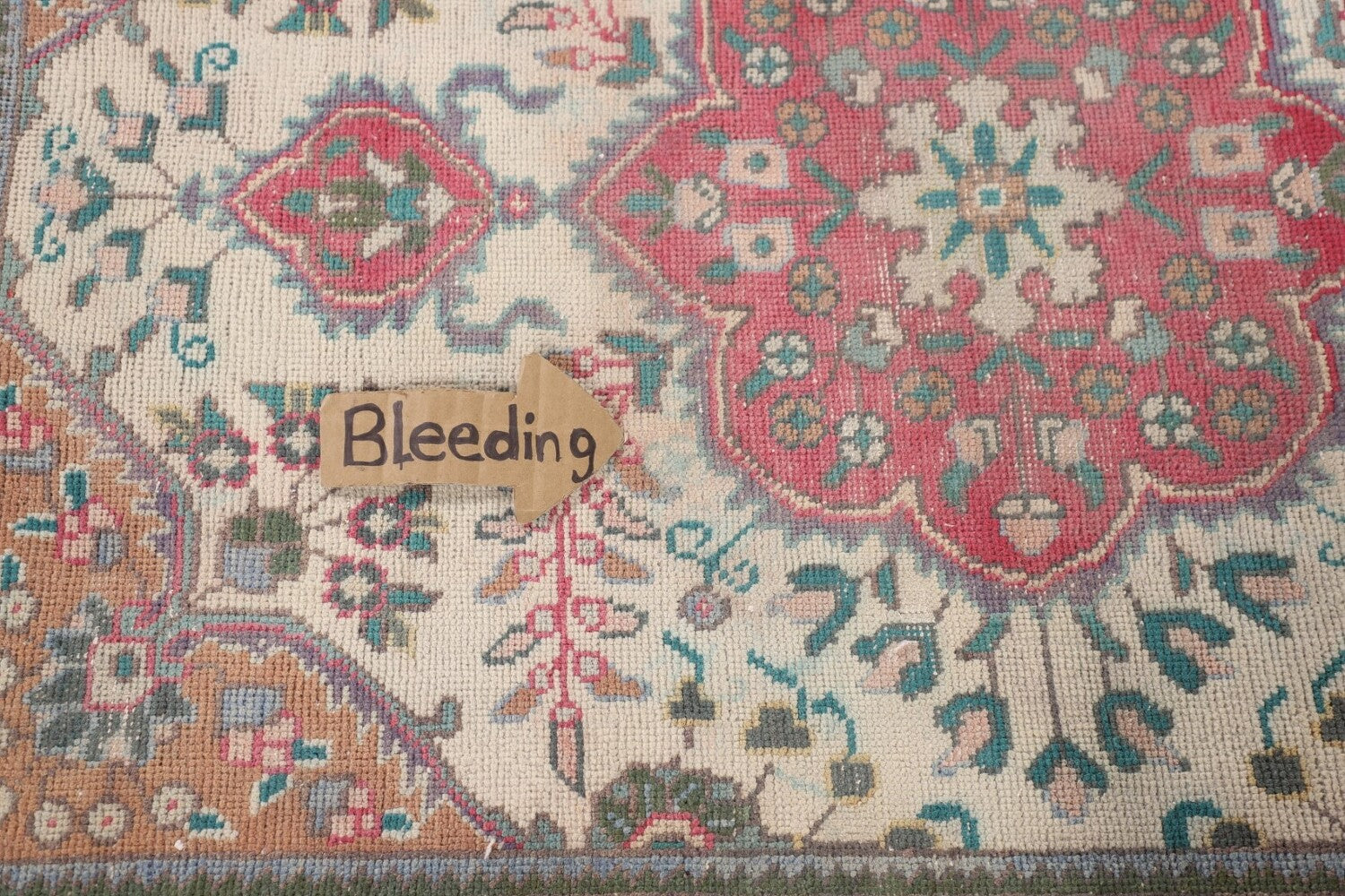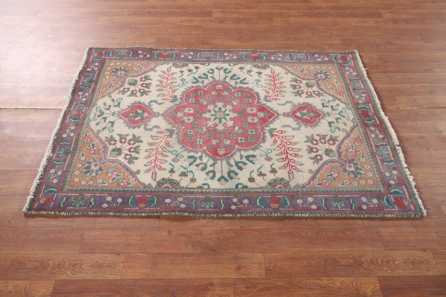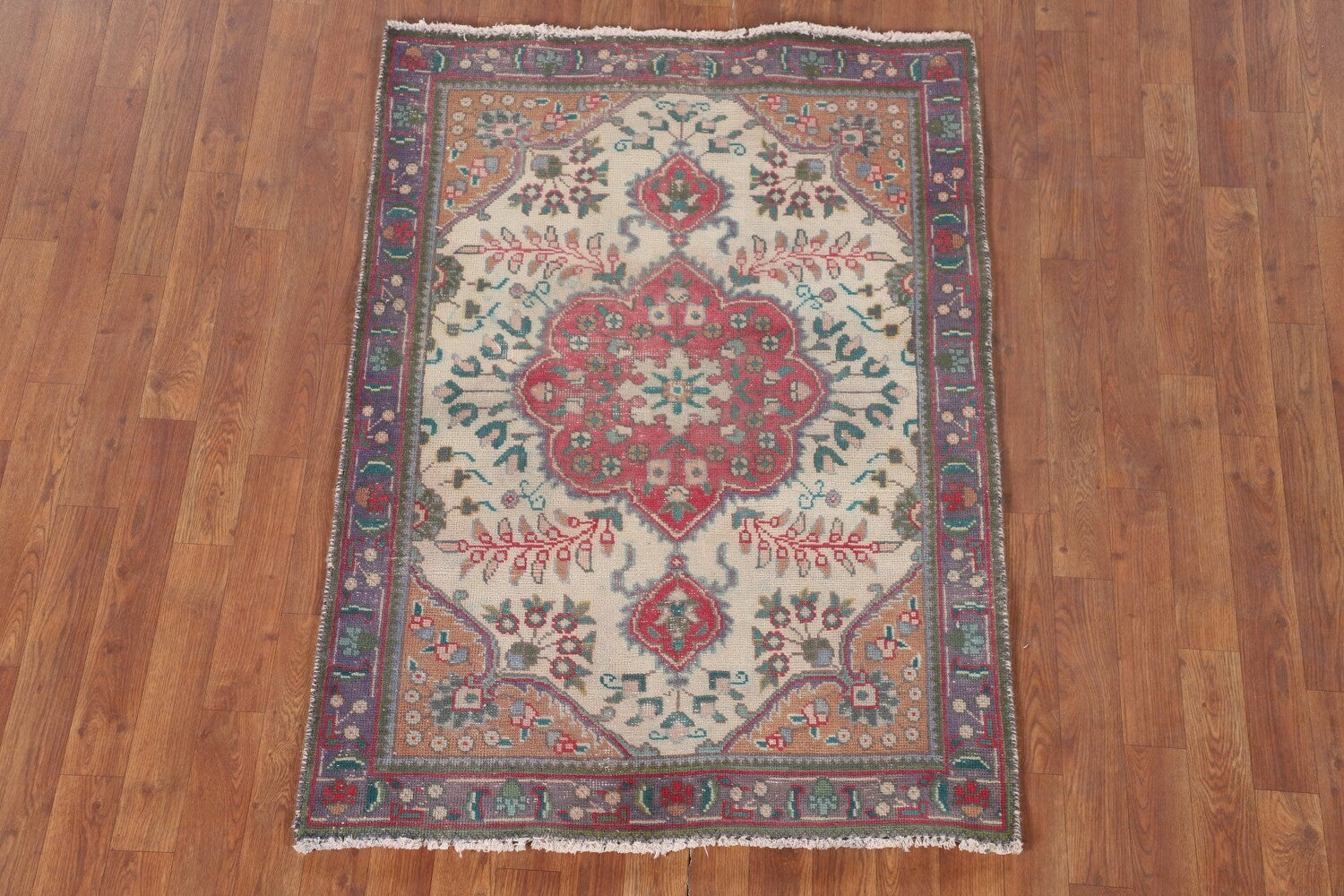 A Beautiful Genuine Persia ( Persia ) Tabriz rug is Hand Knotted by skillful weavers in Persia ( Persia ) with 100% Wool Material. This rug is in Very Good (Evenly Low Pile-Bleeding) condition. dimensions are 4' 7'' X 3' 2'' in foot and 140 X 97 in centimeter. the primary color is Beige & Ivories.