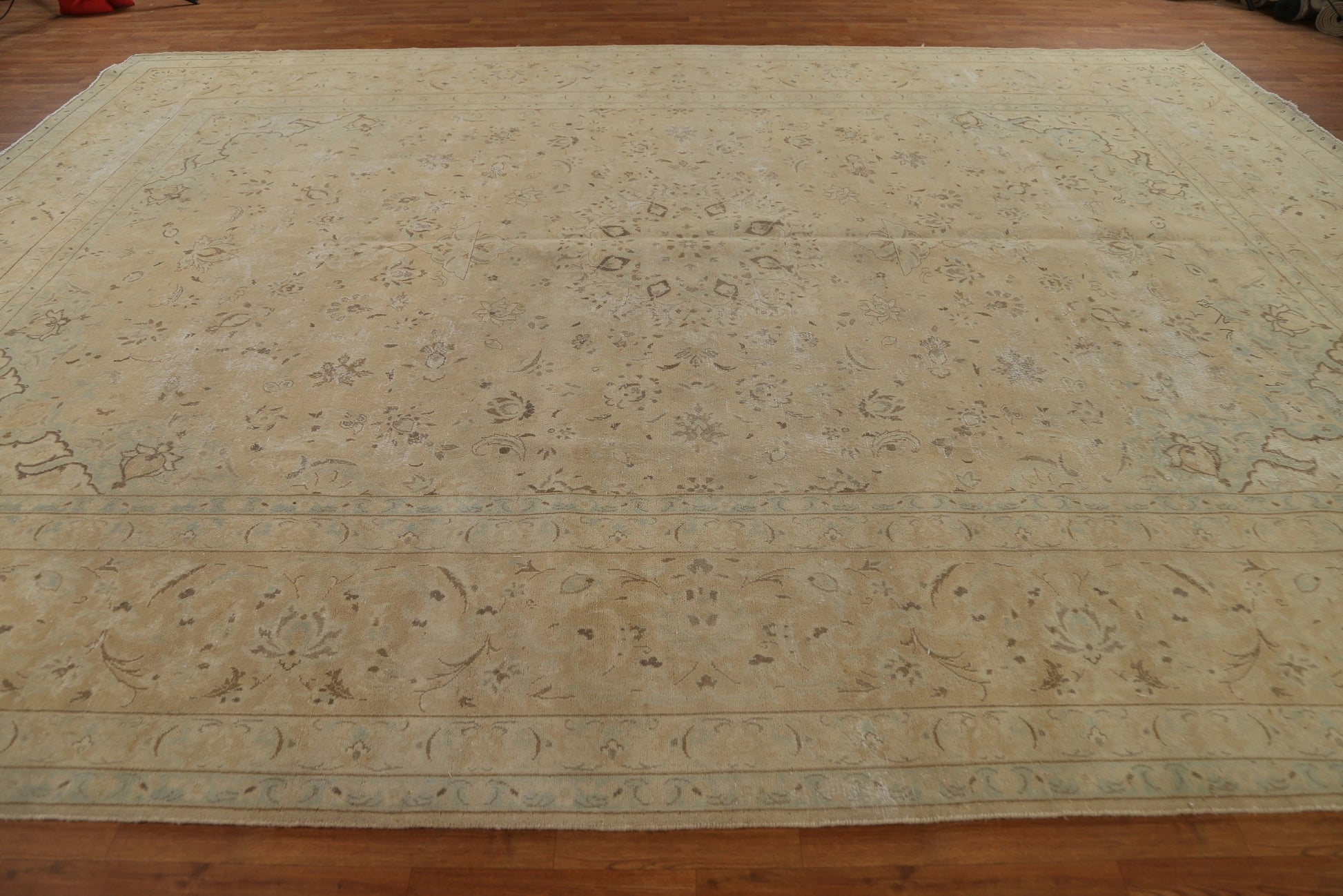 A Beautiful Genuine Persia ( Persia ) Kashan rug is Hand Knotted by skillful weavers in Persia ( Persia ) with 100% Wool Material. This rug is in Very Good (Evenly Low Pile) condition. dimensions are 15' 4'' X 11' 2'' in foot and 467 X 340 in centimeter. the primary color is Beige & Ivories.