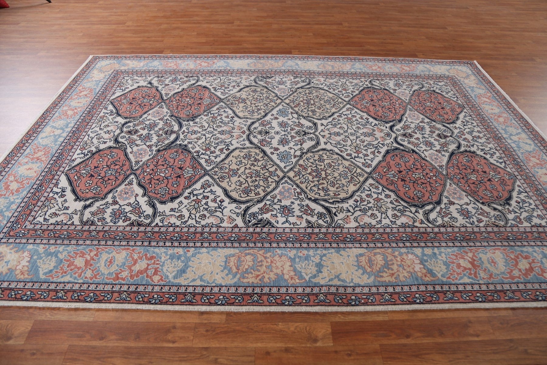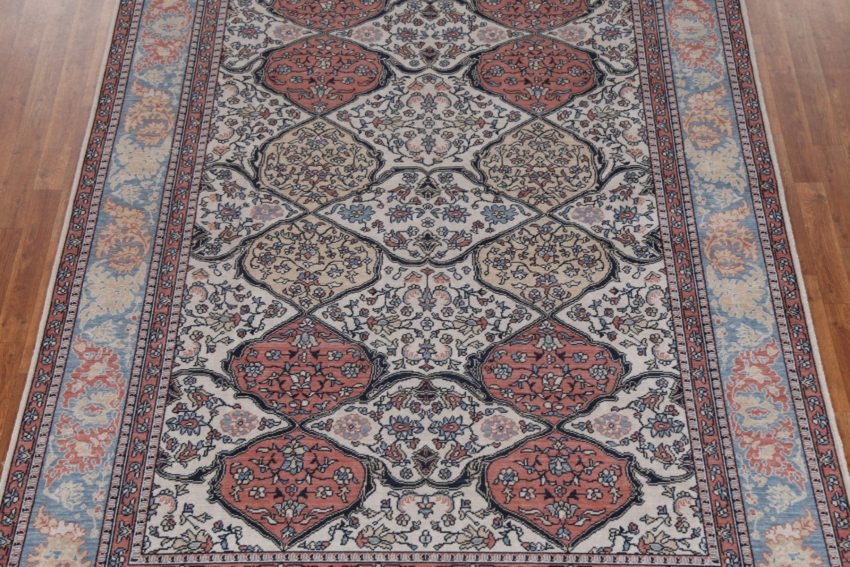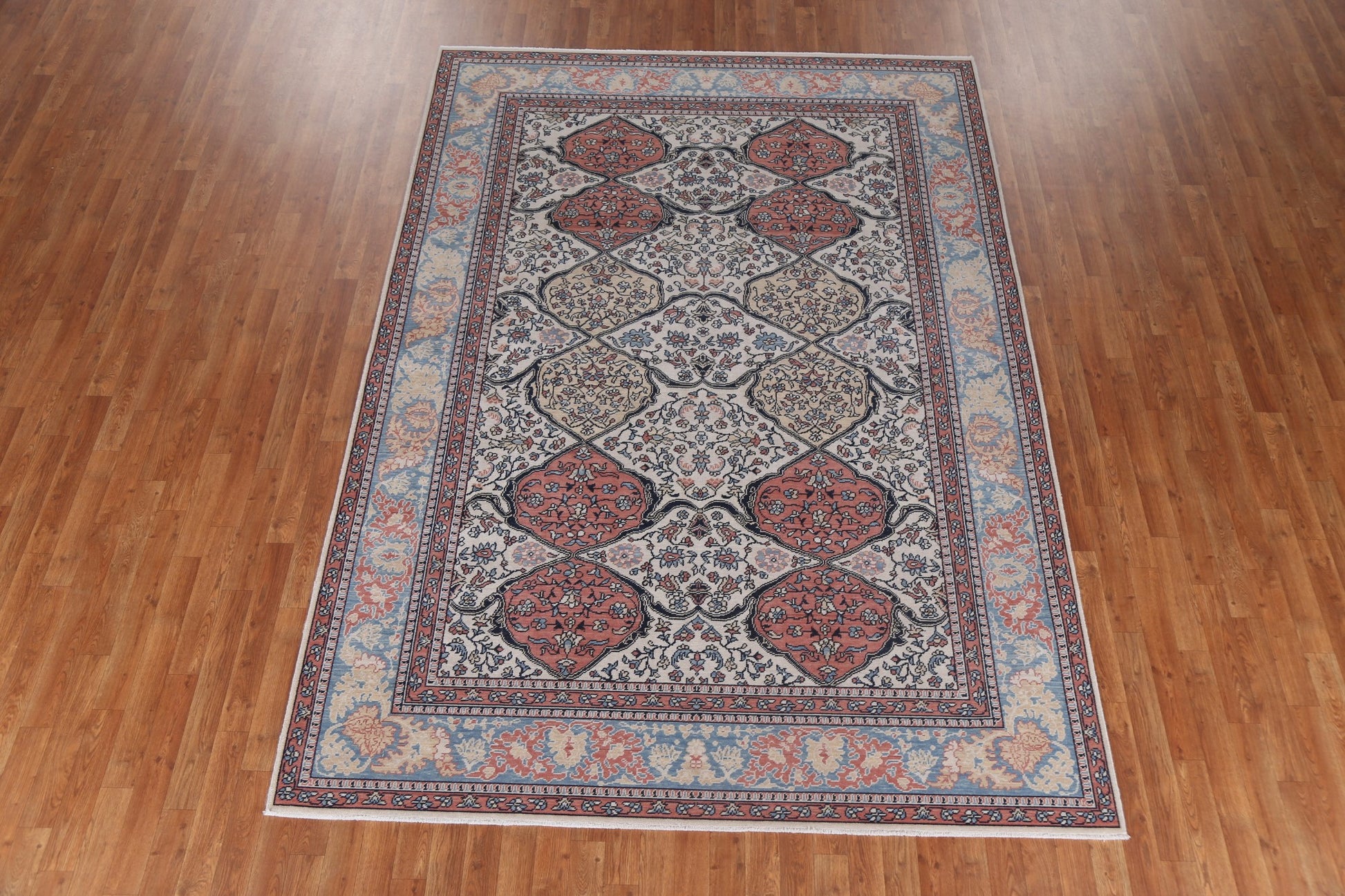 A Beautiful Genuine Turkey Bakhtiari rug is Hand Knotted by skillful weavers in Turkey with 100% Wool Material. This rug is in New, First Quality condition. dimensions are 9' 9'' X 7' 0'' in foot and 297 X 213 in centimeter. the primary color is Beige & Ivories.