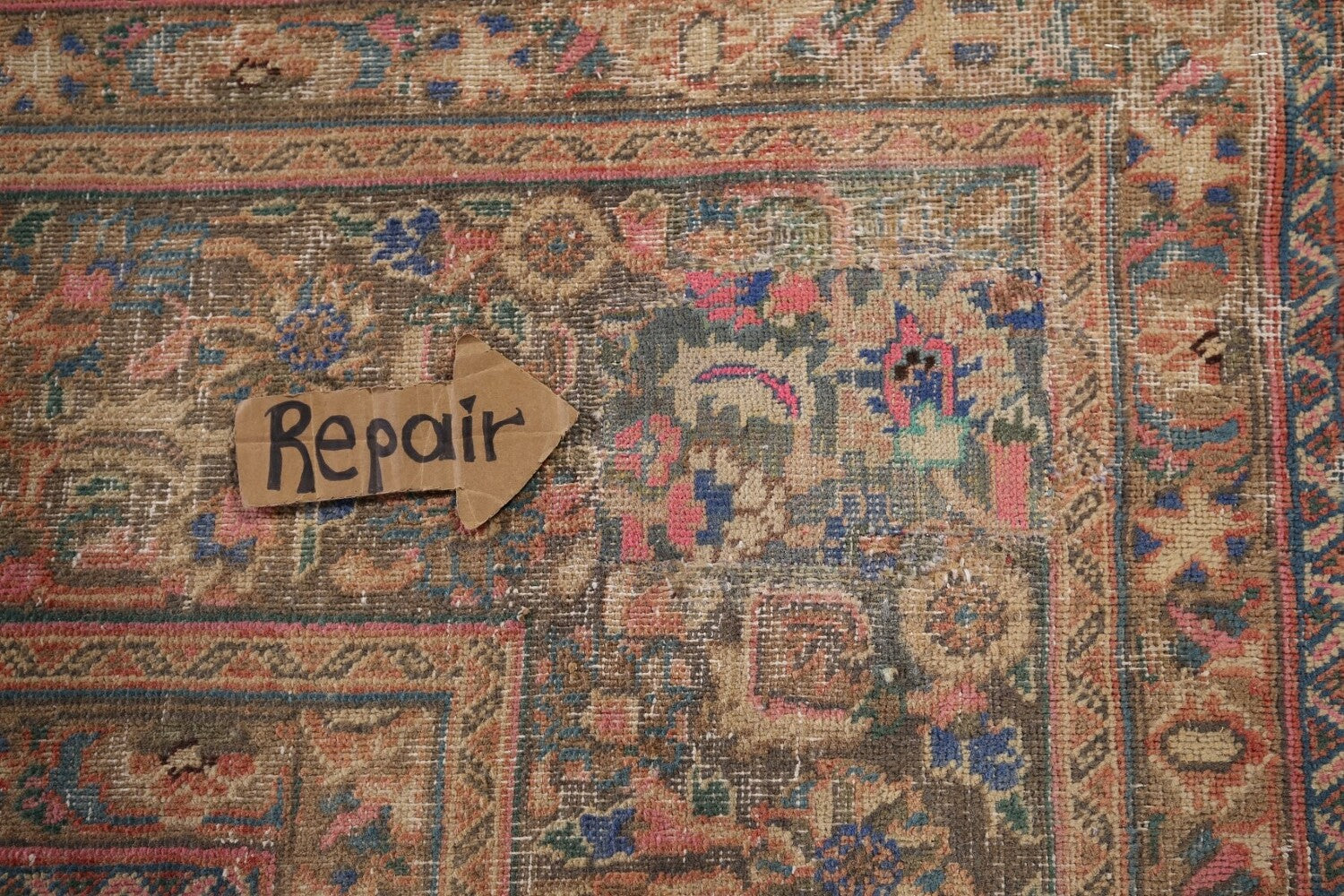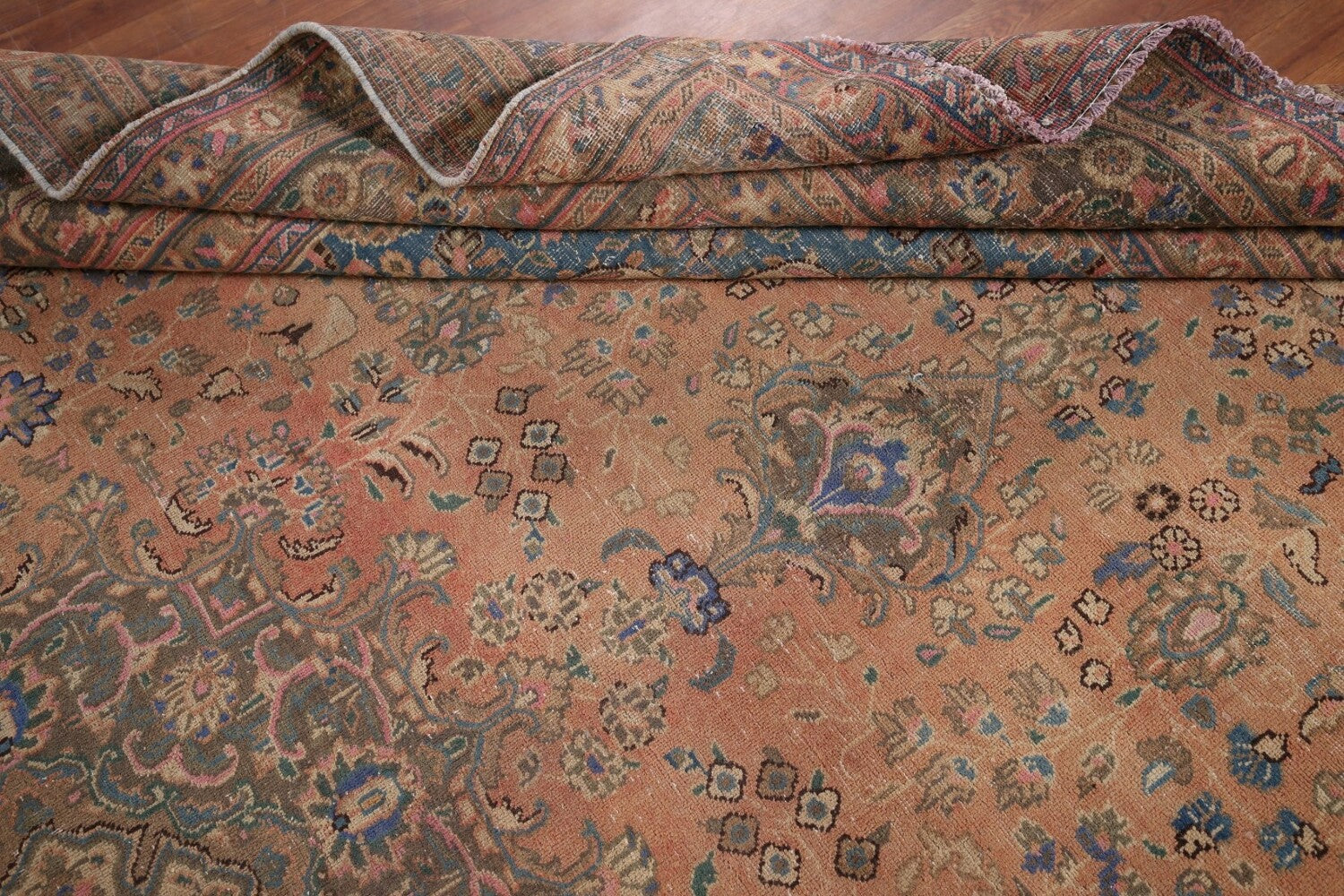 A Beautiful Genuine Persia ( Persia ) Mashad rug is Hand Knotted by skillful weavers in Persia ( Persia ) with 100% Wool Material. This rug is in Very Good (Evenly Low Pile-Repair) condition. dimensions are 12' 11'' X 9' 6'' in foot and 394 X 290 in centimeter. the primary color is Coral.