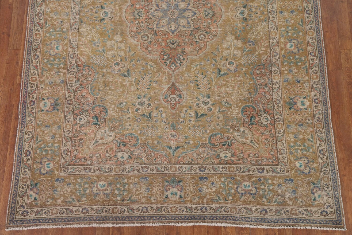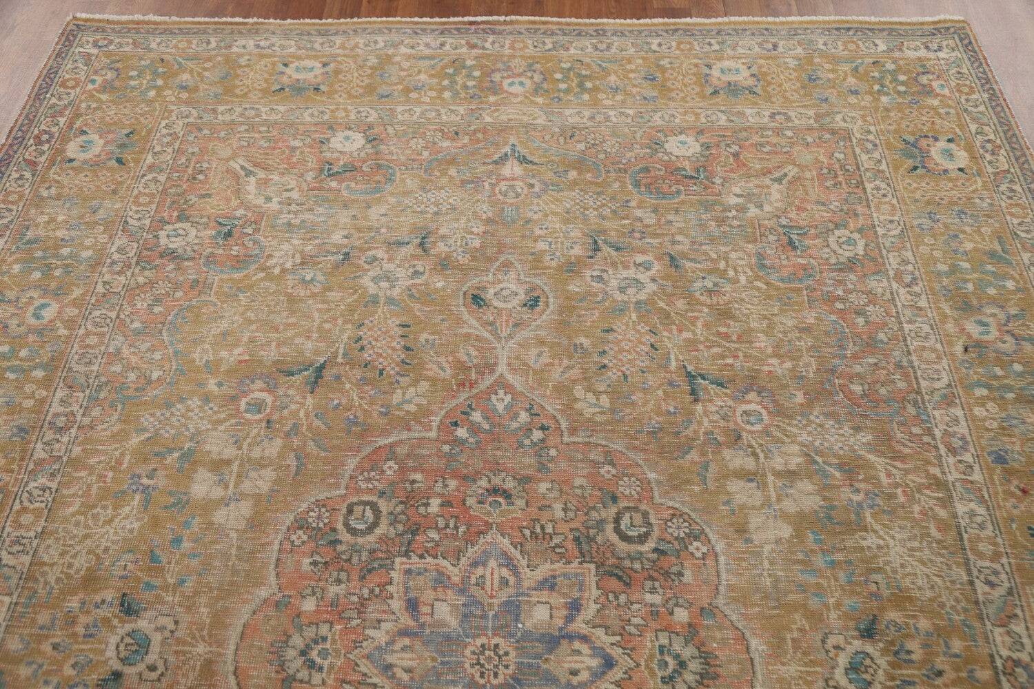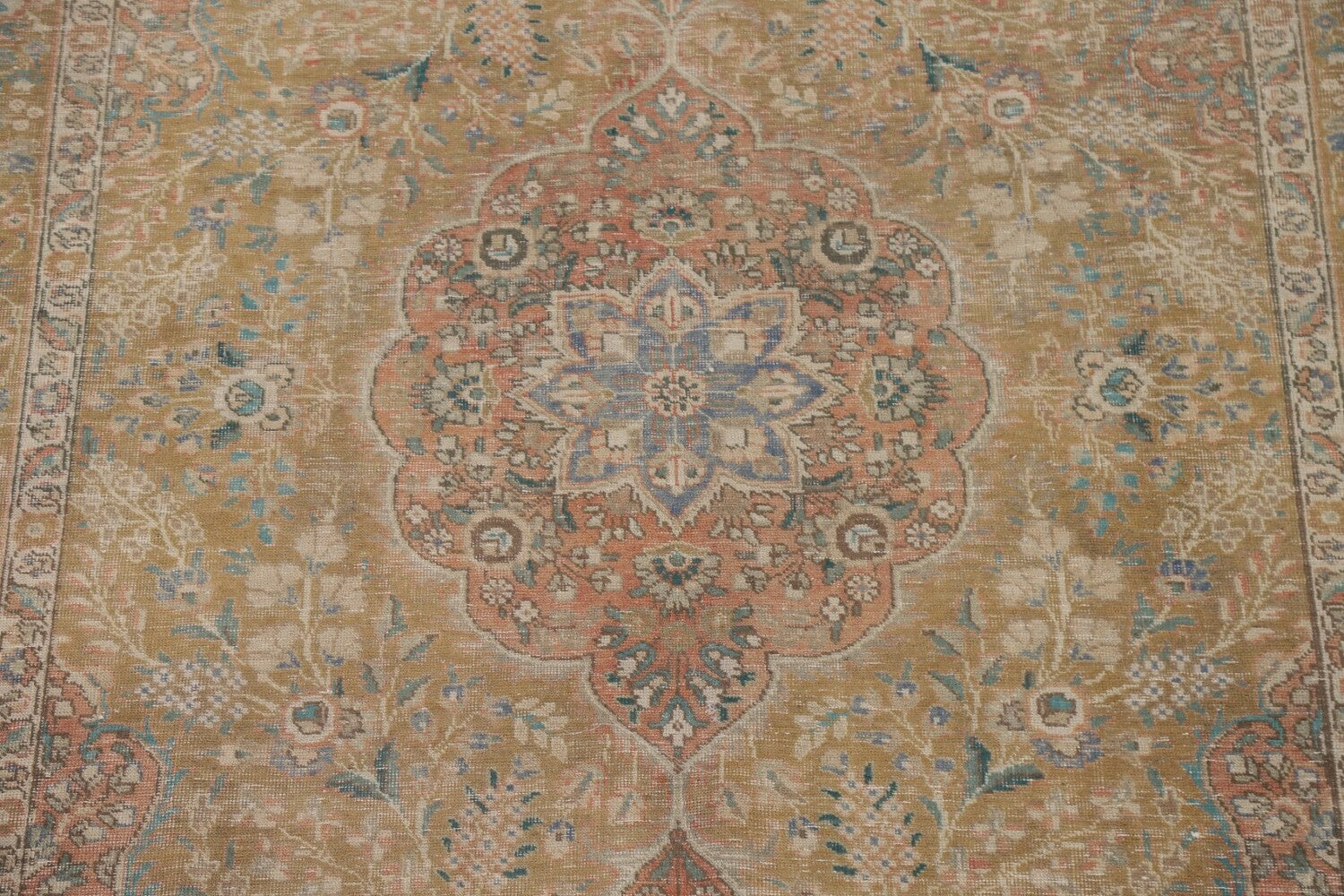 A Beautiful Genuine Persia ( Persia ) Tabriz rug is Hand Knotted by skillful weavers in Persia ( Persia ) with 100% Wool Material. This rug is in Very Good (Low Pile-Repair) condition. dimensions are 9' 4'' X 6' 8'' in foot and 284 X 203 in centimeter. the primary color is Yellow & Gold.
