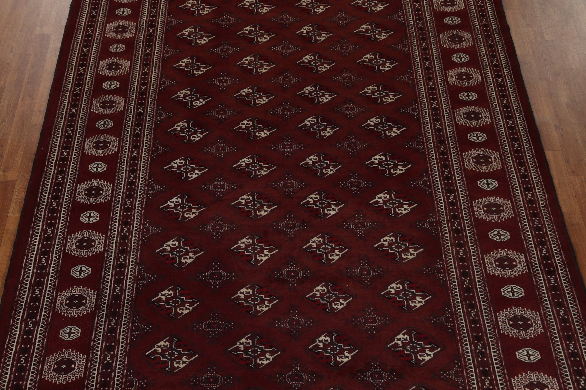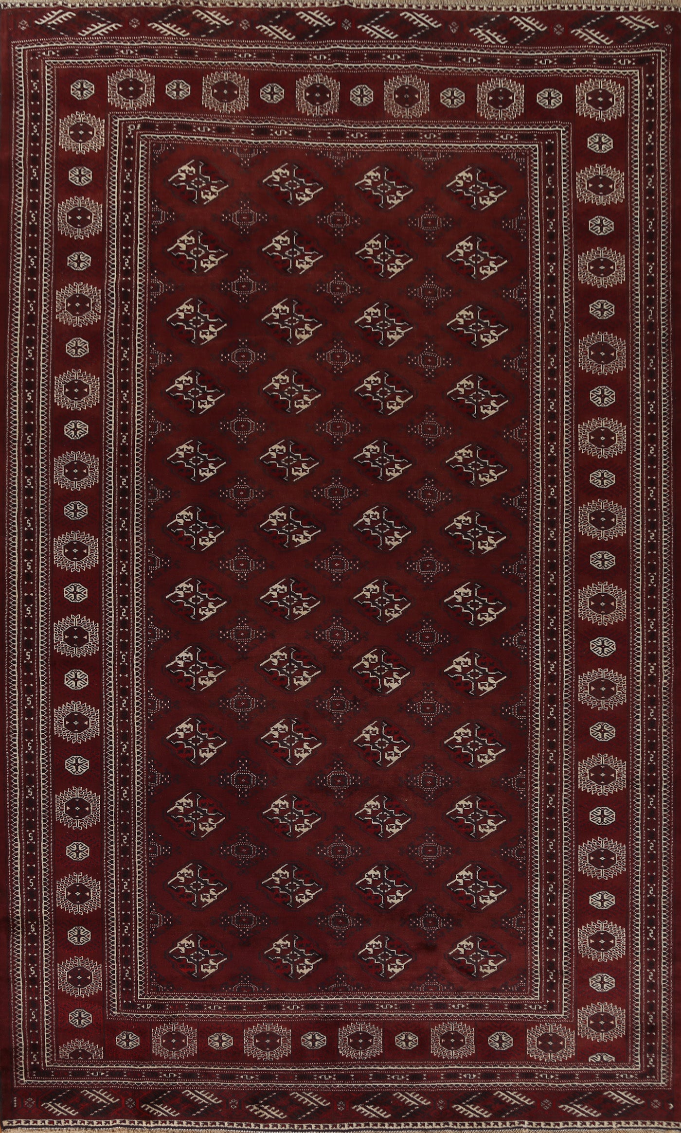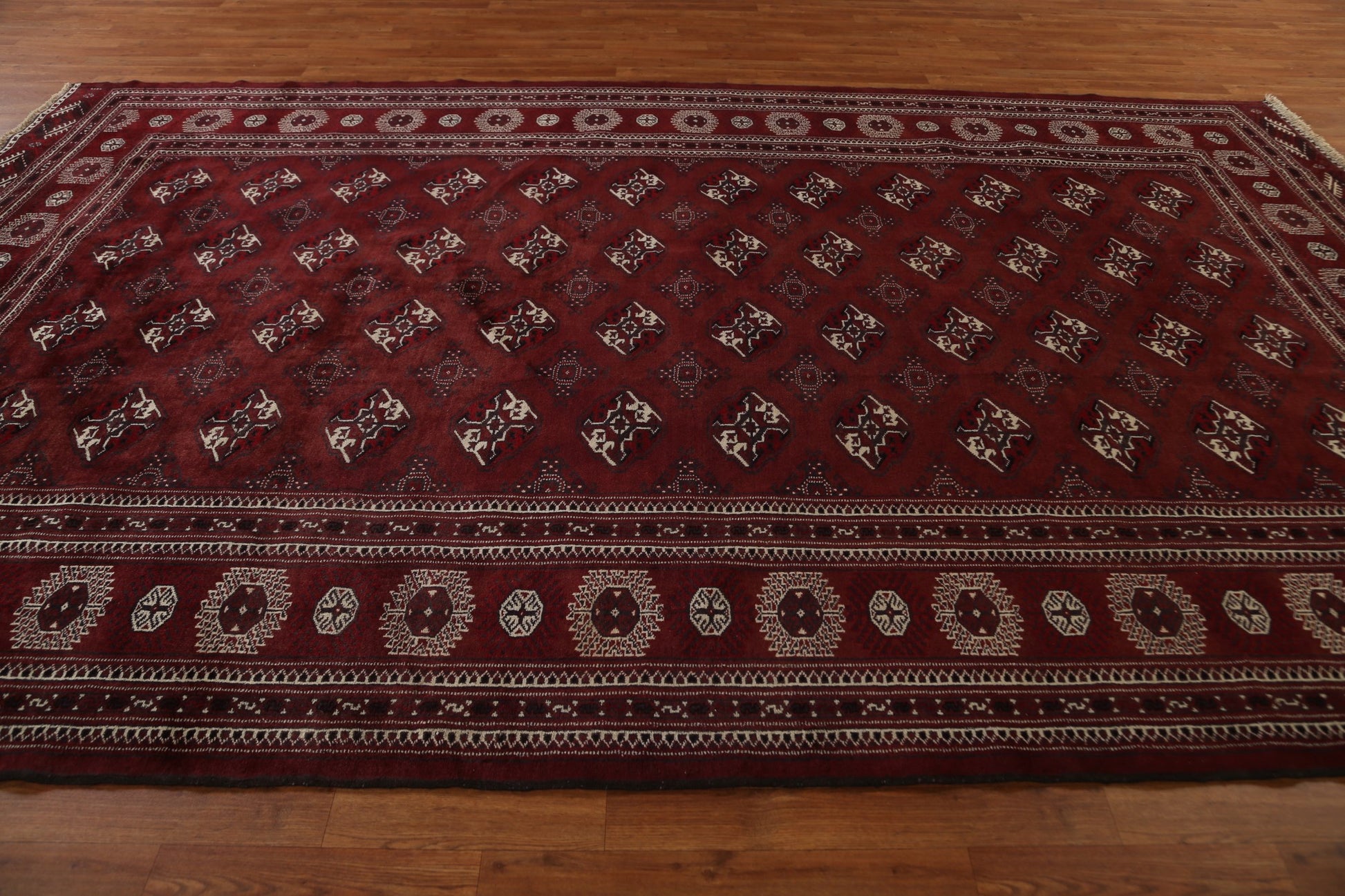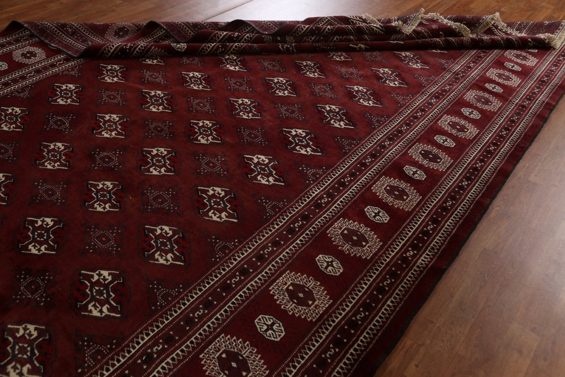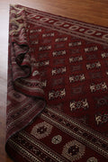 A Beautiful Genuine Pakistan Bokhara rug is Hand Knotted by skillful weavers in Pakistan with 100% Wool Material. This rug is in Very Good condition. dimensions are 12' 5'' X 7' 9'' in foot and 378 X 236 in centimeter. the primary color is Red.