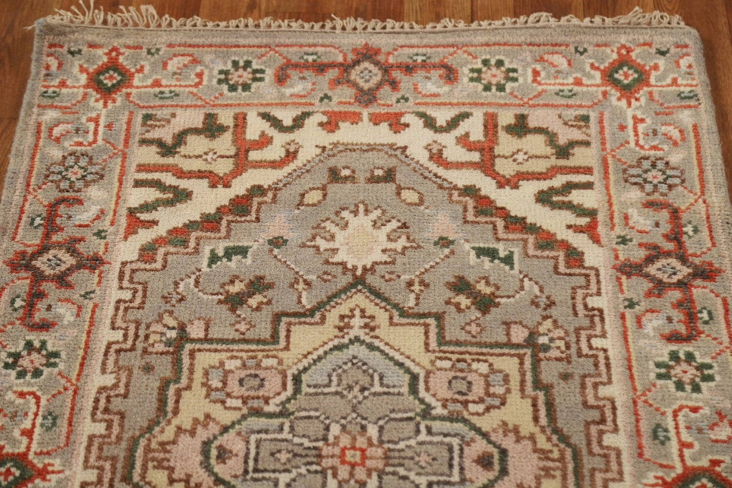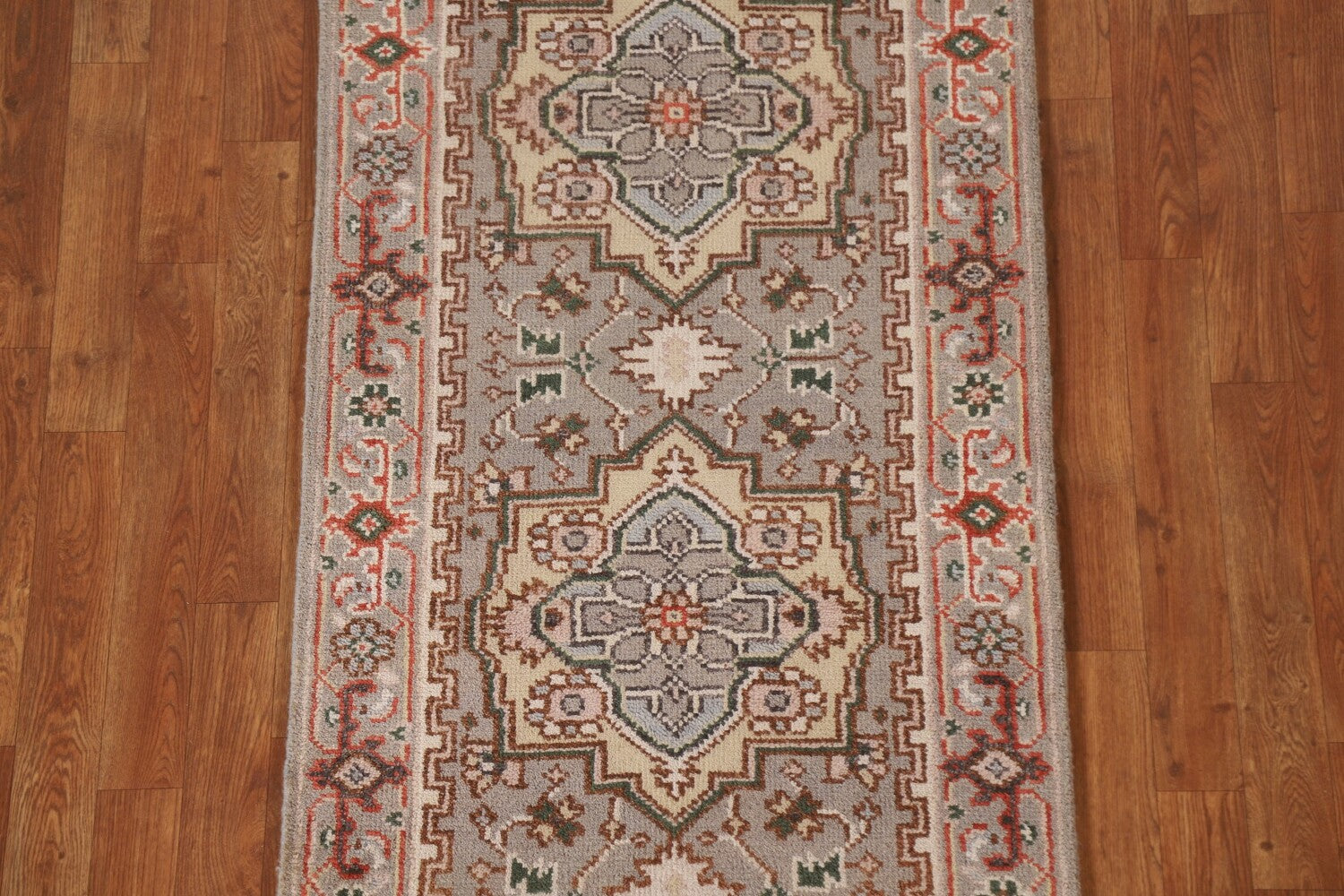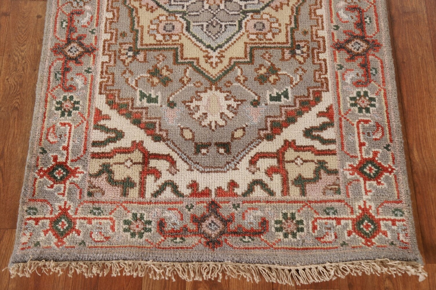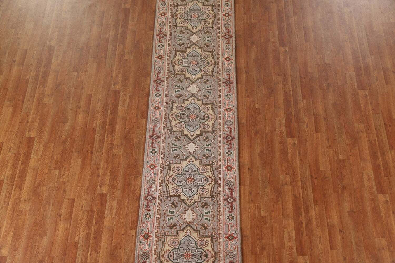A Beautiful Genuine India Heriz (serapi) rug is Hand Knotted by skillful weavers in India with 100% Wool Material. This rug is in New, First Quality condition. dimensions are 13' 11'' X 2' 7'' in foot and 424 X 79 in centimeter. the primary color is Greys & Charcoal.