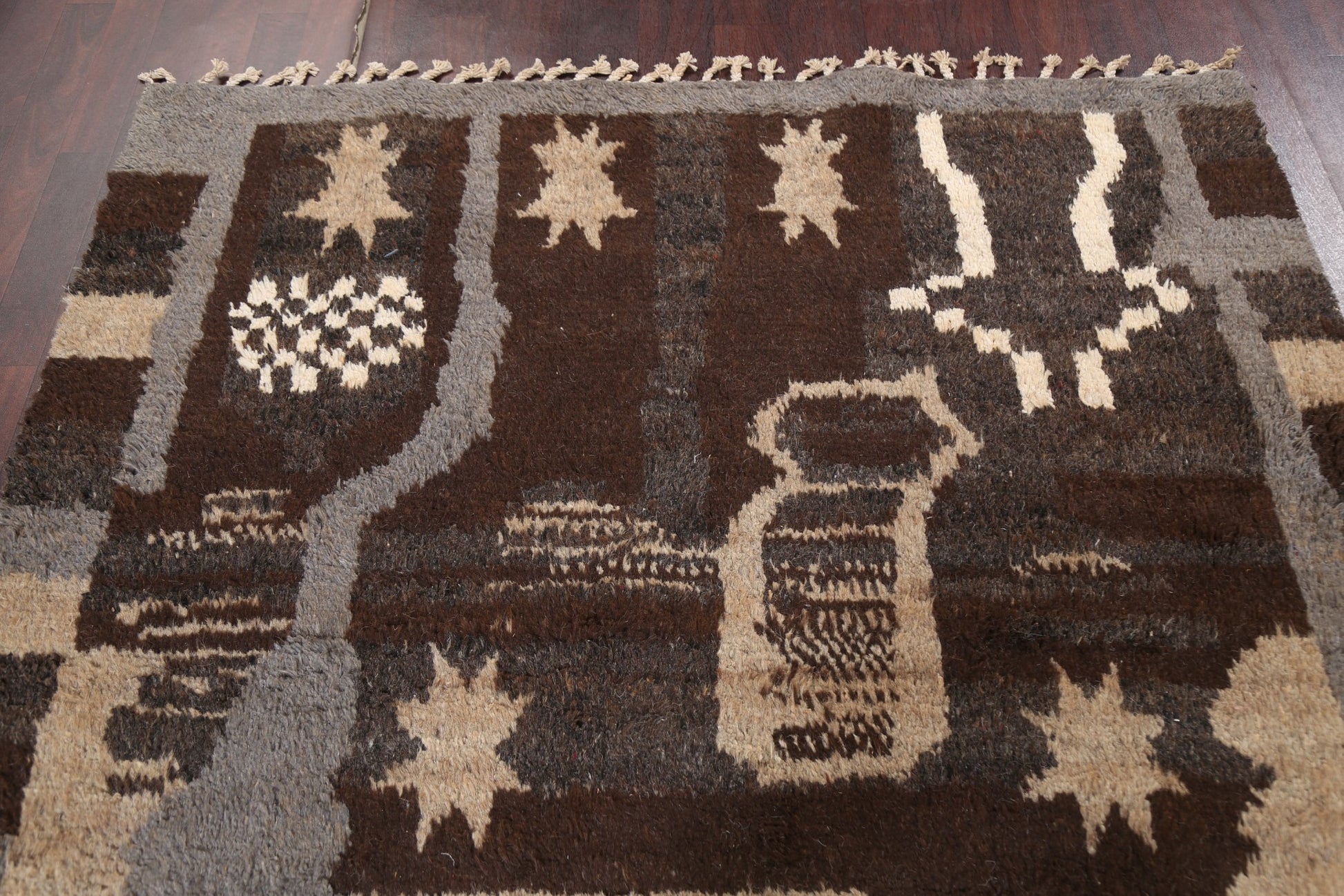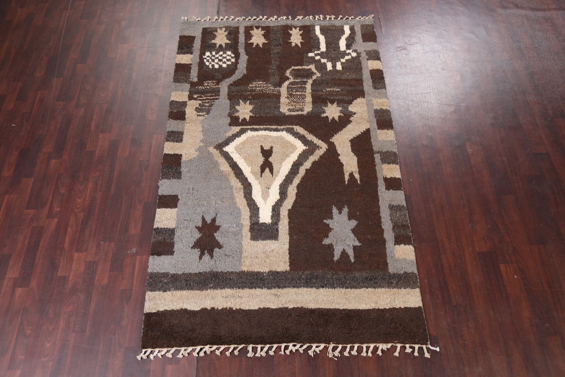 A Beautiful Genuine Morocco Moroccan rug is Hand Knotted by skillful weavers in Morocco with 100% Wool Material. This rug is in New, First Quality condition. dimensions are 9' 6'' X 5' 9'' in foot and 290 X 175 in centimeter. the primary color is Brown.