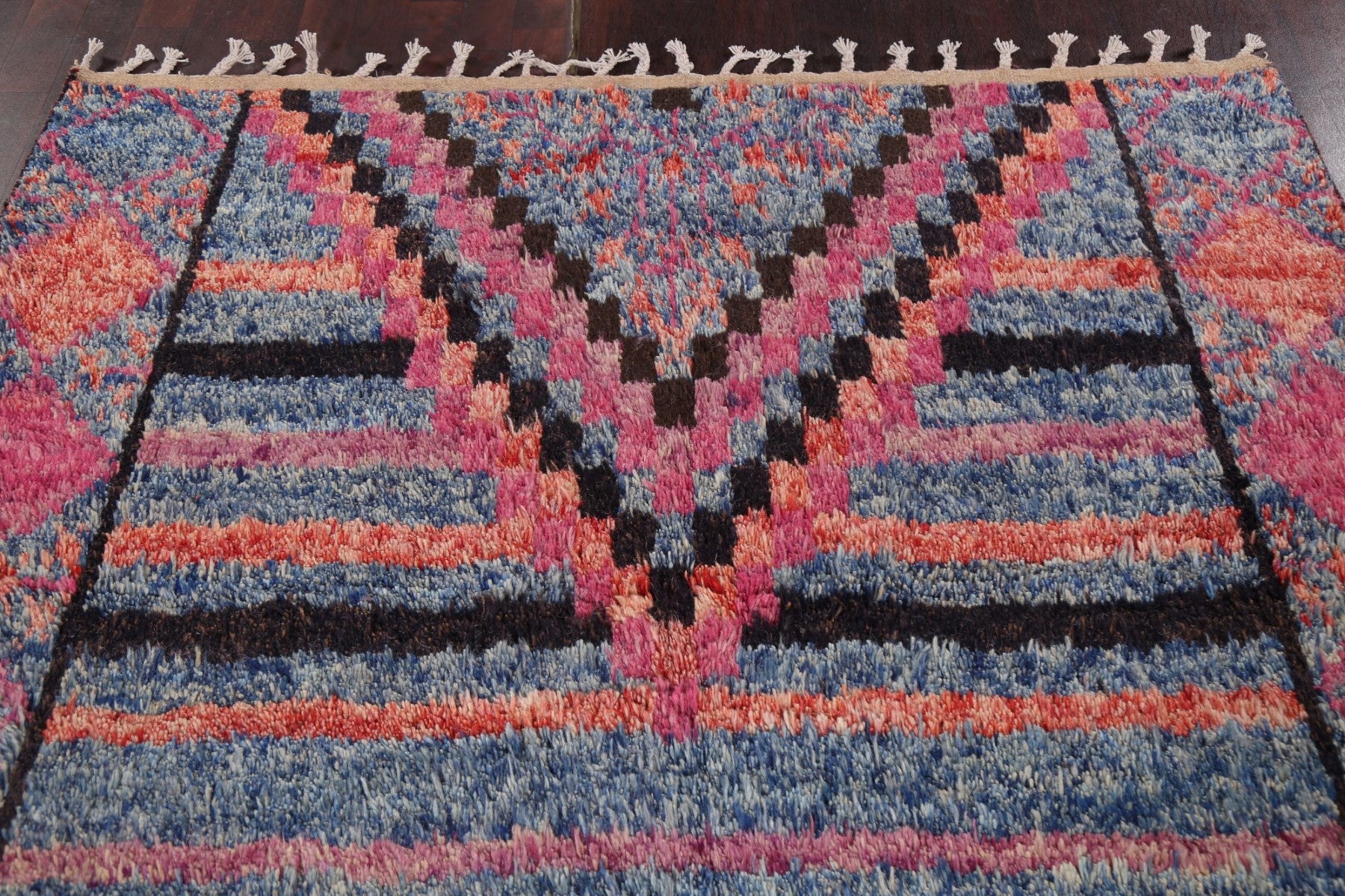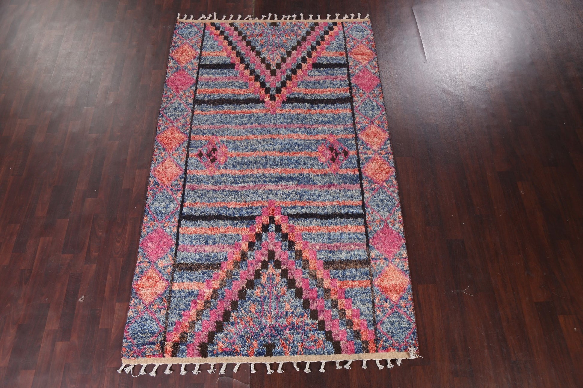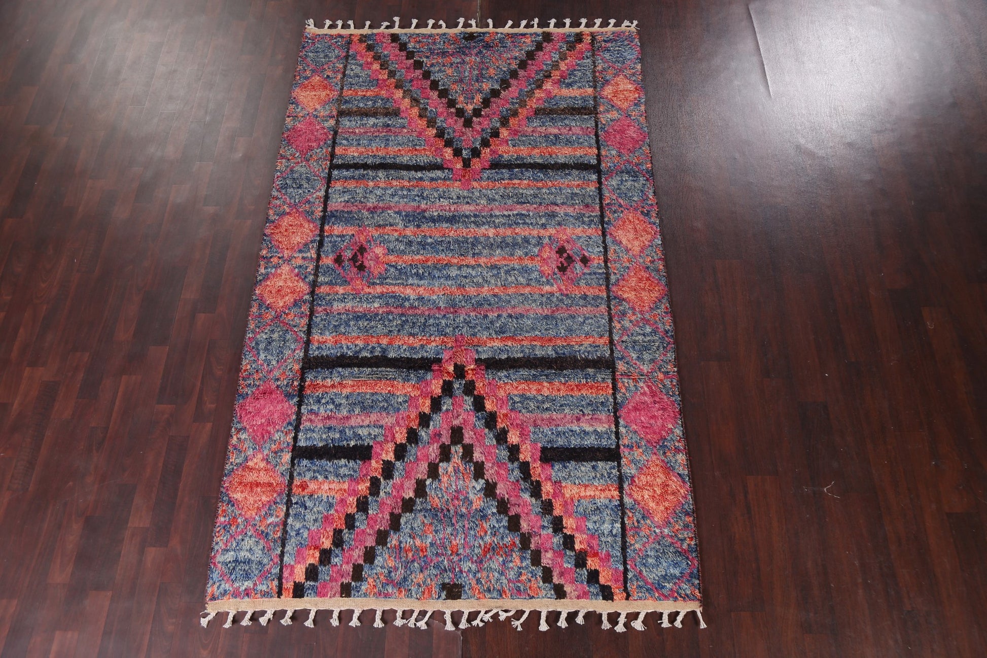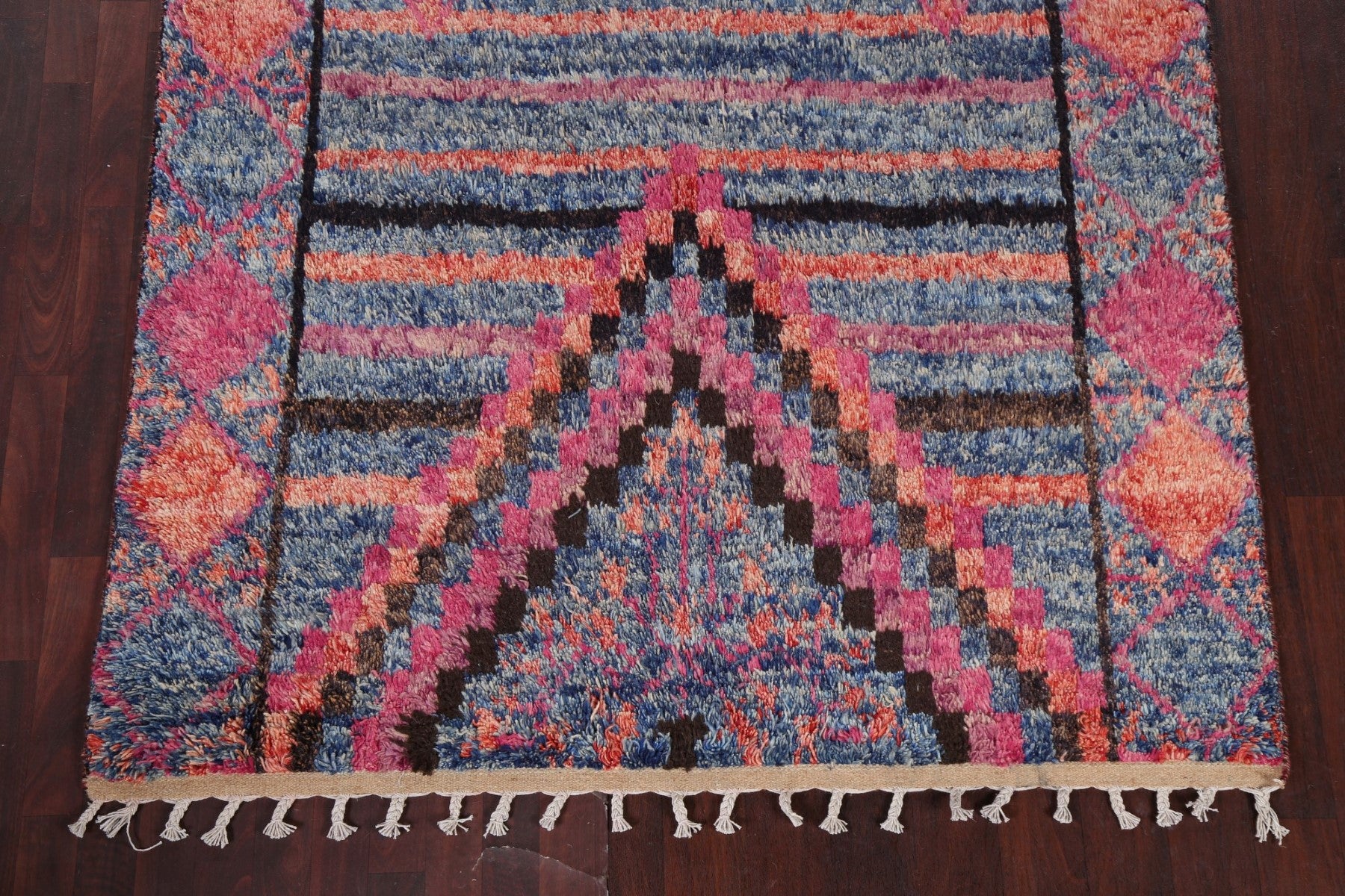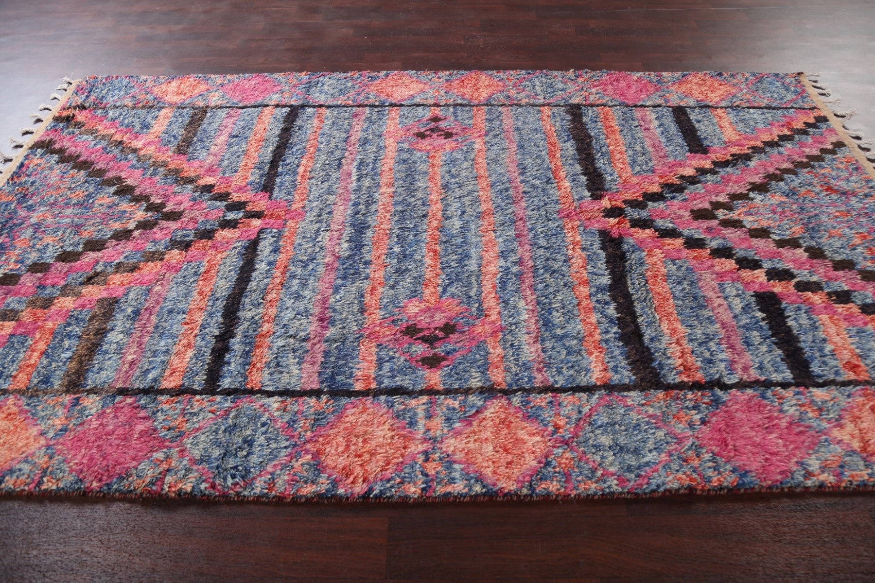 A Beautiful Genuine Pakistan Moroccan rug is Hand Knotted by skillful weavers in Pakistan with 100% Wool Material. This rug is in New, First Quality condition. dimensions are 9' 10'' X 6' 0'' in foot and 300 X 183 in centimeter. the primary color is Navy Blue & Blues.