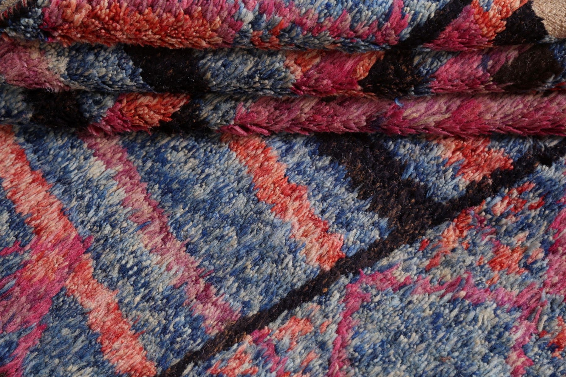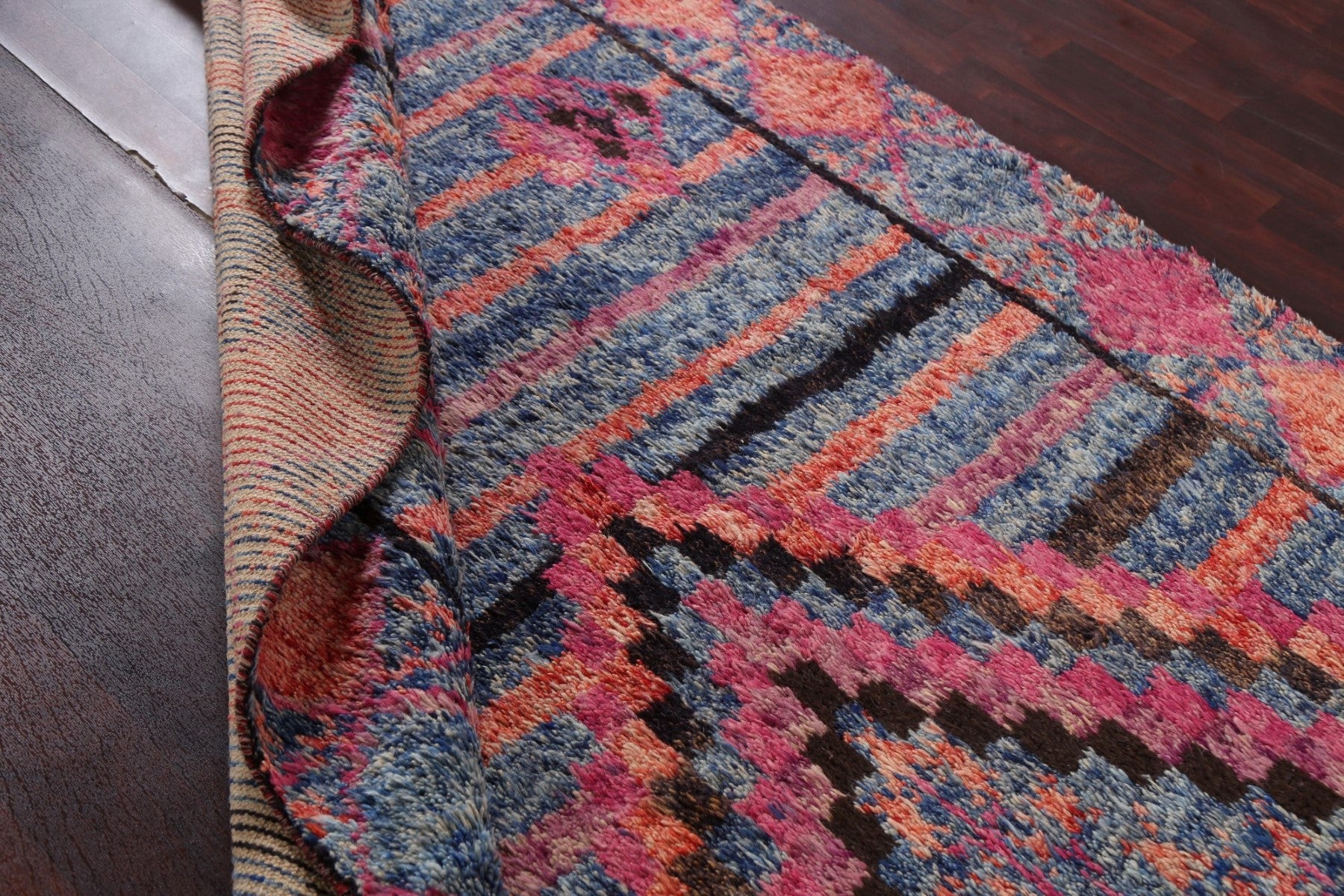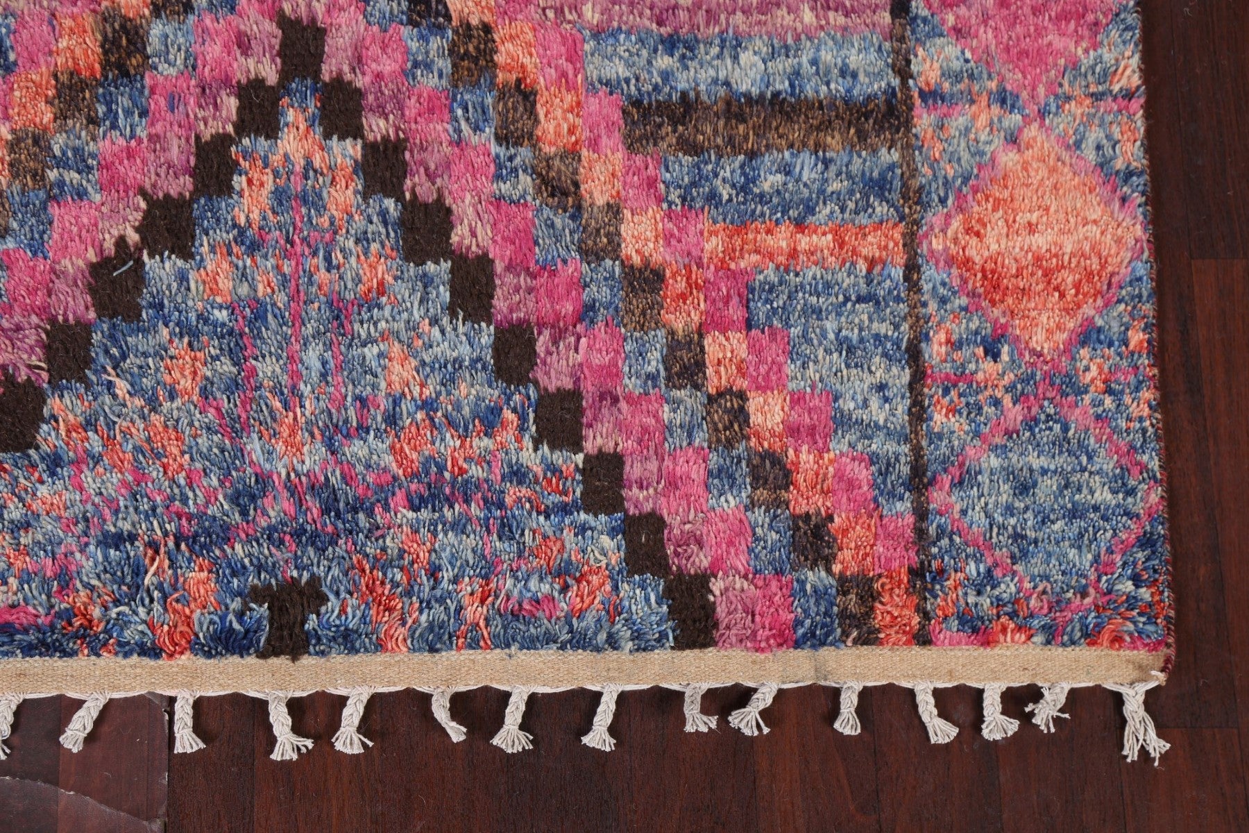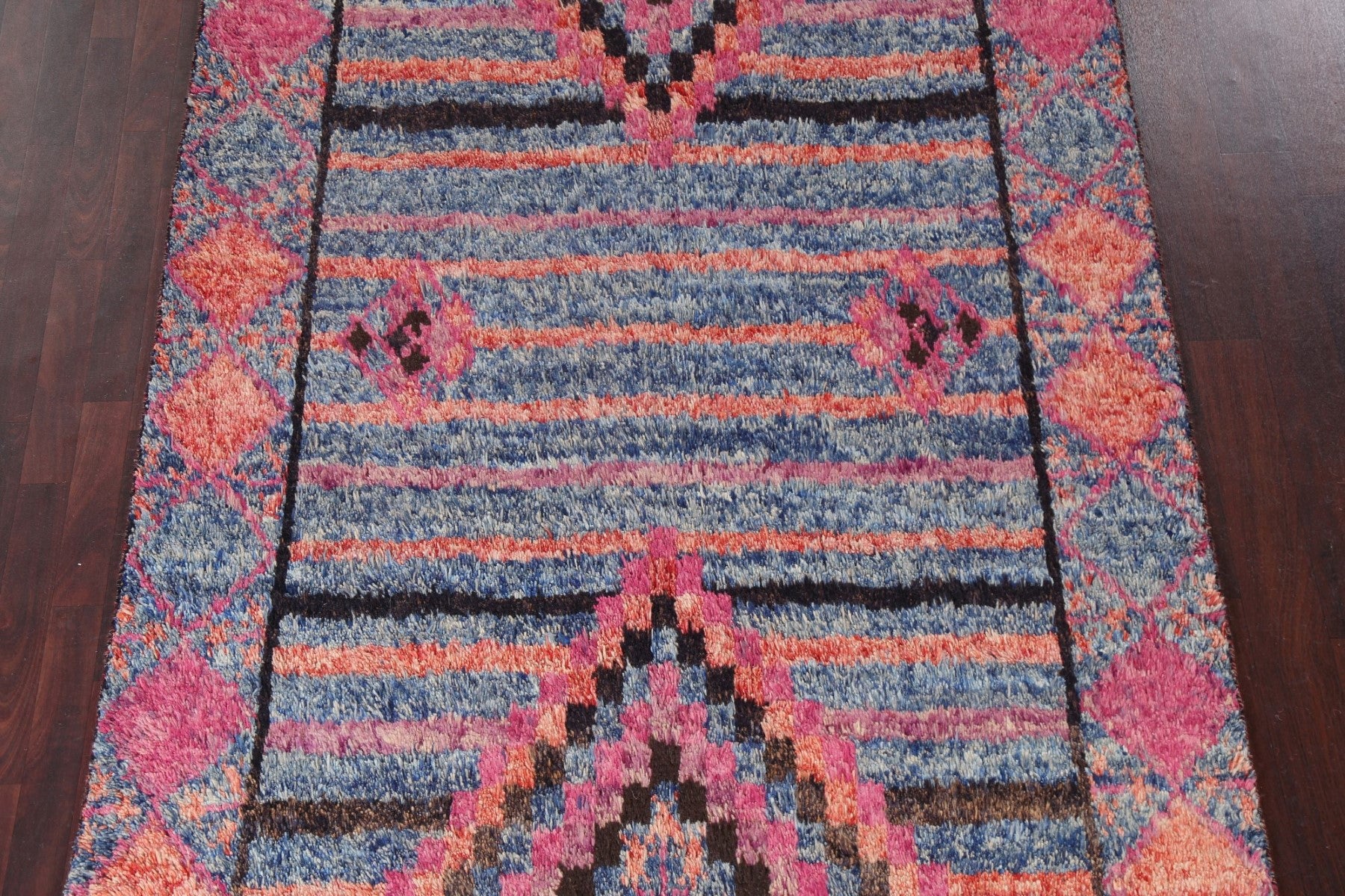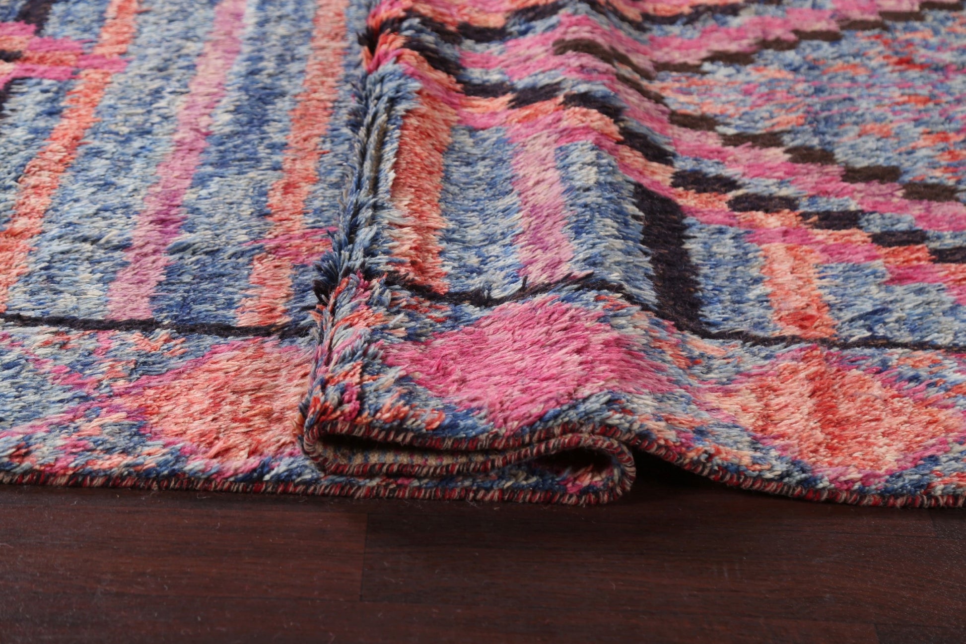 A Beautiful Genuine Pakistan Moroccan rug is Hand Knotted by skillful weavers in Pakistan with 100% Wool Material. This rug is in New, First Quality condition. dimensions are 9' 10'' X 6' 0'' in foot and 300 X 183 in centimeter. the primary color is Navy Blue & Blues.