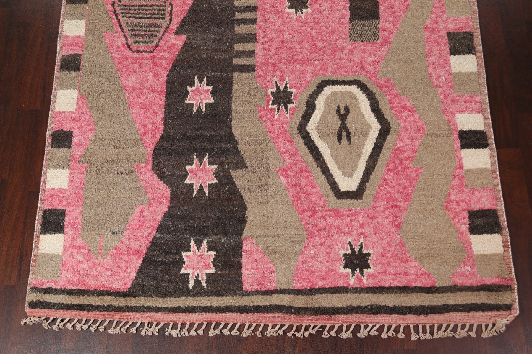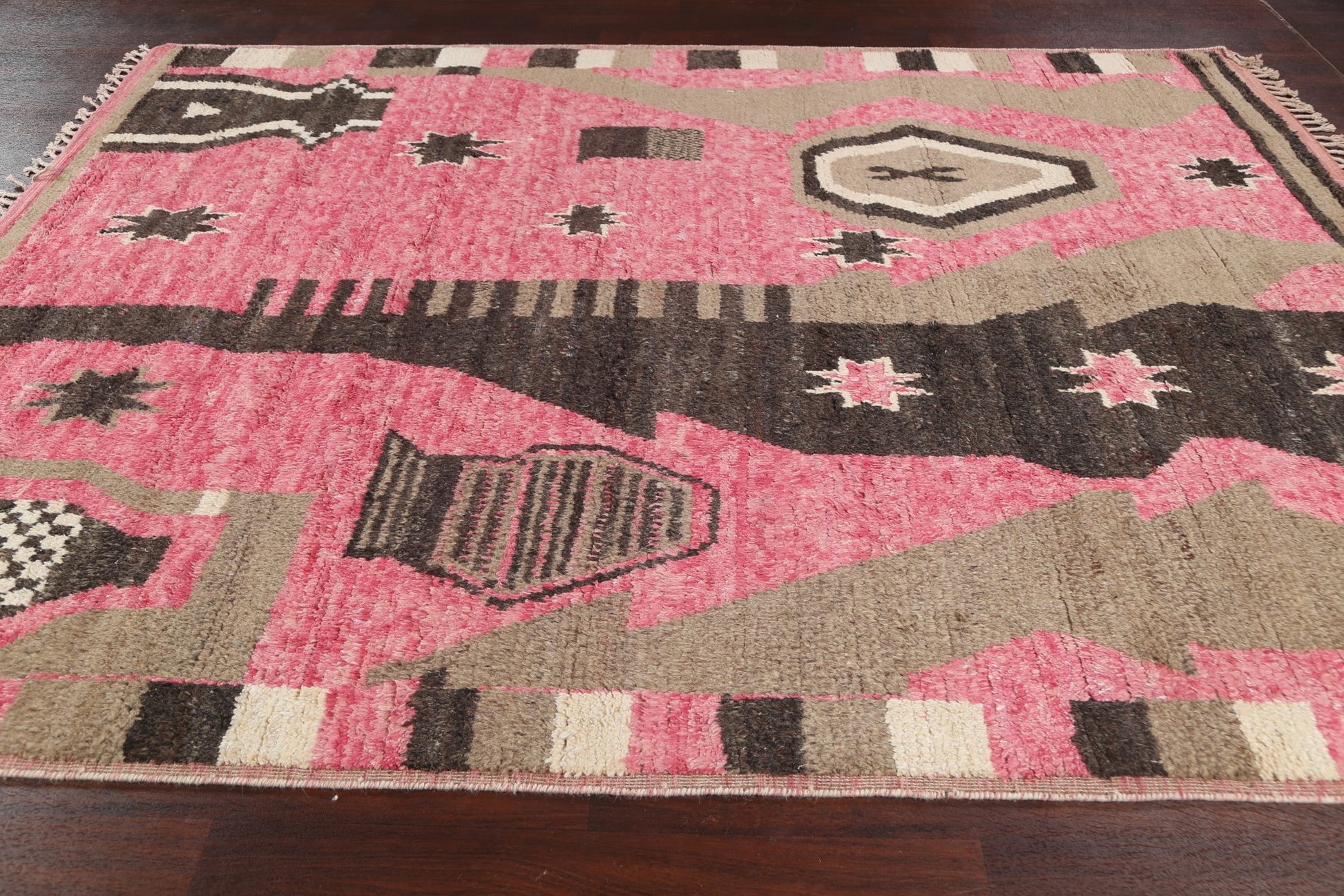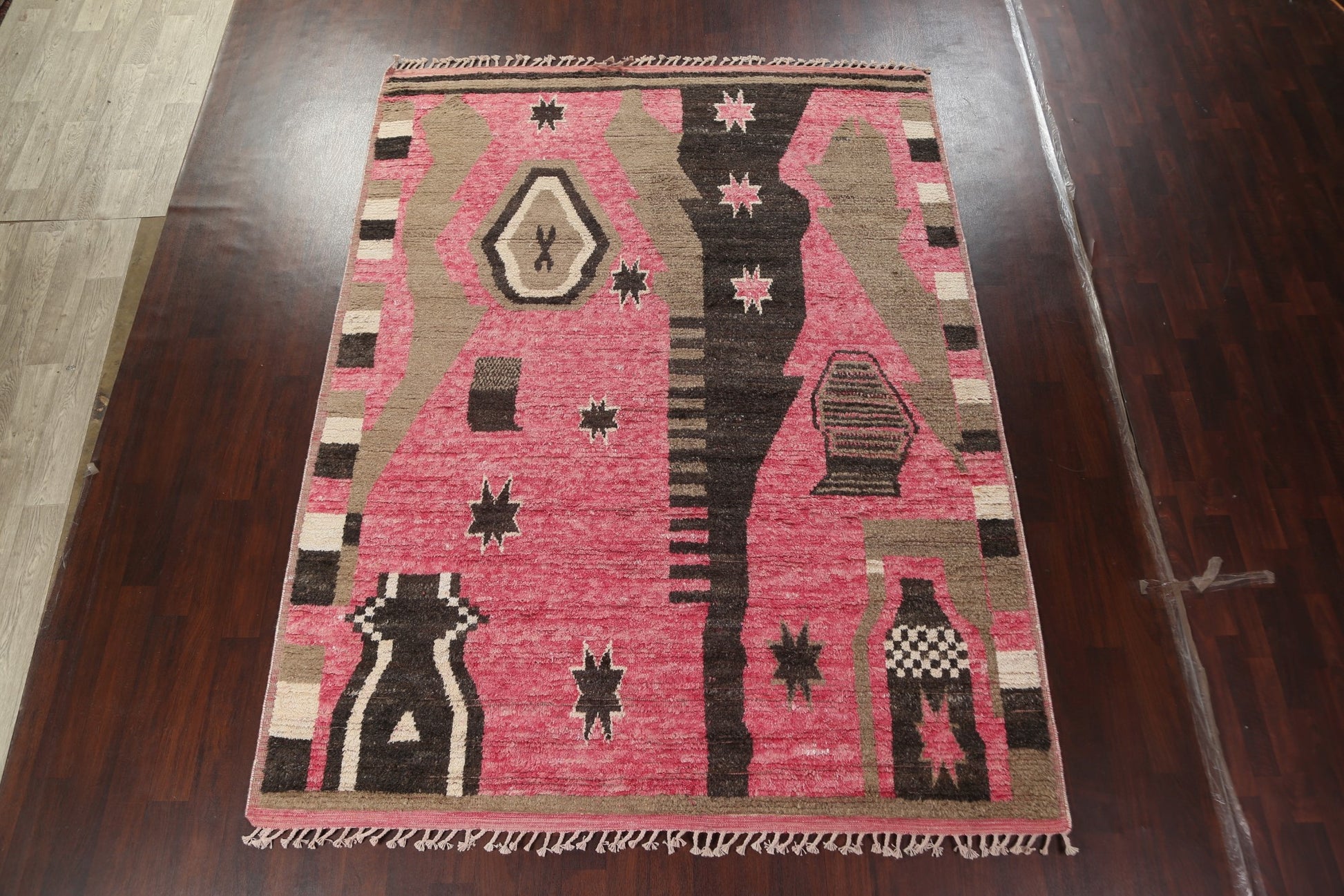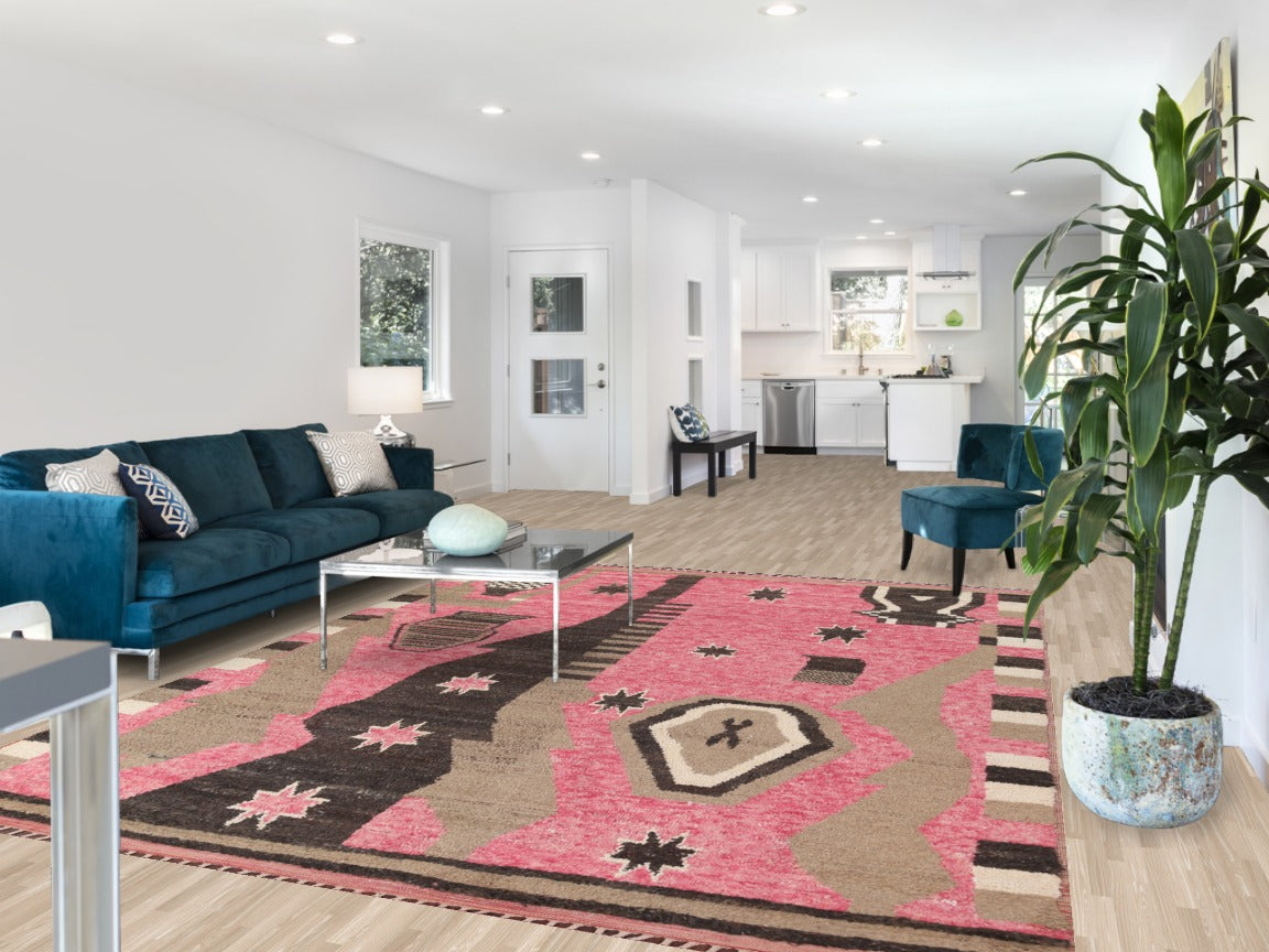 A Beautiful Genuine Morocco Moroccan rug is Hand Knotted by skillful weavers in Morocco with 100% Wool Material. This rug is in New, First Quality condition. dimensions are 10' 7'' X 8' 0'' in foot and 323 X 244 in centimeter. the primary color is Pink.