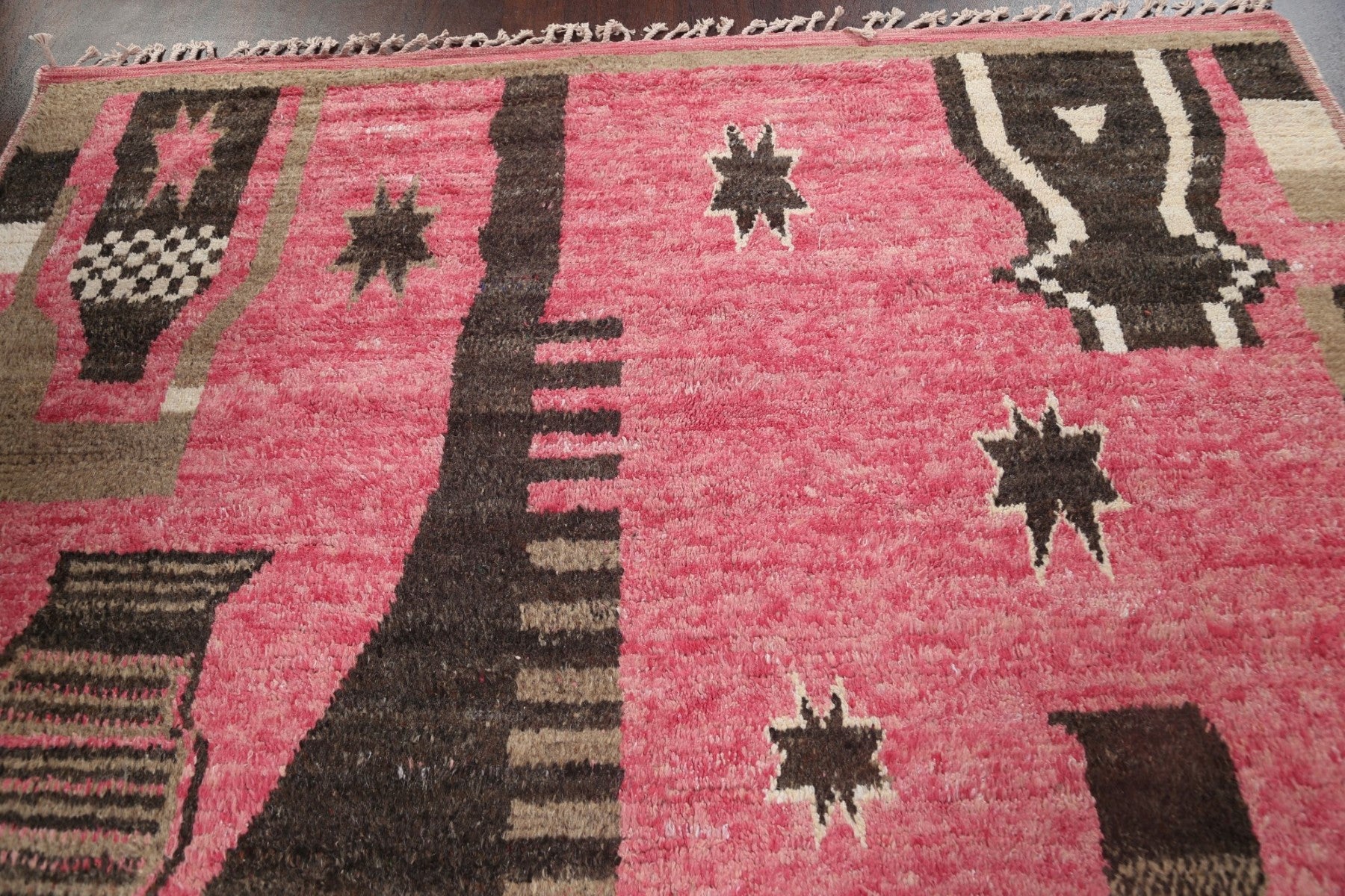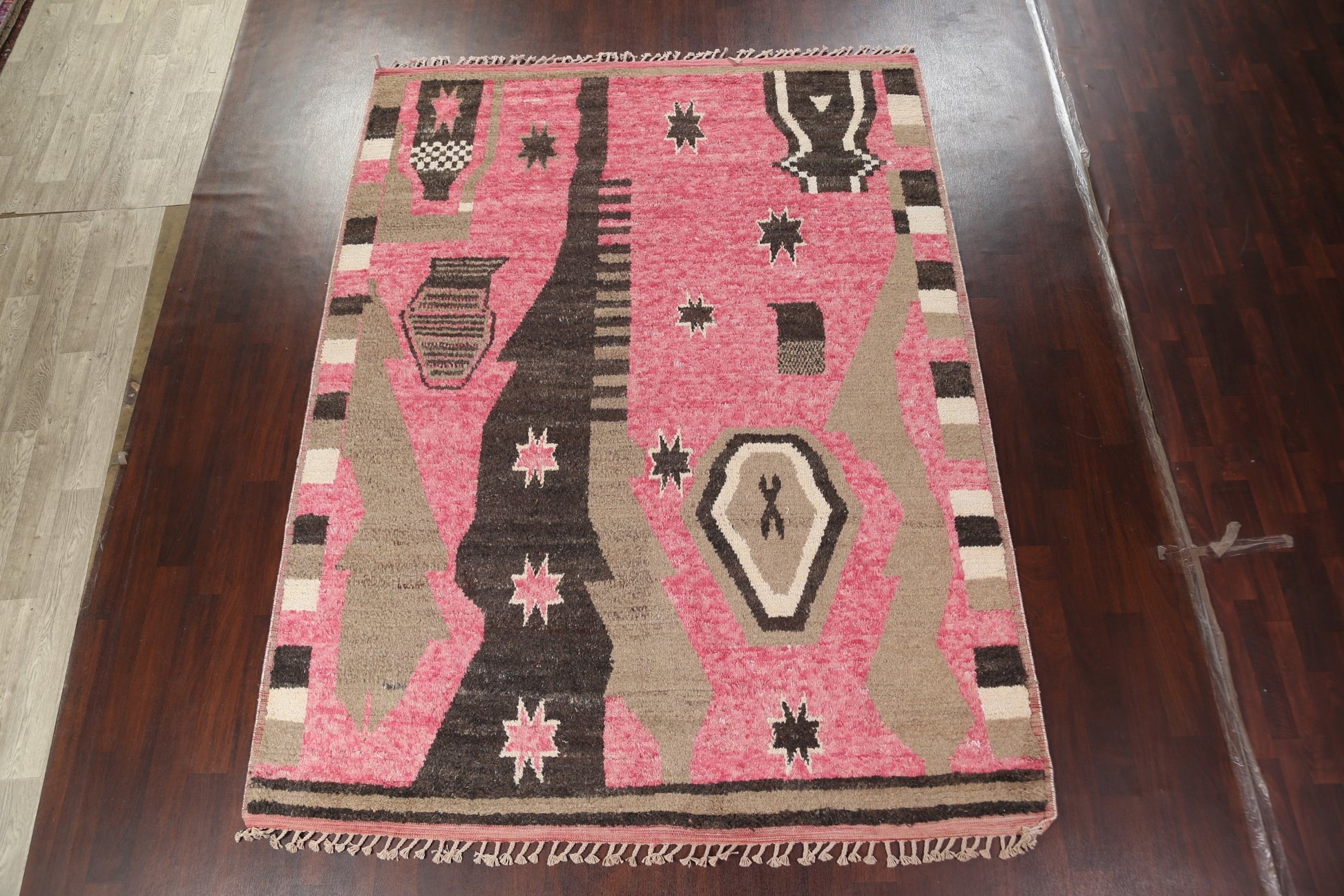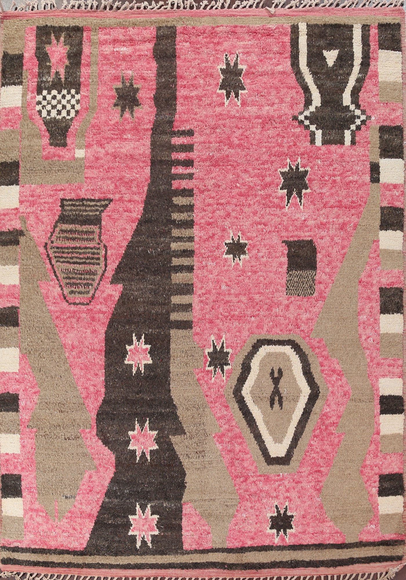A Beautiful Genuine Morocco Moroccan rug is Hand Knotted by skillful weavers in Morocco with 100% Wool Material. This rug is in New, First Quality condition. dimensions are 10' 7'' X 8' 0'' in foot and 323 X 244 in centimeter. the primary color is Pink.