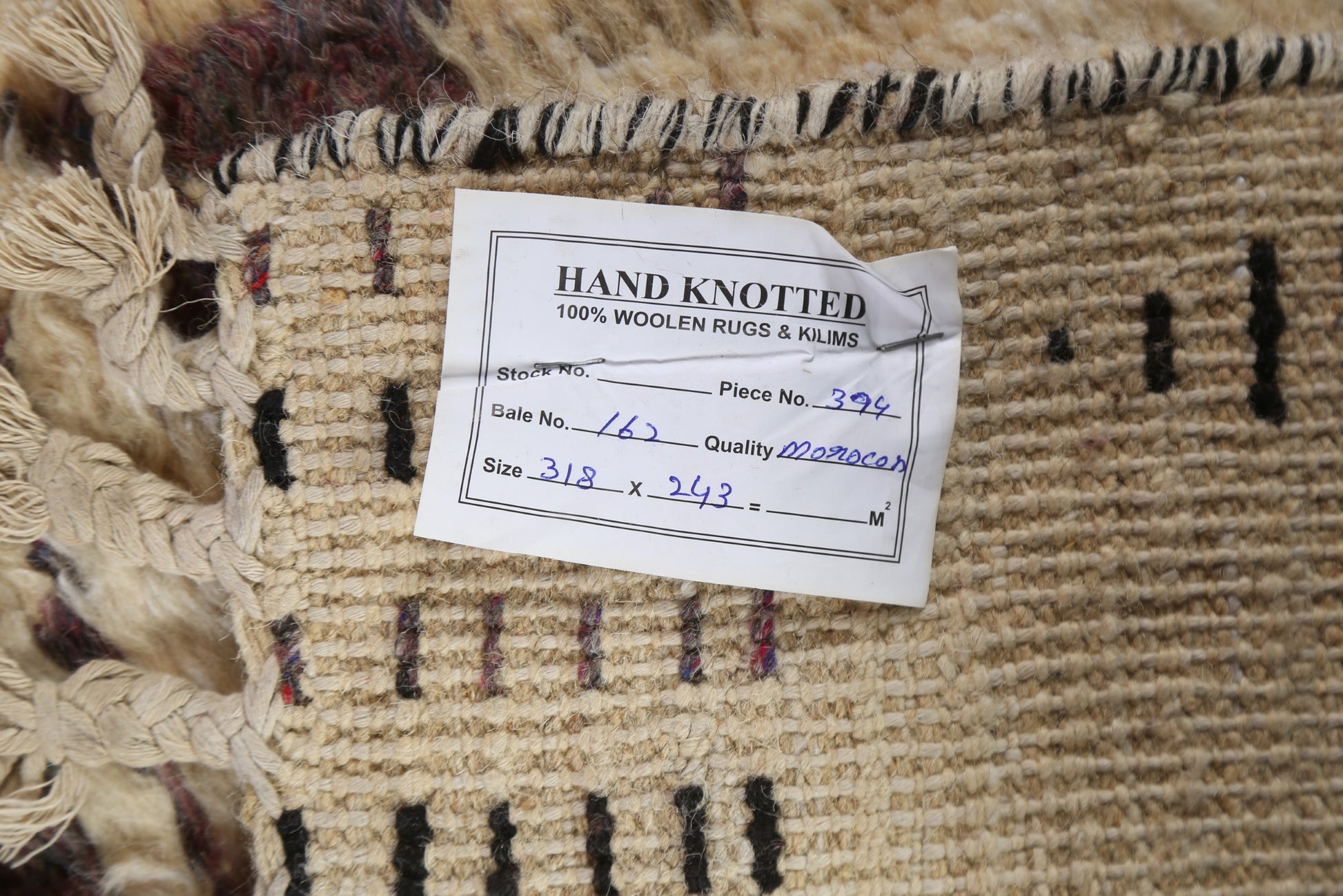 A Beautiful Genuine Morocco Moroccan rug is Hand Knotted by skillful weavers in Morocco with 100% Wool Material. This rug is in New, First Quality condition. dimensions are 10' 6'' X 8' 0'' in foot and 320 X 244 in centimeter. the primary color is Beige & Ivories.