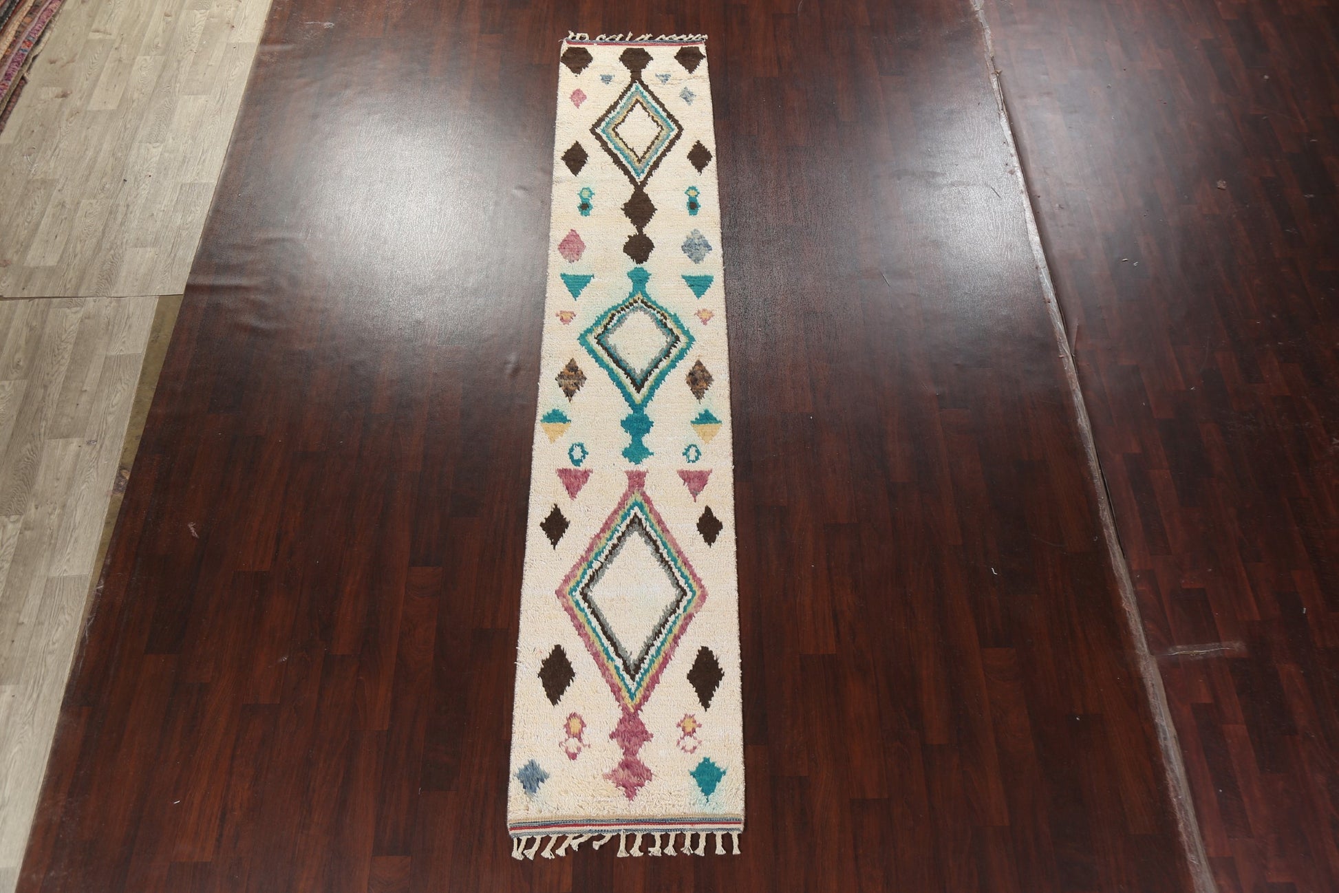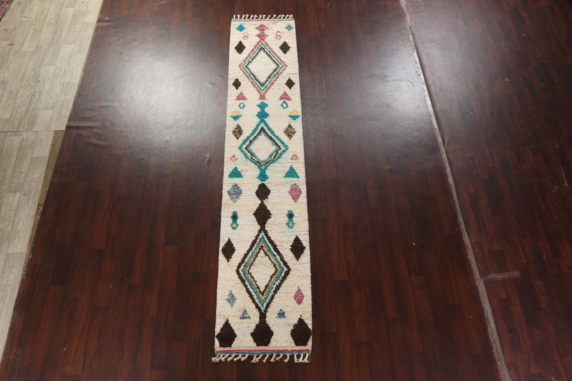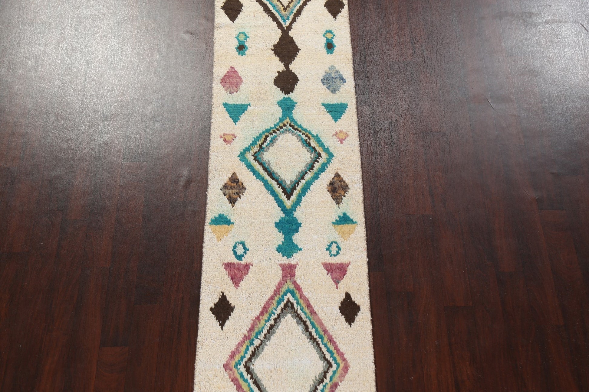 A Beautiful Genuine Morocco Moroccan rug is Hand Knotted by skillful weavers in Morocco with 100% Wool Material. This rug is in New, First Quality condition. dimensions are 12' 8'' X 2' 6'' in foot and 386 X 76 in centimeter. the primary color is Beige & Ivories.