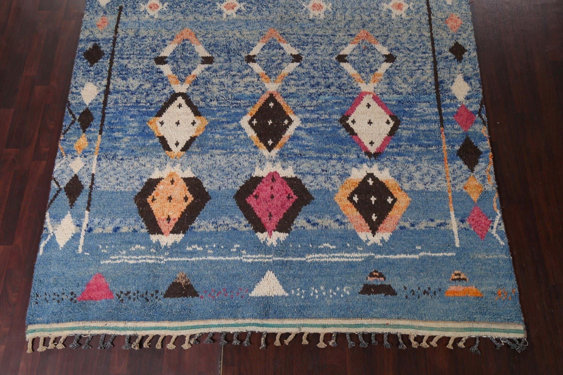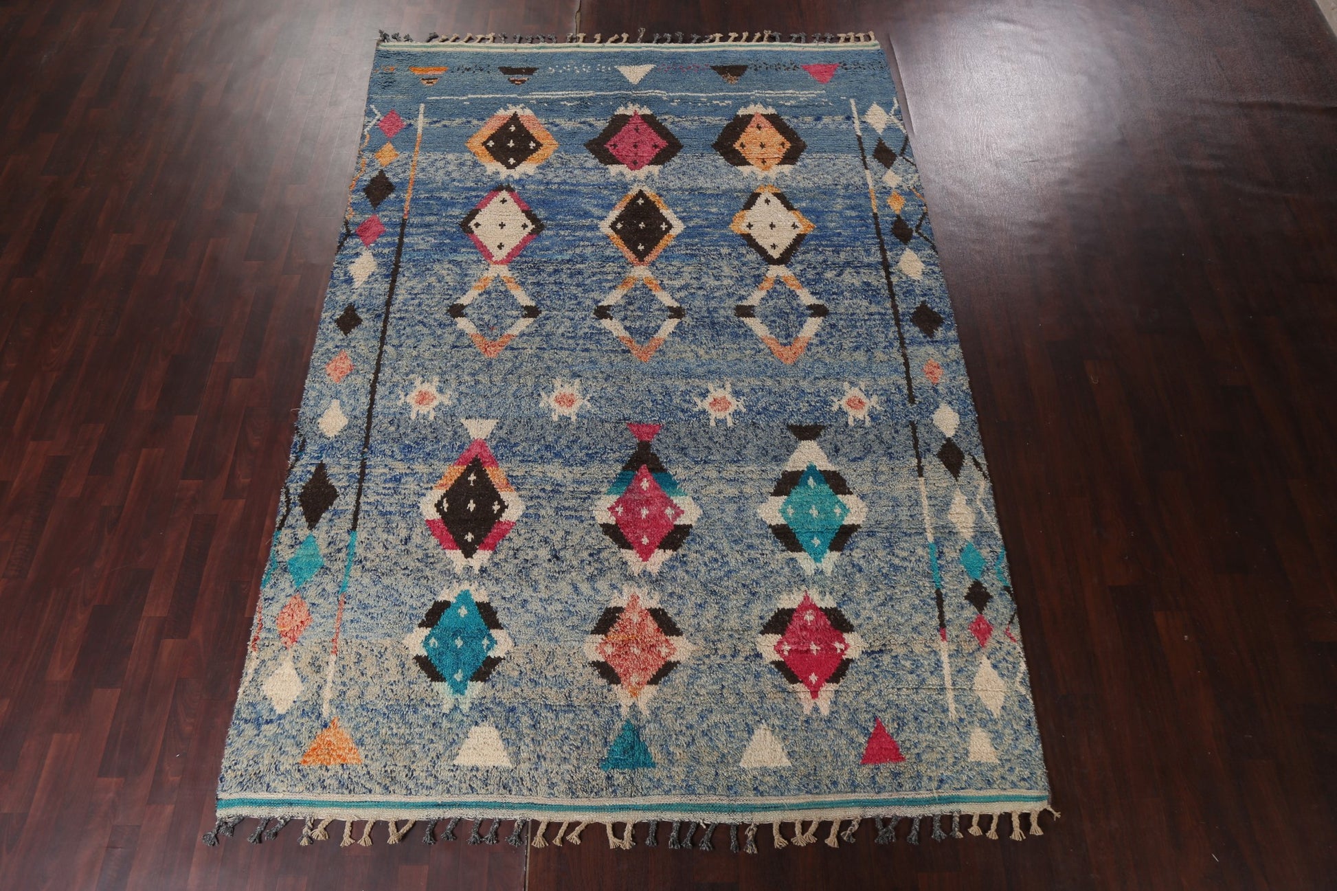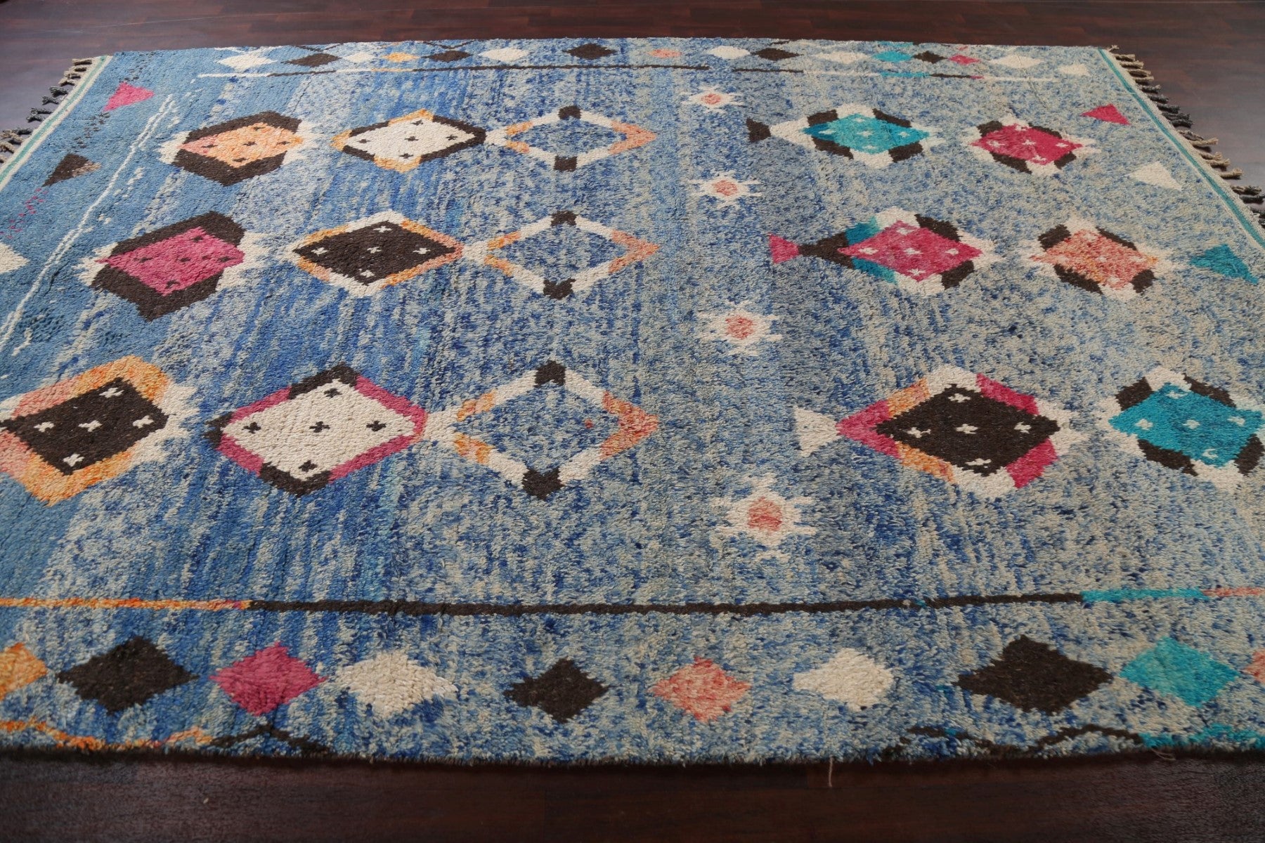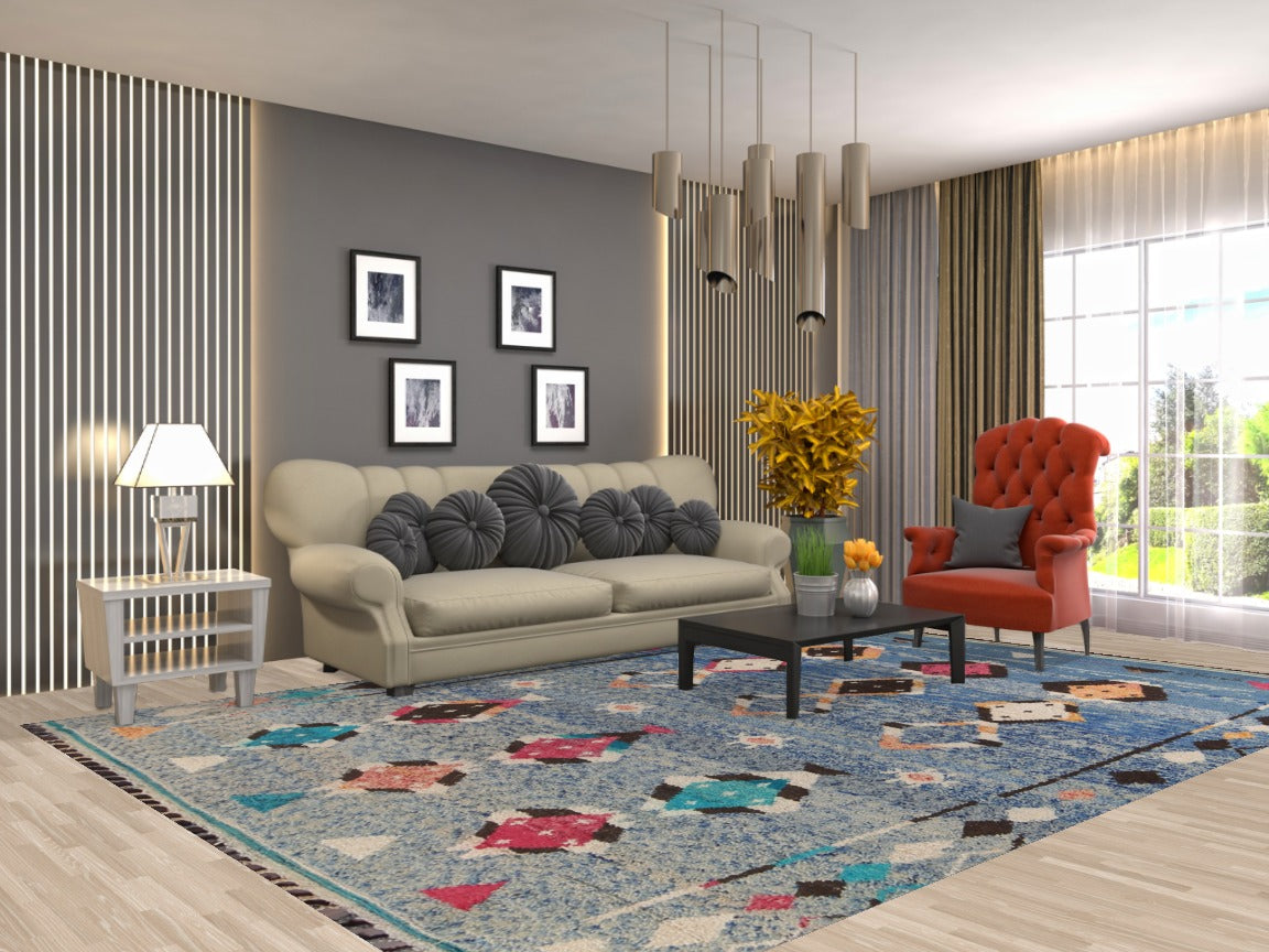 A Beautiful Genuine Morocco Moroccan rug is Hand Knotted by skillful weavers in Morocco with 100% Wool Material. This rug is in New, First Quality condition. dimensions are 11' 5'' X 7' 10'' in foot and 348 X 239 in centimeter. the primary color is Navy Blue & Blues.