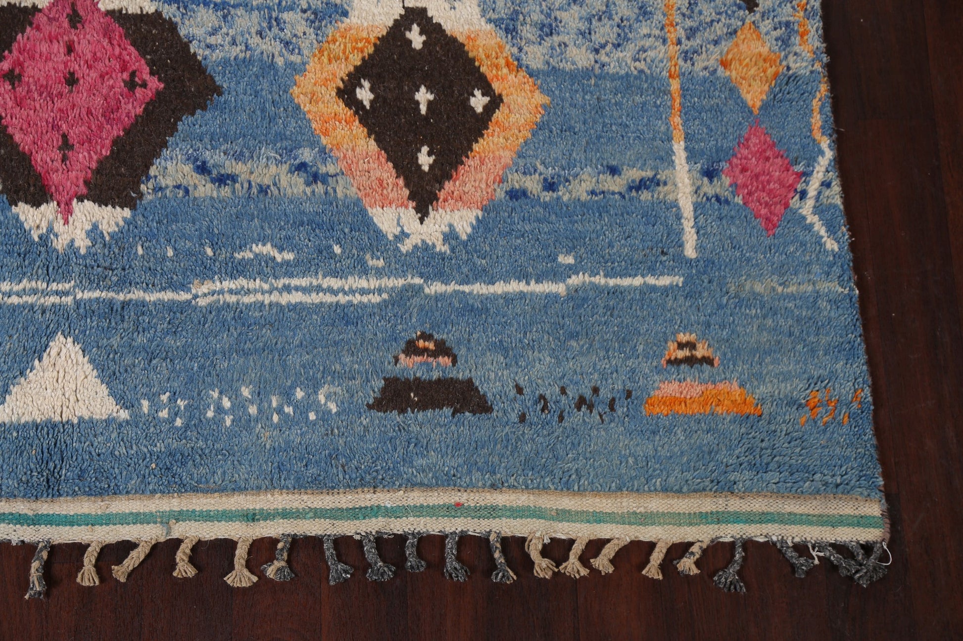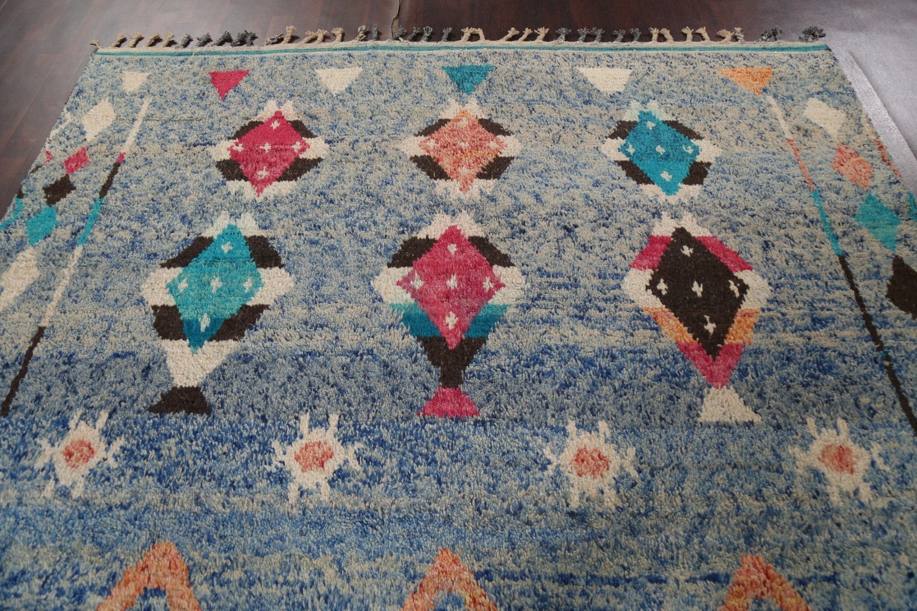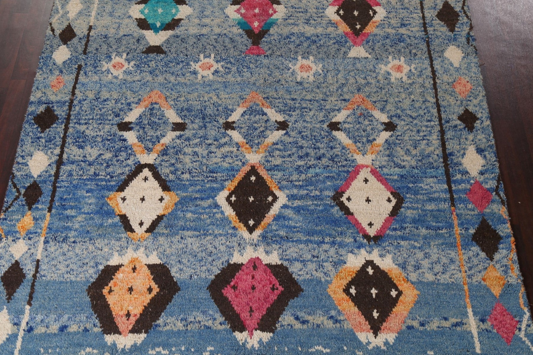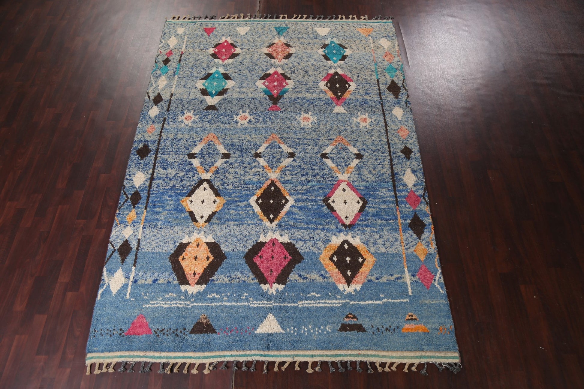 A Beautiful Genuine Morocco Moroccan rug is Hand Knotted by skillful weavers in Morocco with 100% Wool Material. This rug is in New, First Quality condition. dimensions are 11' 5'' X 7' 10'' in foot and 348 X 239 in centimeter. the primary color is Navy Blue & Blues.