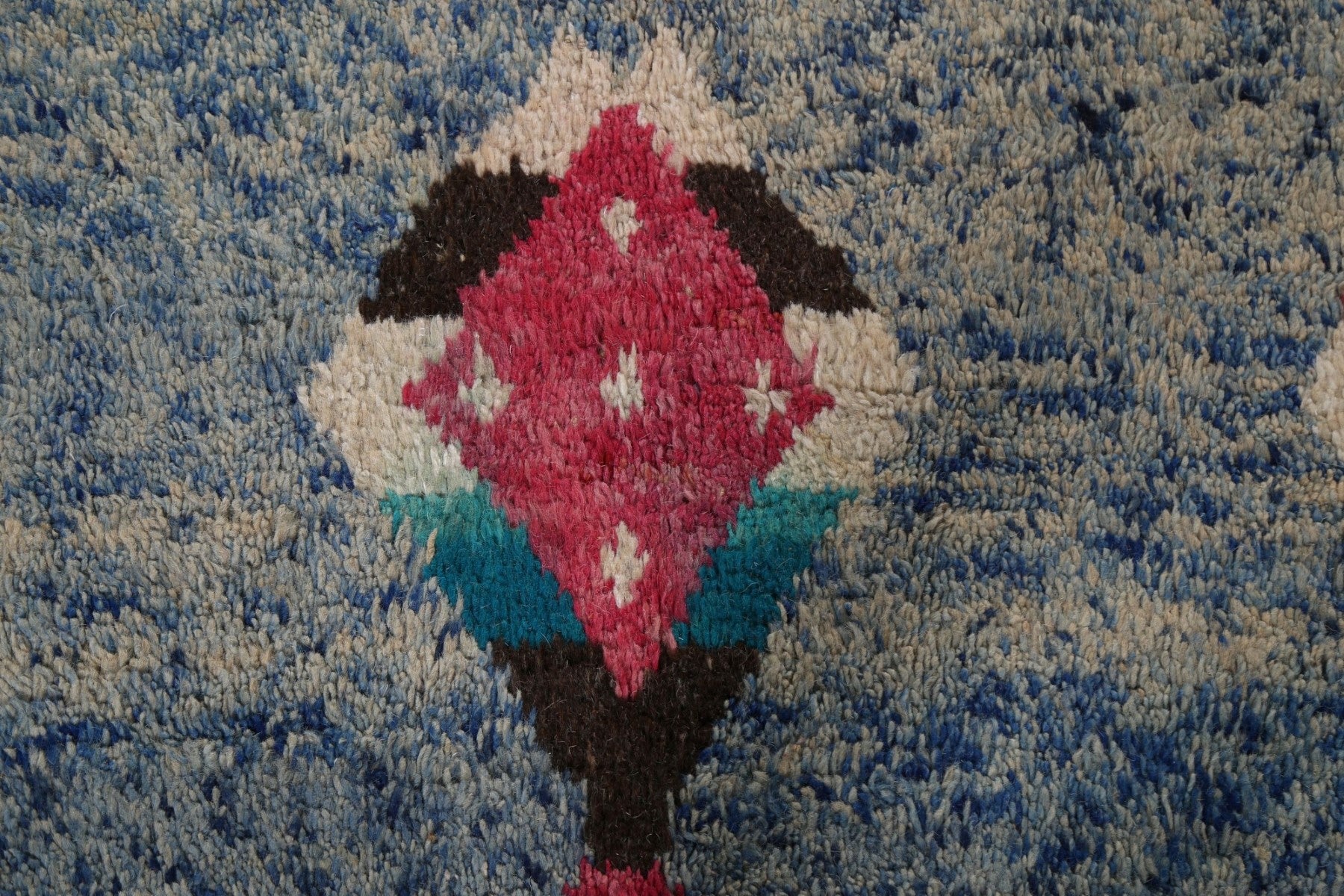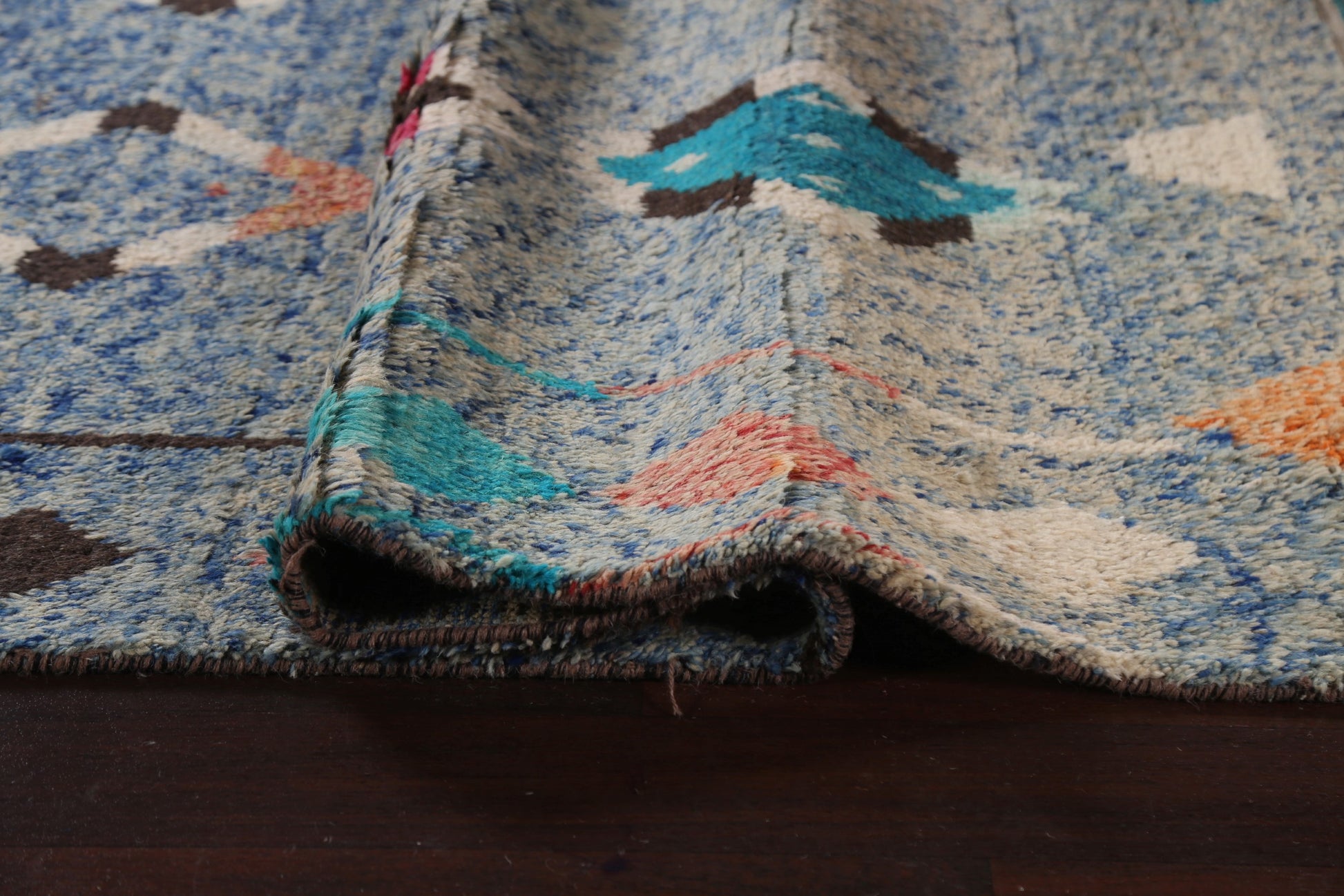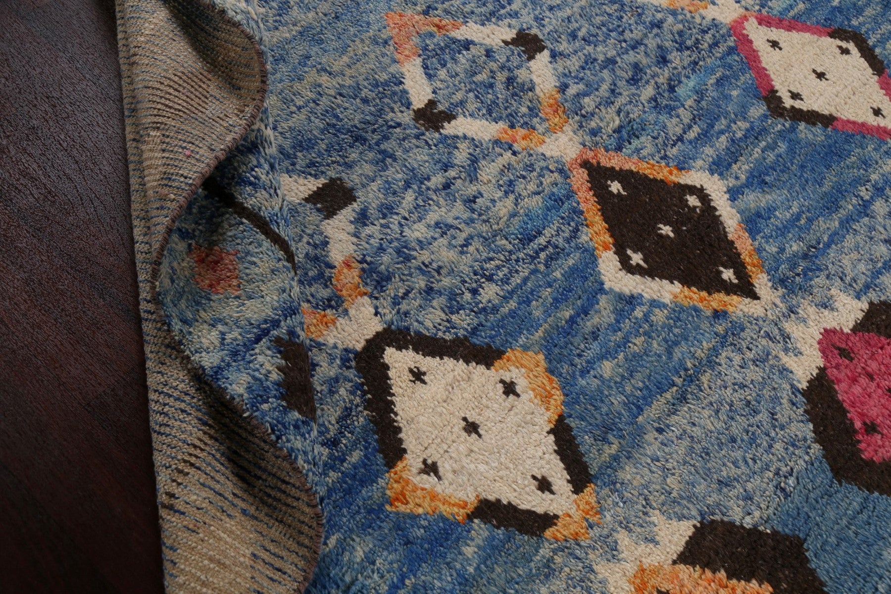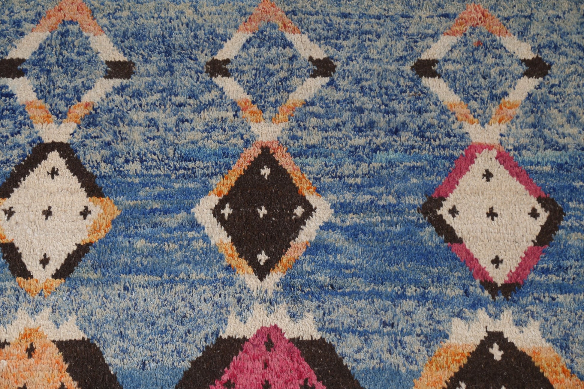 A Beautiful Genuine Morocco Moroccan rug is Hand Knotted by skillful weavers in Morocco with 100% Wool Material. This rug is in New, First Quality condition. dimensions are 11' 5'' X 7' 10'' in foot and 348 X 239 in centimeter. the primary color is Navy Blue & Blues.