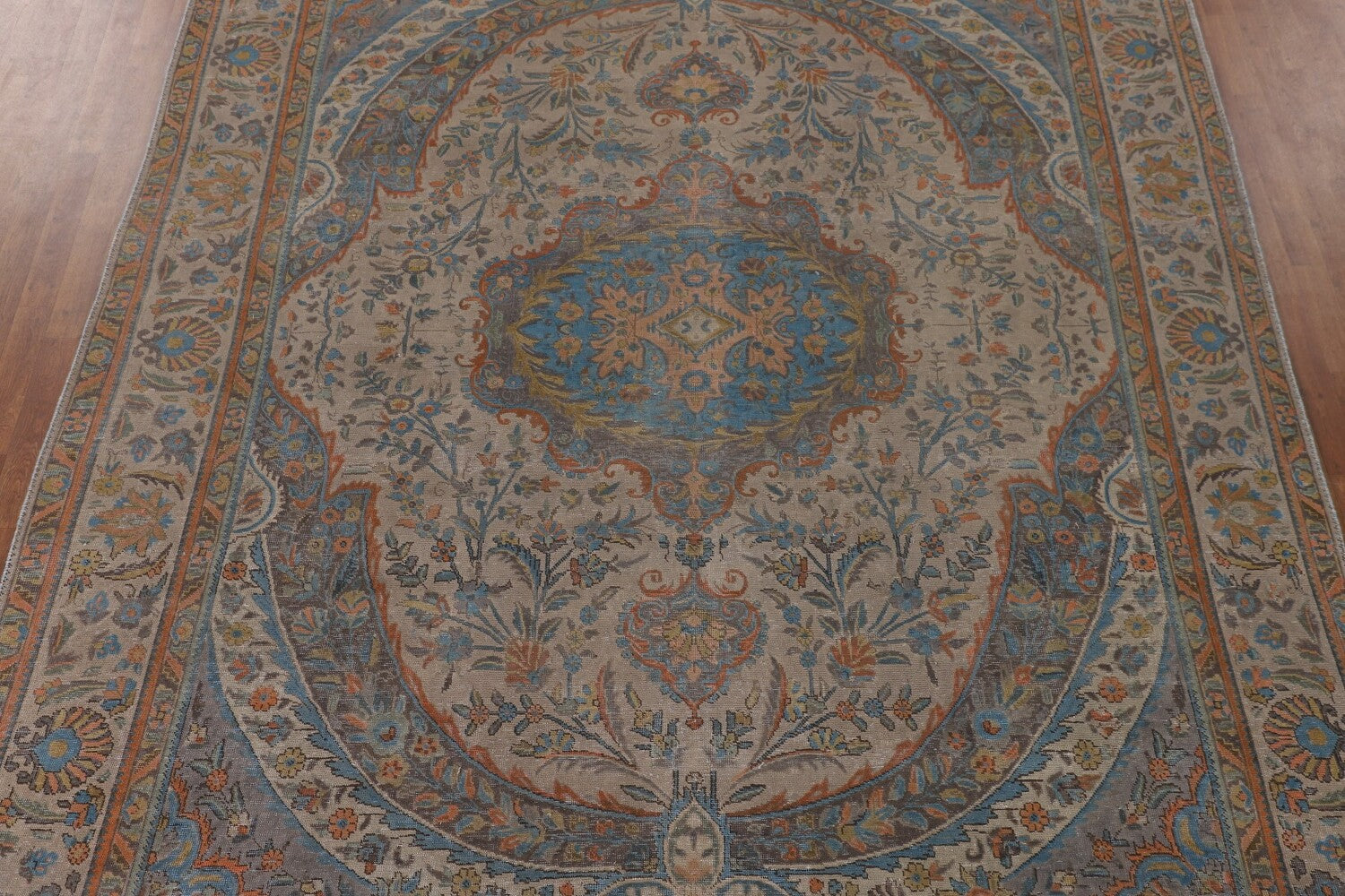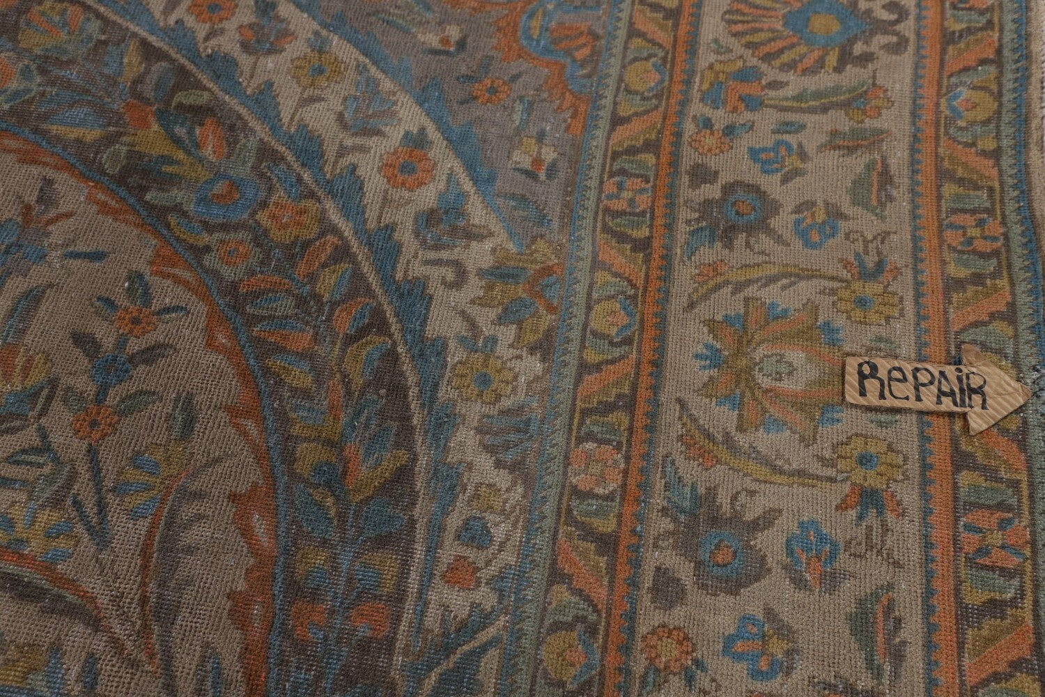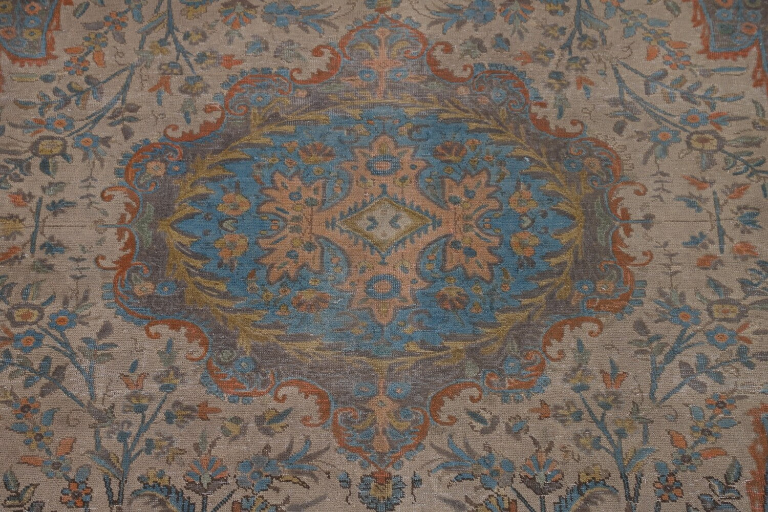 A Beautiful Genuine Persia ( Persia ) Tabriz rug is Hand Knotted by skillful weavers in Persia ( Persia ) with 100% Wool Material. This rug is in Very Good (Low Pile-Repair) condition. dimensions are 12' 10'' X 9' 7'' in foot and 391 X 292 in centimeter. the primary color is Beige & Ivories.