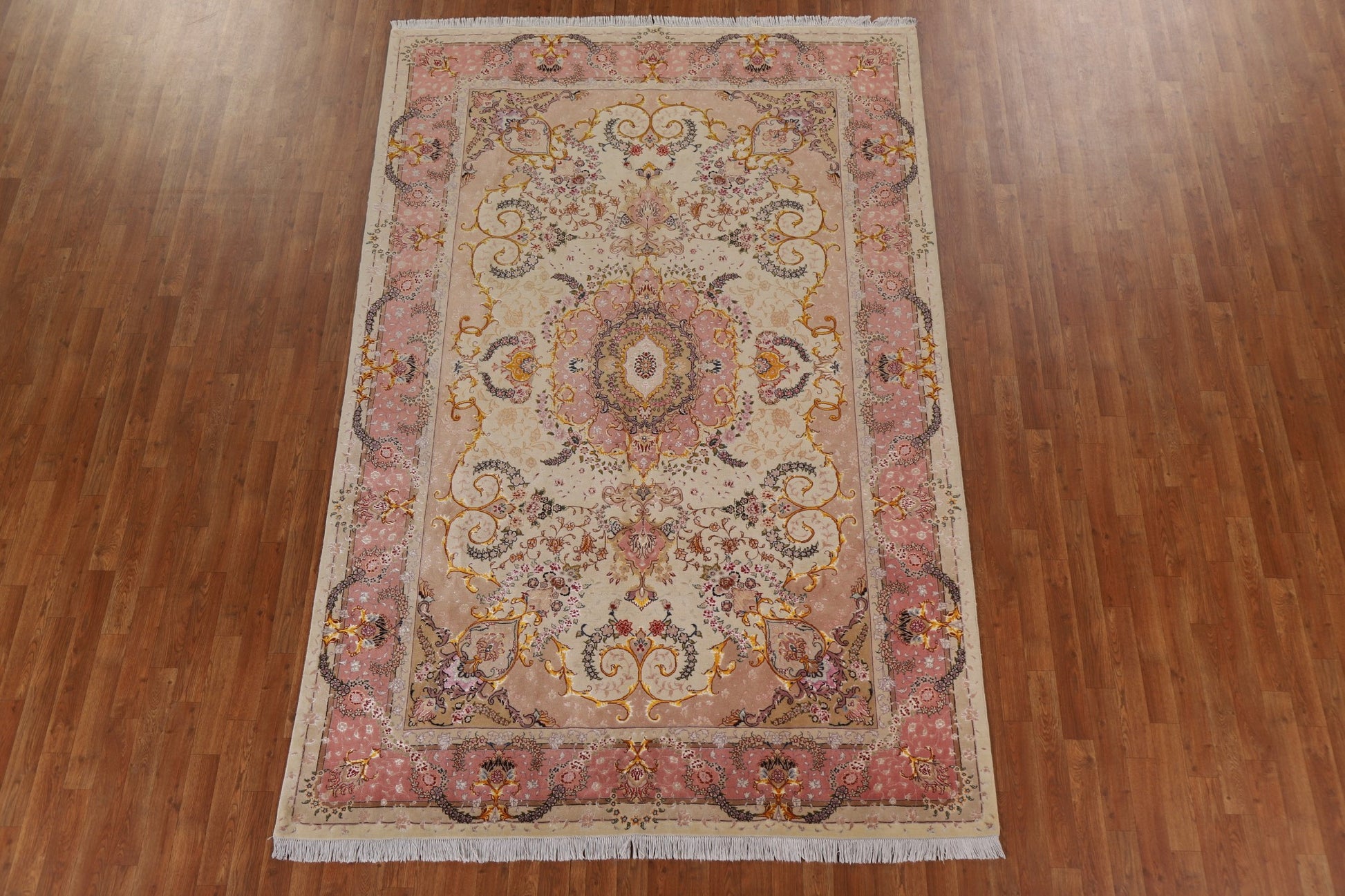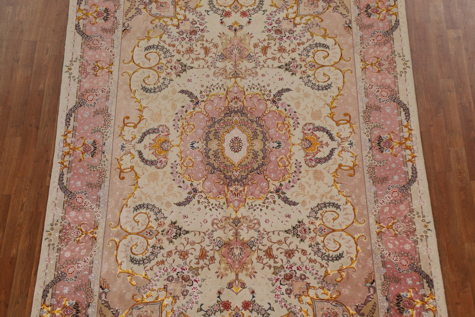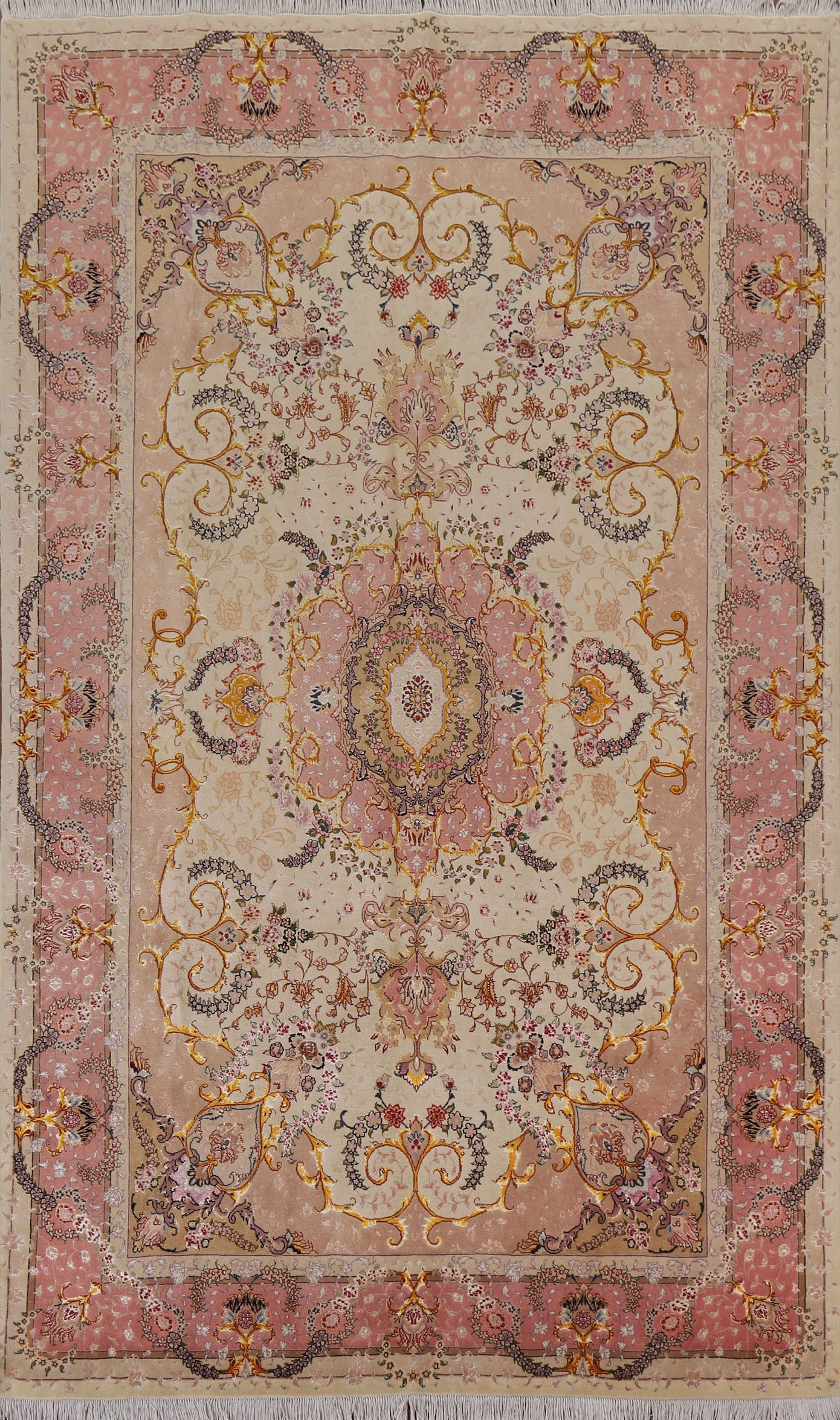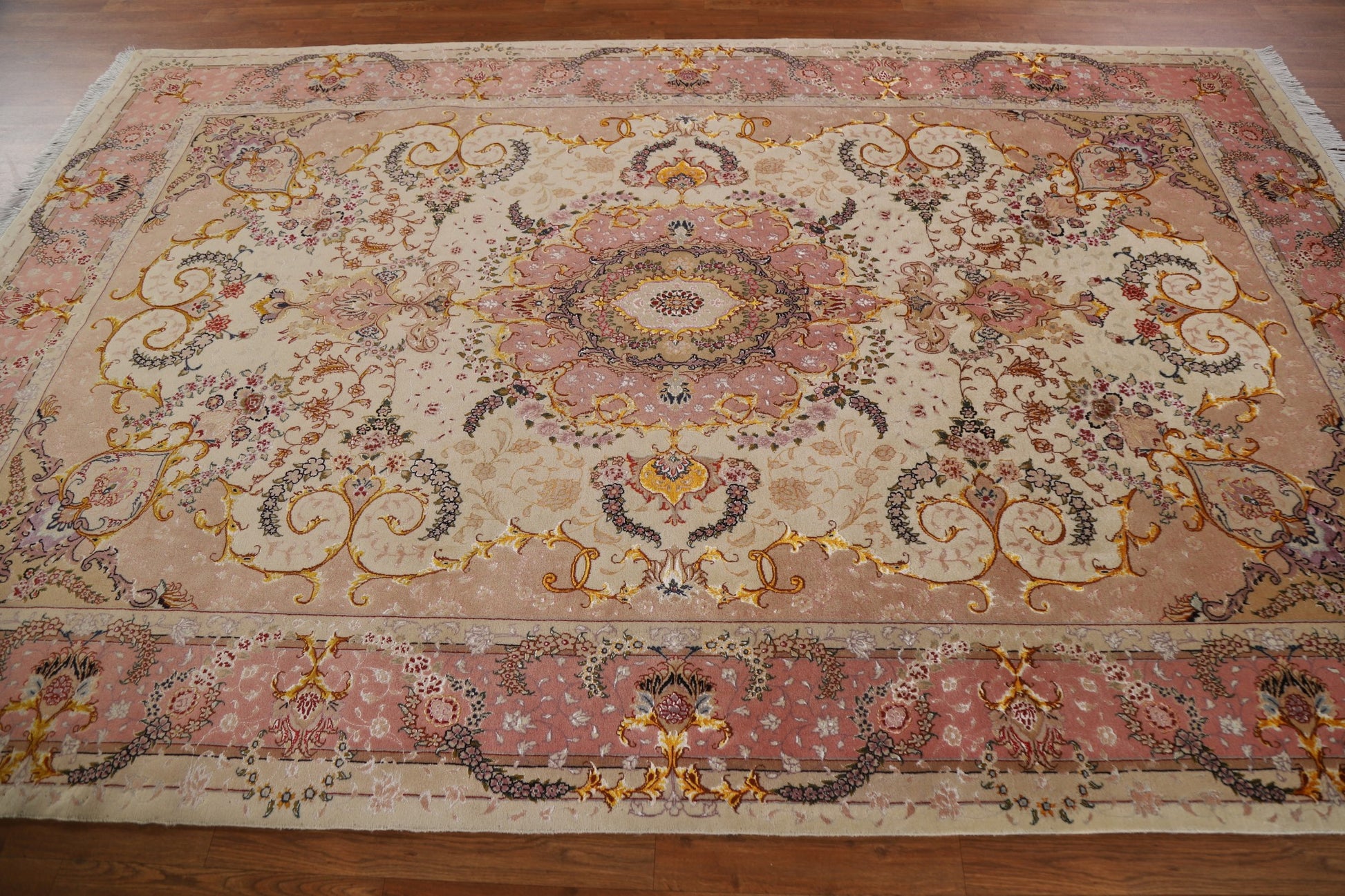 A Beautiful Genuine Persia ( Persia ) Tabriz rug is Hand Knotted by skillful weavers in Persia ( Persia ) with Wool & Silk Material. This rug is in New, First Quality condition. dimensions are 9' 11'' X 6' 6'' in foot and 302 X 198 in centimeter. the primary color is Beige & Ivories.