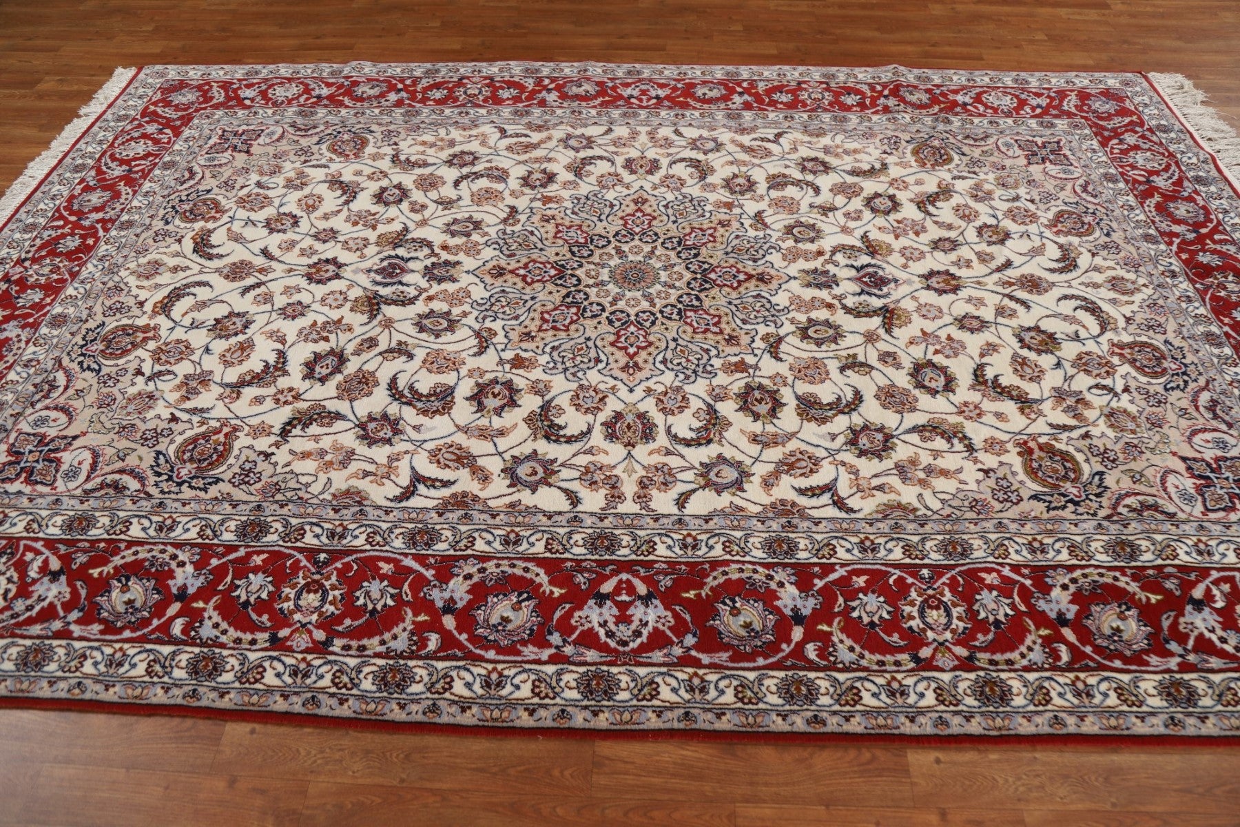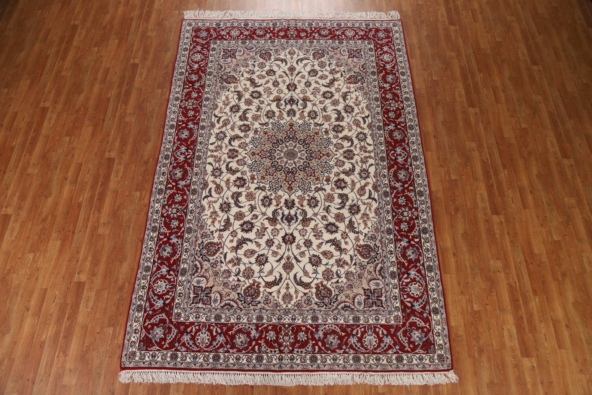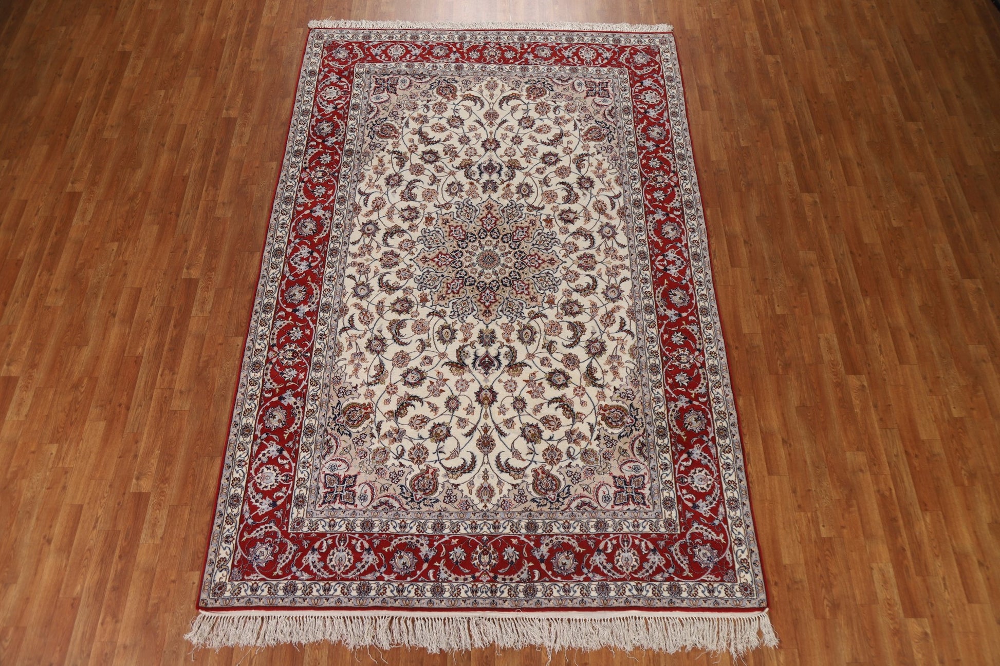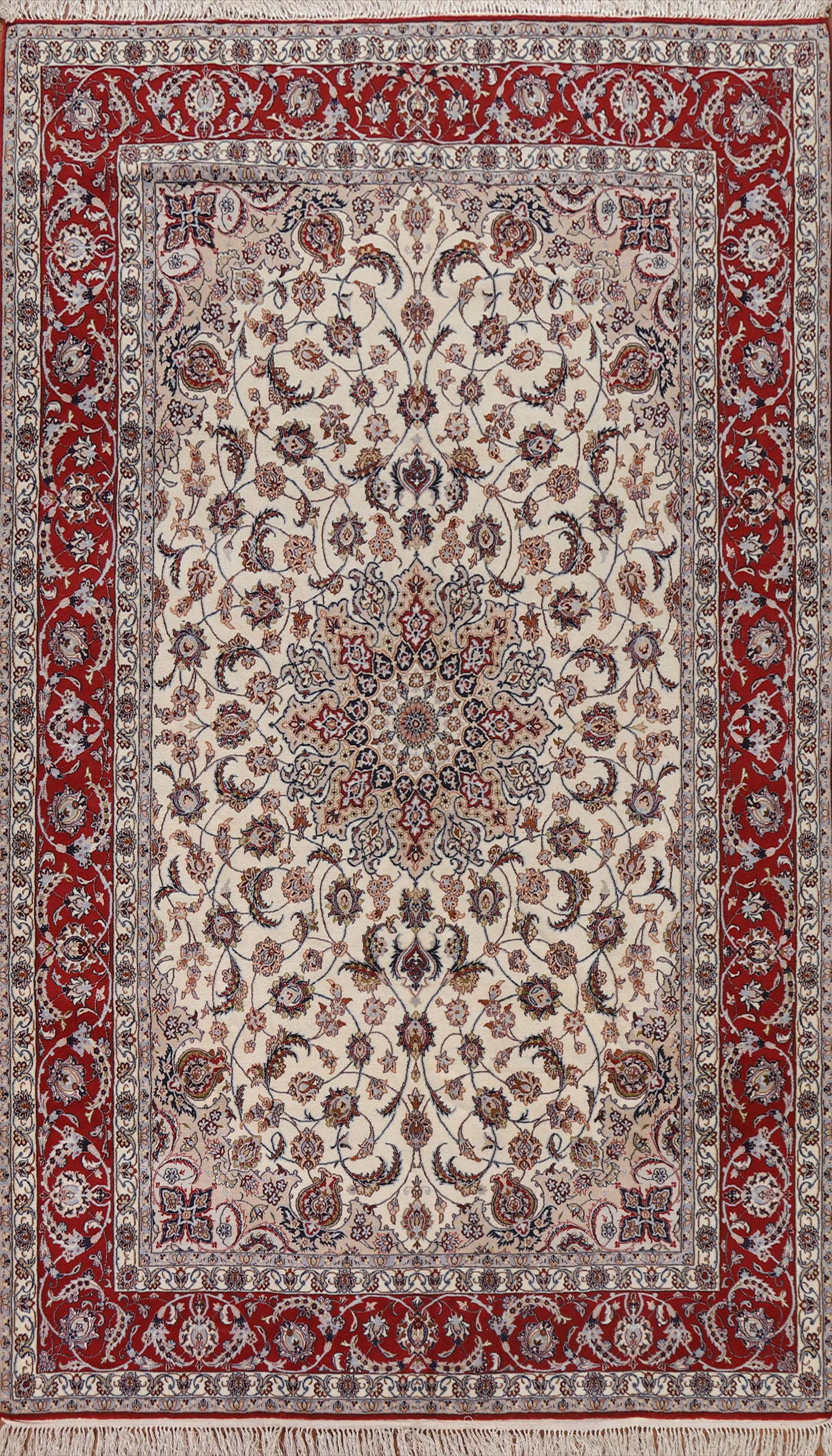 A Beautiful Genuine Persia ( Persia ) Isfahan rug is Hand Knotted by skillful weavers in Persia ( Persia ) with Wool & Silk Material. This rug is in condition. dimensions are 10' 4'' X 6' 10'' in foot and 315 X 208 in centimeter. the primary color is Beige & Ivories.