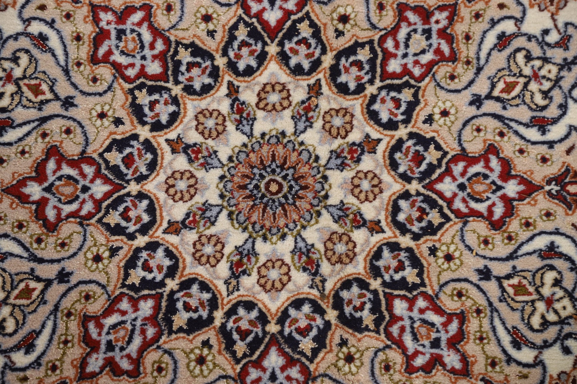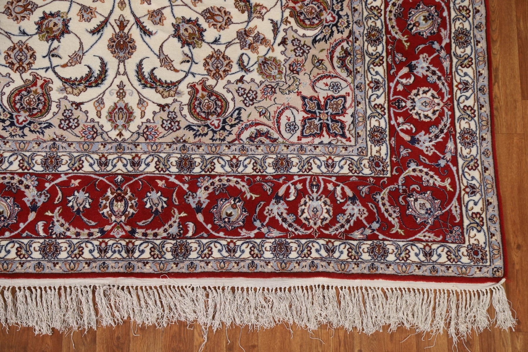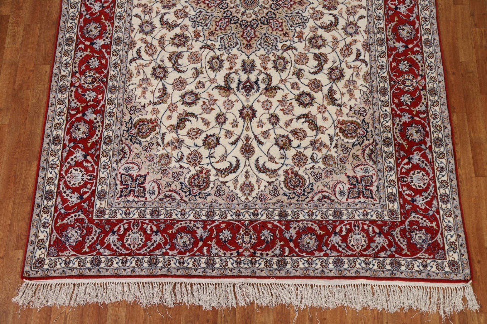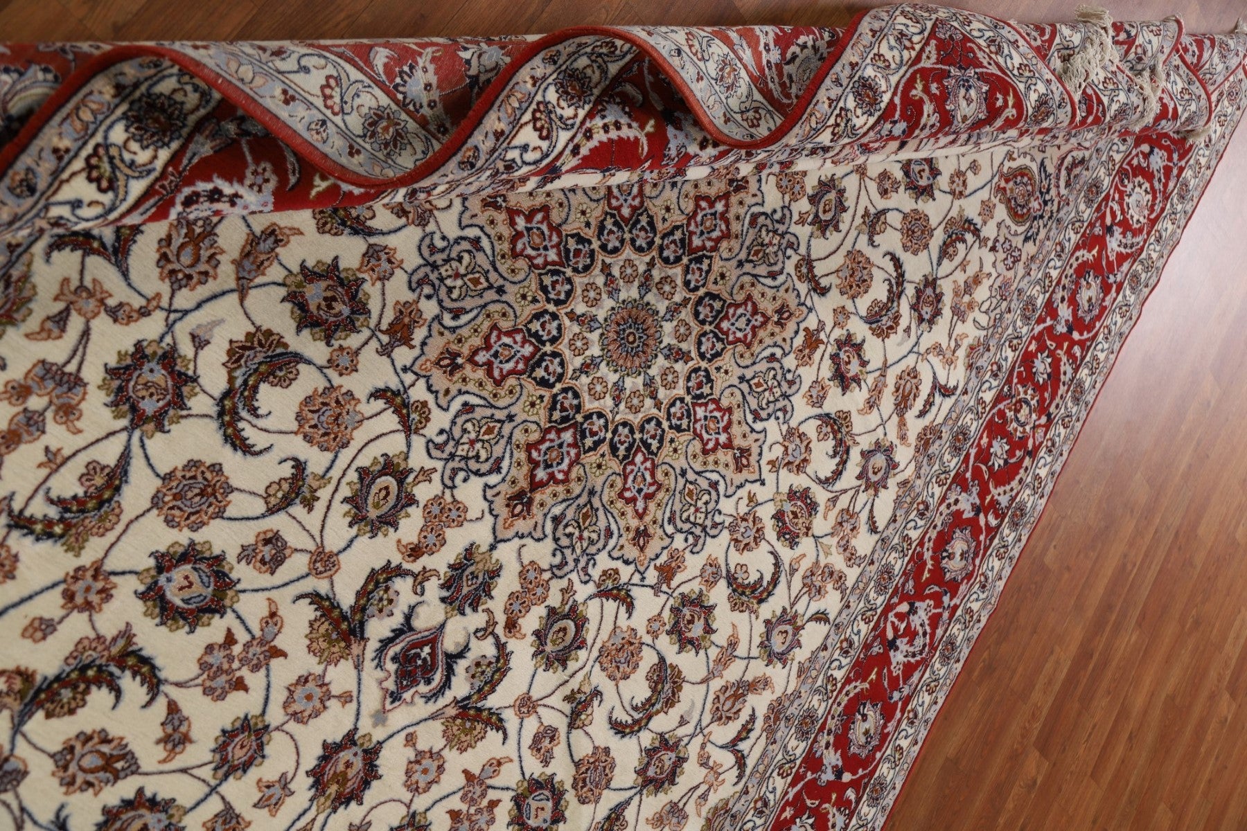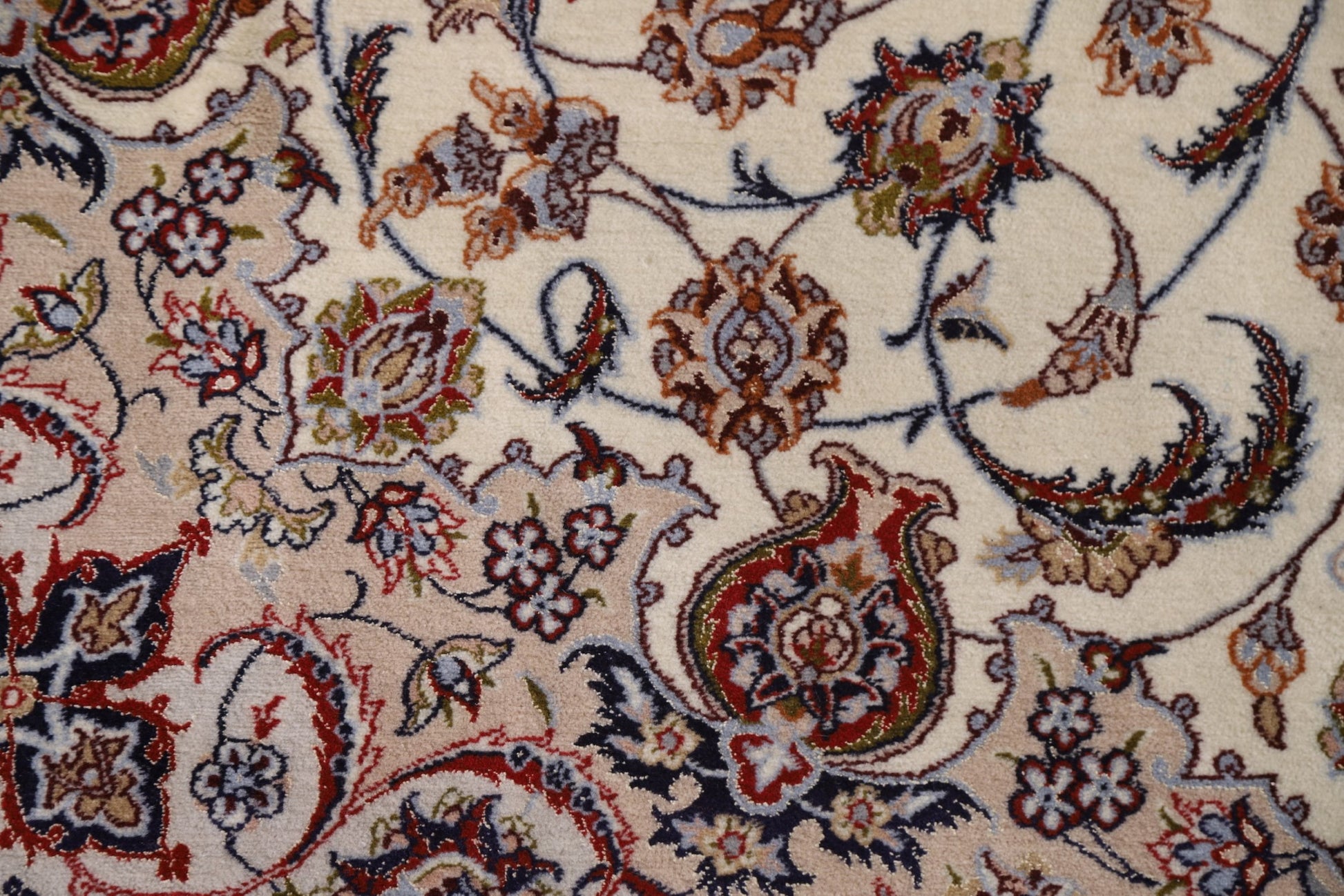A Beautiful Genuine Persia ( Persia ) Isfahan rug is Hand Knotted by skillful weavers in Persia ( Persia ) with Wool & Silk Material. This rug is in condition. dimensions are 10' 4'' X 6' 10'' in foot and 315 X 208 in centimeter. the primary color is Beige & Ivories.