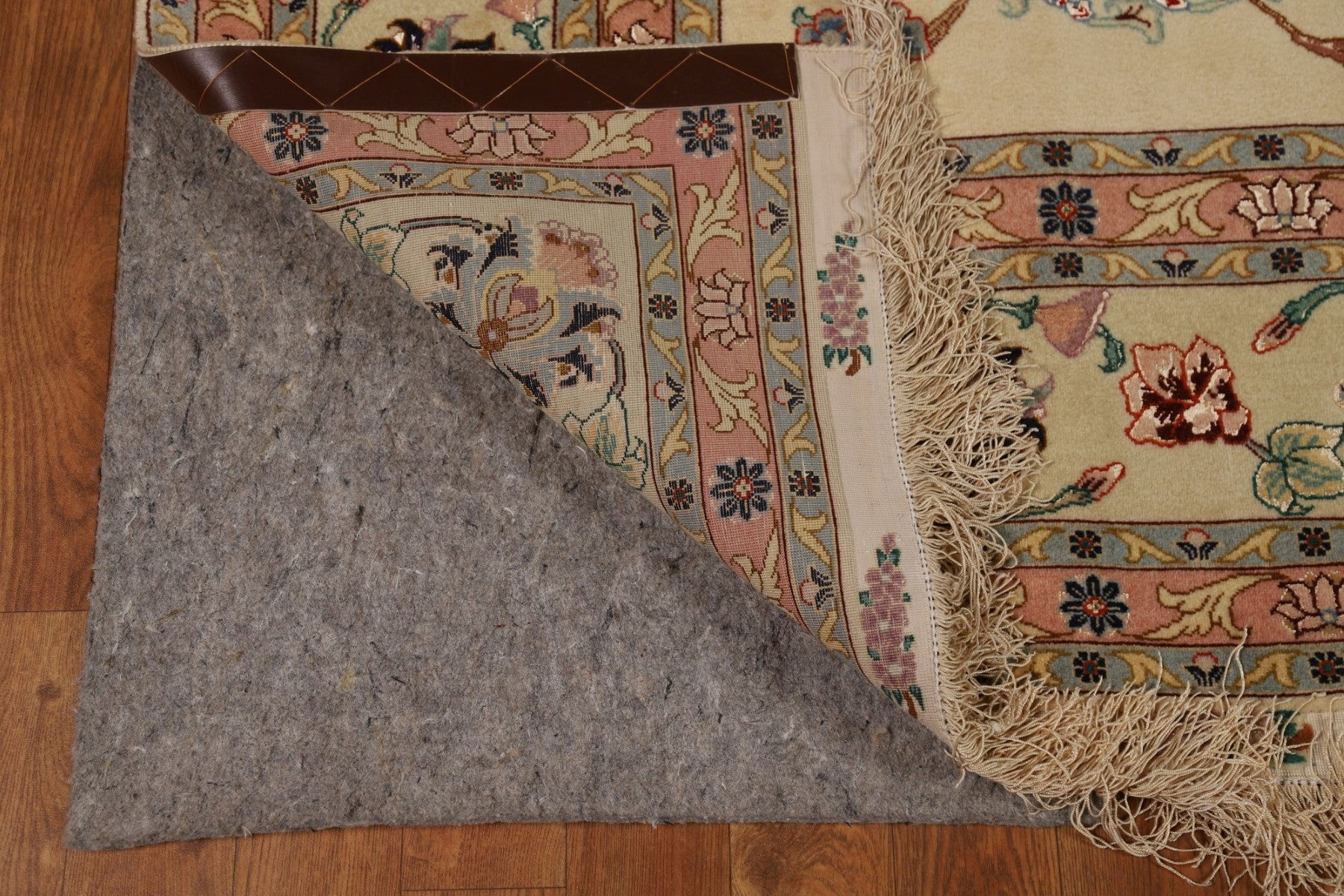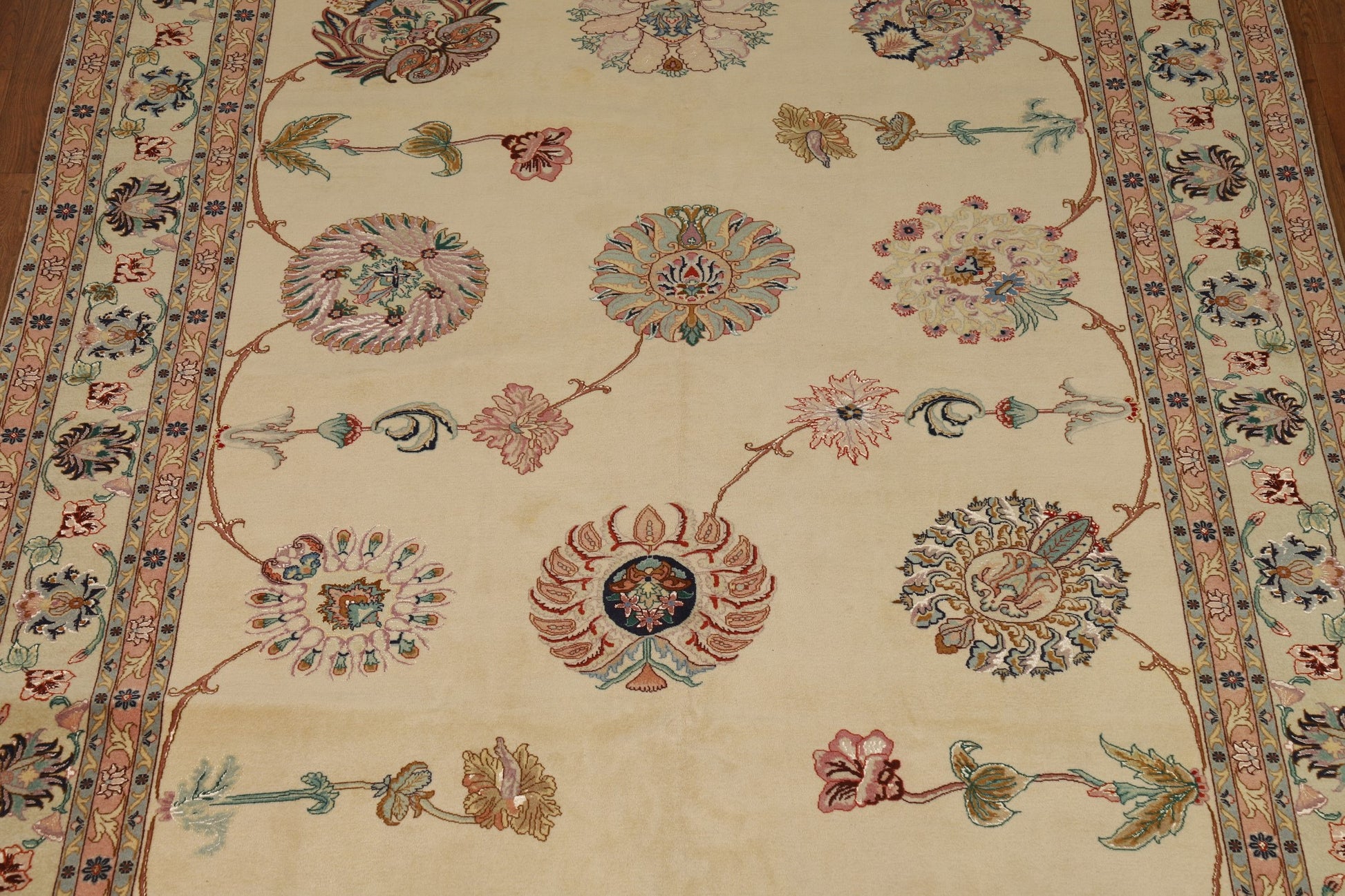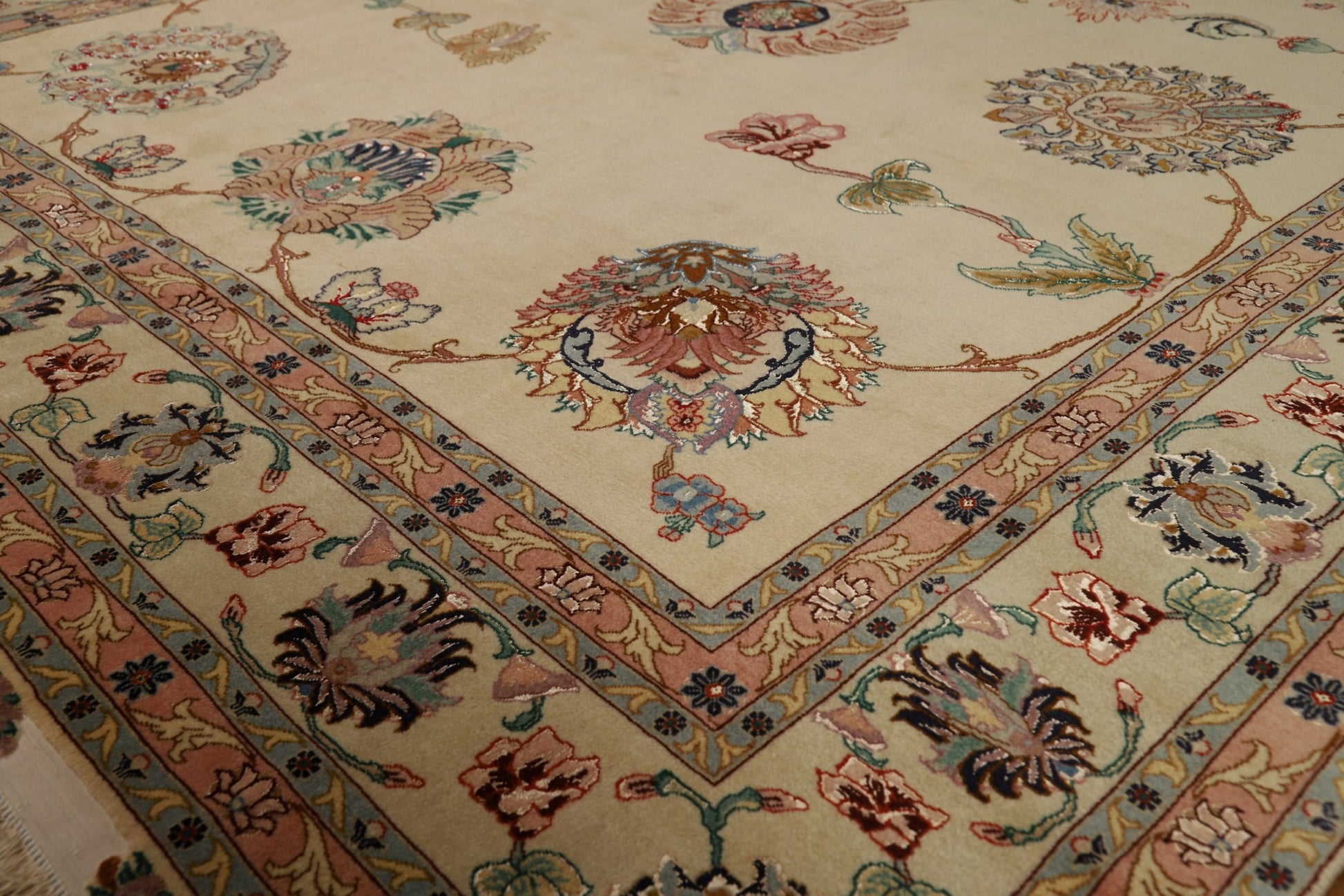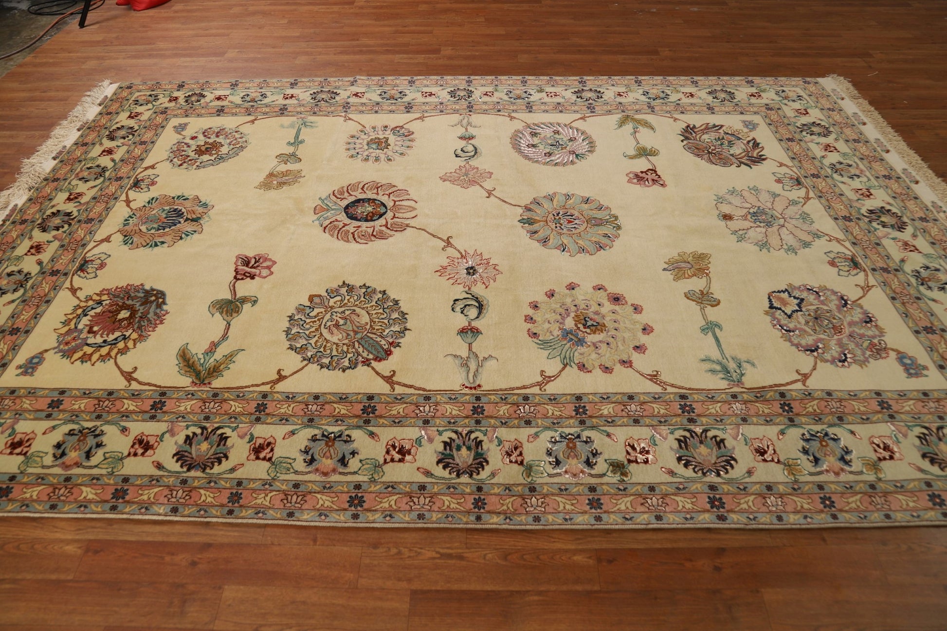 A Beautiful Genuine Persia ( Persia ) Tabriz rug is Hand Knotted by skillful weavers in Persia ( Persia ) with Wool & Silk Material. This rug is in New, First Quality condition. dimensions are 10' 1'' X 6' 8'' in foot and 307 X 203 in centimeter. the primary color is Beige & Ivories.